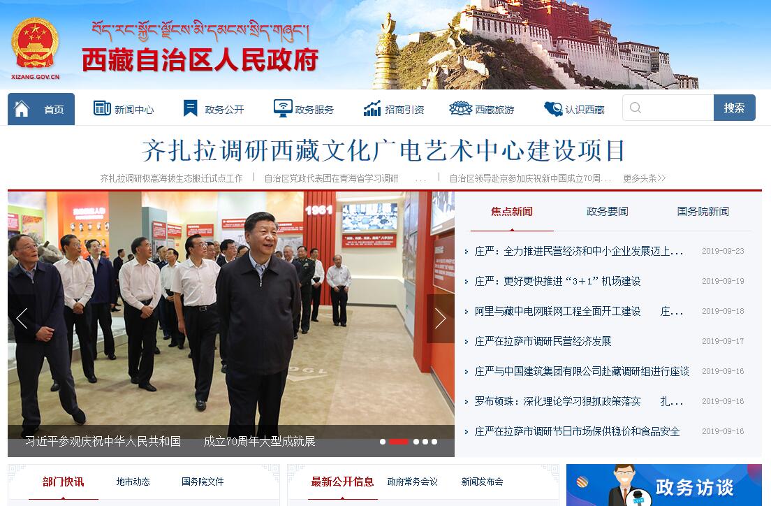 西藏自治区人民政府门户网站(http://www.xizang.gov.cn)由西藏自治区人民政府主办。是展示西藏形象宣传自治区党和政府方针、政策的窗口,是一座沟通政府与社会各界的桥梁,是自治区政府各部门、直属机构信息发布的总平台。西藏自治区人民政府门户网站于2007年开通上线。欢迎广大公众对本网站建设积极献计献策,提出宝贵意见和建议。西藏,简称“藏”。西藏自治区(藏文:བོད་རང་སྐྱོང་ལྗོངས།,藏语拼音:Poi Ranggyong Jong,威利转写:Bod rang skyong ljongs),首府拉萨市,位于中华人民共和国西南边陲,是中国五个少数民族自治区之一。西藏位于青藏高原西南部,地处北纬26°50′至36°53′,东经78°25′至99°06′之间,平均海拔在4000米以上,素有“世界屋脊”之称。全区面积120.2189万平方千米,约占全国总面积的1/8,在全国各省、市、自治区中仅次于新疆。2014年末常住人口约317.55万人。西藏北邻新疆,东接四川,东北紧靠青海,东南连接云南;周边与缅甸、印度、不丹、尼泊尔、克什米尔等国家及地区接壤,陆地国界线4000多公里,是中国西南边陲的重要门户。西藏是中国领土不可分割的一部分。自元朝始,中央政权始终对西藏行使着有效管辖。藏族人民是中华民族大家庭中的重要一员。西藏唐宋时期称为“吐蕃”,元明时期称为“乌斯藏”,清代称为“唐古特”、“图伯特”等。清朝康熙年间起称“西藏”至今。1951年5月23日,西藏和平解放。1959年西藏叛乱平定后,中央政府开始对西藏进行全面直接管辖。1965年9月9日,西藏自治区正式宣告成立。西藏以其雄伟壮观、神奇瑰丽的自然风光闻名。它地域辽阔,地貌壮观、资源丰富。自古以来,这片土地上的人们创造了丰富灿烂的民族文化。