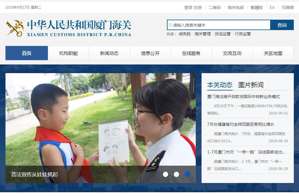 厦门海关始设于1684年,至今已有330年的历史。目前下辖17个内设部门(1个副厅级、16个正处级),7个隶属海关(1个副厅级,6个正处级),6个正处级派驻机构,6个正处级缉私分局,3个事业单位(数据分中心、后勤管理中心、培训基地)。在编干部职工1968人(关员1598人、警员319人、老工人51人),离退休人员373人。厦门关区地处海峡西岸中心区域和对台工作前沿,管辖范围包括厦门、漳州、泉州和龙岩4地市,总面积4.42万平方公里,海岸线长1474公里。关区主要有三个突出特点:一是开放型经济发展水平较高。关区现有2个空港口岸、3个海港口岸和17个开放港区;有各类监管场所78个,进出口总值约占福建省近8成。二是业务门类齐全。关区海、陆、空、邮、加贸等监管业务一应俱全,设有保税港区、保税区、出口加工区、保税物流园区等海关特殊监管区域4处、陆地港2处。此外,邮轮监管、飞机维修监管等业务也颇具规模。三是对台特色鲜明。厦门市是全国唯一的对台海运快件试点城市,是全国最大的台湾水果进口集散地,大嶝对台小额商品交易市场为全国首家,厦金、泉金直航“小三通”已成为两岸交流往来的“黄金通道”,厦金建立了邮包总直封关系,对台交流交往进一步密切,关区对台监管业务发展迅猛。十三届全国人大一次会议审议通过的《国务院机构改革方案》明确“原国家质量监督检验检疫总局的出入境检验检疫管理职责和队伍划入海关总署”,目前关区转隶工作已完成,机构职能、组织机构相关信息待新“三定”方案后更新。