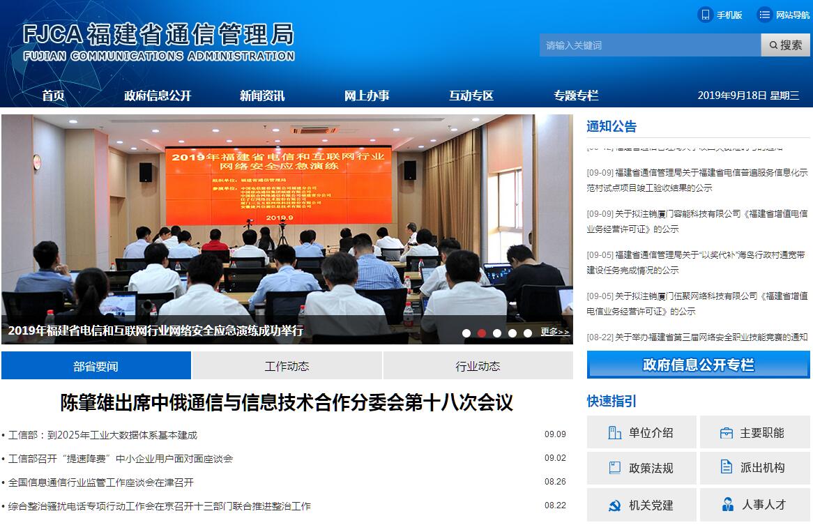福建省通信管理局于2001年1月正式挂牌成立,为工业和信息化部派驻福建省的通信管理部门,实行垂直管理,是福建省通信业的政府主管机构,依法对福建省通信业实施监督管理。内设办公室(人事处)、政策法规处(监察处、机关党委)、信息通信发展处(战备应急通信办公室、国防信息动员办公室)、信息通信管理处、网络安全管理处(互联网管理处)等处室,下辖厦门市通信管理局;管理福建通信行业职业技能鉴定中心、福建省通信工程质量监督中心等事业机构。自组建以来,福建省通信管理局在部、省的领导下,遵循政企分开、破除垄断、鼓励竞争、促进发展的原则,不断创新监管思路,积极转变政府职能,加强宏观调控,建立健全电信监管机制,努力创造公平、公正、有效、有序的市场竞争环境,扎实推进全行业健康发展,组织全行业大力推进国民经济和社会信息化建设,推进电信普遍服务,努力营造一个公平公正、有效有序的产业发展环境。其主要职责:1、贯彻执行信息通信行业管理政策法规,统筹规划福建省公用通信网、互联网、专用通信网并实行行业管理;监测分析福建省信息通信业运行态势并发布引导信息,协调解决行业运行发展中的有关问题;承担推动实施福建省“三网融合”的有关工作。2、负责实施网络强国和“宽带中国”战略,推动福建省全光网城市建设,打造现代互联网产业体系;协调福建省公用通信网、互联网、专用通信网的建设,促进网络资源共建共享;推进福建省电信普遍服务、民资开放工作,加强信息通信建设市场招标投标管理;受工业和信息化部委托,负责福建省重要通信设施建设管理;监督管理福建省信息通信建设市场;指导福建省通信业加强安全生产管理工作。3、依法对福建省电信和互联网等信息通信服务实行监管,承担福建省互联网(含移动互联网)行业管理;组织实施市场准入、市场秩序、设备进网、服务质量、用户权益等监管政策,加强网站备案、接入服务等基础管理;承担信息通信行业行风建设有关工作,推动行业自律和行业组织发展;会同有关部门监督管理电信服务资费和质量;根据授权负责福建省通信网码号、互联网域名和地址等资源的管理;组织开展电话用户实名登记;监管福建省公用通信网、互联网互联互通和公平接入。4、组织开展福建省公用通信网、互联网网络数据和用户个人通信信息保护工作;协调管理公用通信网、互联网、专用通信网网络信息安全平台,推进网络与信息安全保障体系建设;组织推动电信网、互联网安全自主可控相关工作;监管福建省网络运行安全;拟订福建省电信网络安全防护政策并组织实施;负责福建省网络安全应急管理和处置;指导督促电信企业和互联网企业落实网络与信息安全管理责任;组织开展电信网、互联网网络与信息安全监测预警、威胁治理、信息通报工作;配合打击网络犯罪和防范网络失窃密;组织开展电信网、互联网新技术新业务安全评估;受工业和信息化部委托,配合开展福建省特殊通信、网络环境和信息治理有关工作,配合处理网络有害信息;拟订福建省通信管制措施并组织实施。5、组织协调福建省应急通信及其他重要通信保障工作;按分工承担福建省国防通信信息动员和战备通信相关工作;管理福建省党政专用通信工作。6、承办工业和信息化部及中共福建省委、福建省人民政府交办的其他事项。