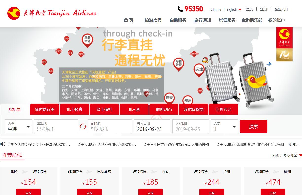 天津航空有限责任公司(简称“天津航空”)是世界500强海航集团的成员企业,于2009年6月8日挂牌成立,由海南航空和天津市政府共同出资组建,扎根环渤海地区经济中心的天津市。心之所想,天航所往。天津航空秉承“从你出发、亲近世界”的品牌定位,致力于提供便捷实用的产品和服务,以善解人意、热爱生活的态度与旅客共同创造美好的旅行体验,让世界更亲近。目前,天津航空拥有以A330、A320、E190等机型为主的年轻豪华机队,总机队规模近100架,逐步建立起包含天津、西安、呼和浩特、乌鲁木齐、贵阳等10大枢纽的区域航线网络,累计开通国际国内航线270余条,拥有超过40条国际航线,航线网络遍布全国,连接日本、韩国、俄罗斯、泰国等周边国家和地区,直飞英国、新西兰、澳大利亚,通航城市130余座,2017年旅客运输量达到1300余万人次。2017年,天津航空新开通天津=重庆=墨尔本、天津=西安=奥克兰、天津=郑州=悉尼等洲际航线,进一步丰富国际航线网络,国际化转型步伐加快。新时期,天津航空不断开通、健全覆盖更多大中型城市的中远程航线网络,构建国内国际航线网络布局,满足人们多元出行需求,打造具备区域主导竞争优势和一定国际影响力的航空公司。天津航空官方网站:www.tianjin-air.com,24小时客户服务热线:95350。