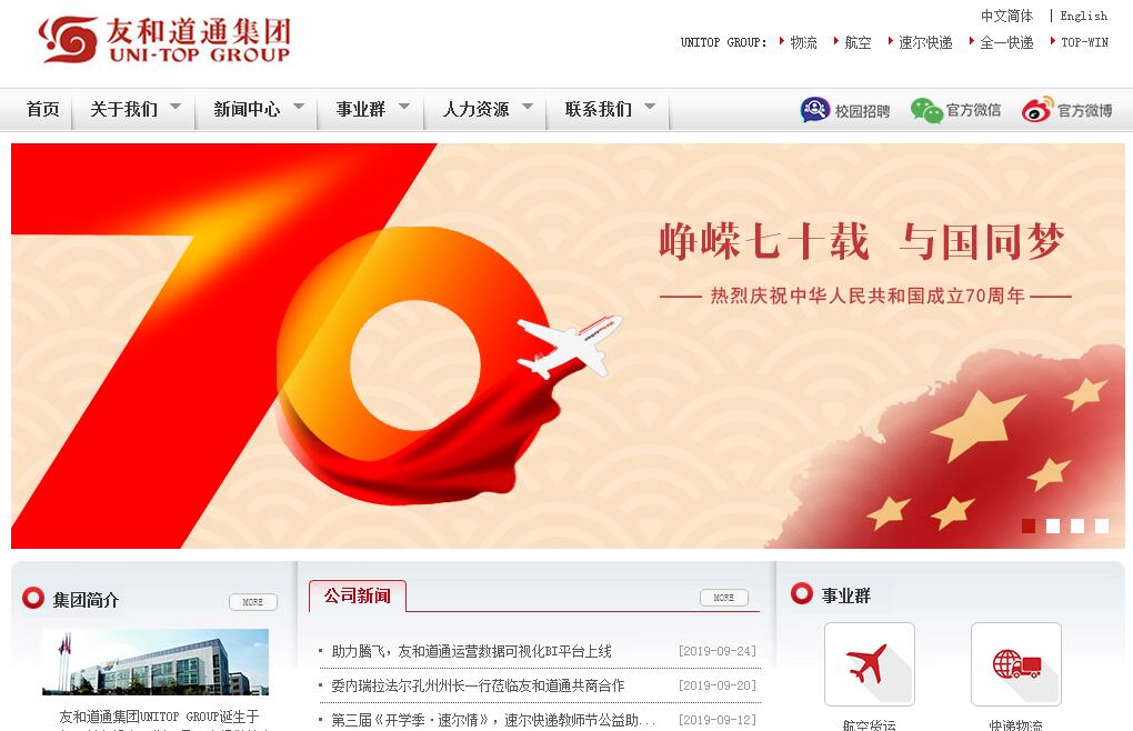 友和道通集团诞生于1998年,总部设在深圳,是一家提供综合性物流解决方案和一站式物流服务的民营企业。集团现有员工1万余人,加盟兼管人员10万余人,旗下拥有友和道通航空有限公司、银河国际货运航空有限公司、深圳市友和道通物流有限公司、友和道通物流园发展有限公司、速尔快递有限公司、上海全毅快递有限公司(全一快递)、深圳市巨顺国际物流有限公司、友和道通供应链管理(深圳)有限公司等多家专业子公司及百余家分公司,构建了涵盖航空货运、快递物流、物流园、商贸四大业务板块。十余年来,友和道通集团专注于物流服务的系统性建设,在管理、营运、商务、IT等方面不断投入、拓展、优化,已形成拥有自己的航空机队(其中4架B747及7架A300全货机)、陆运车队为核心的立体运输体系和100多个大中型仓储转运中心,覆盖国际30多个城市、国内2000多个县市的集散配送体系,致力于打造具有国际水准的多维立体的、能满足客户多层次一站式物流服务要求的综合性物流企业。在航空货运、小件包裹速递、大宗合同物流、保税物流、跨境物流、仓配一体化、商贸、供应链等多个领域走在行业的前列。“友至天下和,道正四海通”,友和道通集团依托各子分公司的专业平台,以市场和客户需求为导向,不断深化内部改革,提升服务标准,与国内外多家知名企业建立了稳固的战略合作伙伴关系,为众多大中型企业提供了整体、系统的物流解决方案及高标准的物流服务,倾力打造“植根中国、服务全球”的国际物流服务品牌。