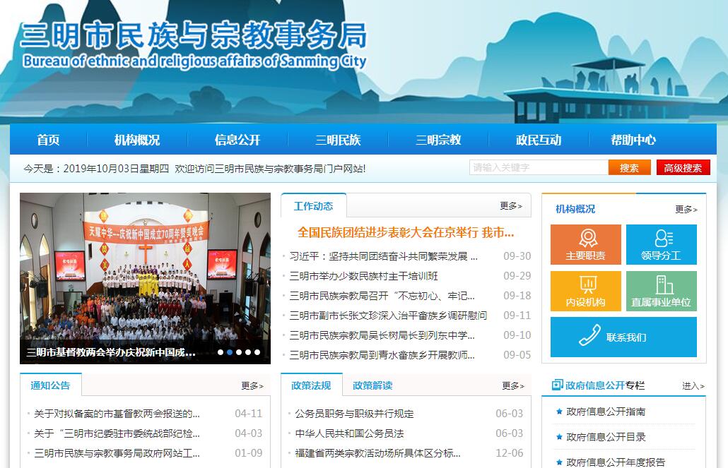三明市民族与宗教事务局主要职责:一、贯彻执行党中央、国务院和省委、省政府关于民族、宗教方面的法律法规和方针政策;组织、指导民族、宗教政策和法律法规规章的宣传教育工作;组织实施和检查监督民族、宗教法律法规规章和政策贯彻执行。二、负责组织协调民族、宗教问题的调查研究,掌握民族、宗教方面的最新动态,提出有关政策建议;协调处理民族、宗教方面突发事件和影响社会稳定的重大问题。三、负责协调推动有关部门履行民族工作相关职责,协调开展民族团结进步创建和民族团结宣传教育活动;协调处理民族关系中的重大事项,做好城市民族工作,提出协调民族关系的工作建议,保障和维护少数民族合法权益,促进各民族共同团结奋斗、共同繁荣发展。四、研究分析少数民族和民族乡村经济社会事业发展方面的问题并提出政策措施建议;协调、配合有关部门处理相关事宜;协调开展少数民族和民族乡村帮扶活动,承担市民族工作协调委员会的日常工作。五、参与起草少数民族事业发展等专项规划,监督检查实施情况;指导少数民族和民族乡村制定经济社会相关领域的发展规划;建立和完善少数民族事业综合评价监测体系,推进民族事务服务体系建设和民族、宗教事务信息化建设。六、依法管理宗教事务,依法保护公民宗教信仰自由和正常的宗教活动,保护宗教团体和宗教活动场所的合法权益;指导县(市、区)宗教事务部门依法履行职能、处理宗教事务重大事件,配合有关部门防范和制止不法分子利用宗教进行的非法、违法活动,抵御境外利用宗教进行的渗透活动;指导和帮助宗教界开展对外及港澳台地区的友好交往活动。七、指导宗教团体依法依章开展活动,引导宗教界开展与社会主义社会相适应的各项活动,协助宗教团体办理有关事务。八、依法管理民间信仰活动及场所,对涉及民间信仰的重大问题进行调研并提出建议,拟订有关管理规定并组织实施;协调处理民间信仰方面的重大问题,指导县(市、区)民族宗教事务部门做好民间信仰活动的管理工作;对涉台、涉侨、涉外的民间信仰活动进行引导和管理。九、负责联系少数民族干部和宗教界人士,协助有关部门做好少数民族干部的培养、教育和使用工作以及民族、宗教界代表人士的政治安排,负责组织培训民族、宗教工作干部和宗教界人士。十、承办市委、市政府交办的其他事项。