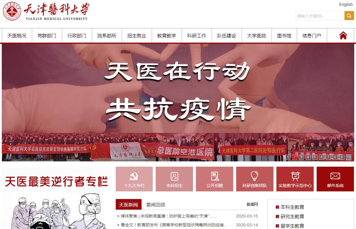 天津医科大学的前身天津医学院创建于1951年,是新中国成立后原国家政务院批准建立的高等医学院校。著名内分泌学家、医学教育家朱宪彝教授为首任校长。1994年6月天津医学院与天津第二医学院正式组建成立天津医科大学。1996年12月成为天津市唯一的国家“211工程”重点建设市属院校,2015年10月成为天津市人民政府、国家卫生计生委和教育部共建高校,2017年9月入选国家“世界一流学科建设高校”。天津医科大学积极投身于我国医学高等教育事业,是国家最早批准试办八年制的两所医学院校之一,也是首批试办七年制的15所院校之一。学校目前有气象台路与广东路2个校区和6所大学医院。现有本科专业21个,设有19个学院(系),2个教学部。全日制本科以上在校生9690人,其中本科生5162人,硕士生3084人,博士生461人,学历留学生983人。包含大学医院在内学校现有各类专业技术人员8429人,其中正高级610人,副高级1123人。拥有中国科学院院士1人、工程院院士2人、外籍院士1人;国家“千人计划”6人及青年项目1人;教育部“长江学者”特聘教授6人、讲座教授5人、青年学者2人和创新团队3个;科技部“973”首席科学家4人;国家杰出青年科学基金获得者6人及优秀青年科学基金获得者5人;国家百千万人才工程人选10人、国家“万人计划”领军人才6人及青年拔尖人才2人;国家人社部有突出贡献专家10人;国家卫生计生委有突出贡献中青年专家12人。现有国家级特色专业5个,国家级专业综合改革试点1个,国家级教学团队2个,天津市级教学团队15个,国家级教学名师1人,天津市级教学名师23人,国家级精品课程7门,国家级精品资源共享课5门,国家级精品视频公开课3门,国家级双语示范课程3门,国家级人才培养模式创新实验区3个,国家级实验教学示范中心3个,国家级大学生课外创新实践基地2个,国家级大学生创新创业训练计划项目74项。2002年和2008年,学校均以优秀成绩通过教育部本科教学和七年制高等医学教育教学工作水平评估。2012、2013和2014年分别通过教育部护理学专业、口腔医学专业认证和临床医学专业国际认证。2009年以来,学校获国家级教学成果一等奖1项、二等奖1项,市级教学成果一等奖7项,二等奖10项。学校于1997年正式成立来华留学生教育管理部门国际医学院,留学生生源来自91个国家,留学生教育规模与质量居全国医学院校前列,现有国家级来华留学生英语授课品牌课程8门,天津市来华留学生英语授课品牌课程25门,“来华留学生临床医学专业全英文教学与质量保障体系的建立与实践”获国家级教学成果一等奖。学校被教育部认定为首个来华英语师资培训中心(医学)。现有一级学科博士学位授权点10个,博士专业学位授权点2个;一级学科硕士学位授权点12个,硕士专业学位授权点7个。博士后流动站6个。博士生导师328人,硕士生导师1031人。现有国家重点学科5个,“211工程”重点建设学科10个,天津市重点学科18个;天津市一流学科4个,天津市特色学科(群)4个,进入全球基本科学指标数据库(ESI)学科排名前1%的学科5个;省部级重点实验室15个,研究所15个,建有天津医学表观遗传学协同创新中心。“十五”以来,学校共承担省部级以上科研项目3218项,获省部级及其以上科技奖励294项,其中国家级科技奖励8项、省部级一等奖23项。2016年学校获批科技部“创新人才培养示范基地”。学校大学医院有13个专科入选国家临床重点专科建设项目,肿瘤医院是全国首批国家肿瘤临床医学研究中心。学校有6所直属医院、15所非直属临床学院。学校先后与22个国家的96所大学和科研机构建立学术交流与合作关系,在医学和生物医药领域开展高水平国际合作,聘请119位世界知名医学专家、教授担任学校各学科的名誉教授和客座教授,成立了“外国专家顾问委员会”,推动学校国际化发展。学校以医学科学为核心,以生命科学为依托,医、理、工、文、法、管协调发展,近年来以全面提升核心竞争力、着力打造健康向上的校园文化为主攻方向,为建设高水平研究型医科大学而不懈地努力奋斗。