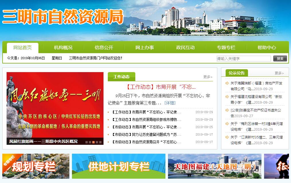 三明市自然资源局主要职责:(一)承担保护与合理利用全市土地资源、矿产资源等自然 资源的责任。组织拟订和实施全市国土资源发展规划和战略,研究提出全市国土资源供需总量平衡的政策建议,参与全市宏观经济运行、区域协调、城乡统筹的研究,并拟订和组织实施涉及国土资源的调控政策和措施;组织实施国土资源领域资源节约集约利用和循环经济的政策措施。(二)承担规范全市国土资源管理秩序的责任。贯彻落实国家和省有关国土资源管理的法律、法规、政策以及相关的技术规程和标准,拟订并组织实施有关本市国土资源管理的政策;组织国土资源行政执法,调查处理国土资源违法案件。(三)承担优化配置全市国土资源的责任。组织编制和实施全市土地利用总体规划、土地利用年度计划和其他有关专项规划、计划;组织编制和实施全市矿产资源总体规划和地质勘查、矿产开发以及地质灾害防治、矿山地质环境保护和地质遗迹保护等其他有关的专项规划;依法指导和审核下级国土资源有关规划;参与报市政府、省政府和国务院审批的涉及土地、矿产项目的相关规划的审查。(四)承担监督检查下级国土资源主管部门行政执法和土地、矿产资源规划执行情况;依法保护国土资源、矿产资源等自然资源所有者和使用者的合法权益,承办并调处权属纠纷。指导土地确权、登记、发证,承担各类土地登记资料的收集、整理、共享和汇交管理,提供社会查询服务。(五)承担全市耕地保护的责任,确保规划确定的耕地保有量和基本农田面积不减少,保证耕地总量的动态平衡。组织实施耕地保护政策和基本农田保护制度,对占用耕地、未利用土地开发、土地整理、土地复垦和耕地开发等实施监督;组织实施土地用途管制,指导农用地转用和土地征收征用;依法承担报市政府、省政府和国务院审批的各类用地的审核、报批工作。(六)承担及时准确提供全市土地利用现状数据的责任。统一管理全市国土资源和城乡地籍、地政工作。制定地籍管理办法,组织土地资源调查、地籍调查,土地统计和动态监测。负责指导监督全市土地登记、房屋登记、林地登记、水域滩涂渔业养殖登记等不动产登记工作;负责办理市区范围内的土地、房屋、森林、林木、林地等有关不动产登记发证。(七)承担节约集约利用土地资源的责任。规范土地使用权出让、租赁、作价出资和转让等行为,管理和监督城乡建设用地供应,代市政府收购储备土地,开发整理土地;贯彻实施国有土地划拨使用目录指南和乡(镇)村用地管理办法;指导全市农村集体非农土地使用权的流转管理。(八)承担规范国土资源市场秩序的责任。监测土地市场和建设用地利用情况,监管地价;规范和监管矿业权市场,组织对矿业权人勘查、开采活动进行监督管理。(九)负责矿产资源开发的管理。依法管理矿业权的审批登记发证和转让审核工作,承担保护性开采的特定矿种、优势矿产(不含煤炭矿种)的开采总量控制及相关管理工作,组织编制实施矿业权设置方案。维护矿产资源的国家所有权,组织征收矿产资源补偿费。负责对矿产资源的开发、利用和保护进行监督管理。负责本辖区范围内矿产督察员的管理工作,协调处理矿产资源权属纠纷。(十)负责管理地质勘查行业和矿产资源储量。组织实施全市地质调查评价、矿产资源勘查,管理市本级地质勘查项目和地质勘查基金;管理地质勘查资质、地质资料、地质勘查成果,统一管理全市公益性地质调查和战略性矿产勘查工作。组织编制和实施本市地质勘查工作中长期规划及年度计划;根据授权组织本市矿产资源的登记、统计、评估核算;负责本市各类地质资料的管理使用。(十一)在环境保护规划指导下,监督管理本市地质环境及开发利用。组织编制本市地质环境保护、监测及地质灾害防治规划、计划并组织实施;为本市较大建设项目,城市总体规划及区域经济开发规划的审批工作提供地质环境方面的审查意见。(十二)承担地质灾害预防和治理的责任。指导地质灾害应急处置,组织、协调、指导和监督地质灾害防治工作,拟订并组织实施重大地质灾害等国土资源突发事件应急预案。(十三)依法征收资源收益,规范、监督资金使用。依法组织土地、矿产资源专项收入的征管,配合有关部门组织实施收益分配制度;参与管理土地、矿产等资源性资产,参与管理国家出资形成的矿业权权益;负责有关资金、基金的预算和财务、资产管理与监督。(十四)依法负责全市测绘地理信息工作的统一监督管理。负责全市基础测绘规划计划的编制和组织实施;监督管理全市测绘地理信息市场活动;承担组织提供测绘地理信息公共服务和应急保障的责任;负责全市测绘成果质量和技术的监管及测量标志保护工作;承担地图管理的责任;负责对全市测绘单位资质管理和测绘成果汇交管理提供及测绘法律法规宣传等工作。(十五)推进国土资源科技进步,组织拟订、实施全市国土资源科技发展和人才培养规划,推进国土资源信息化和信息资料的公共服务,组织开展国土资源对外合作交流;按有关规定管理县(市、区)国土资源管理部门领导。