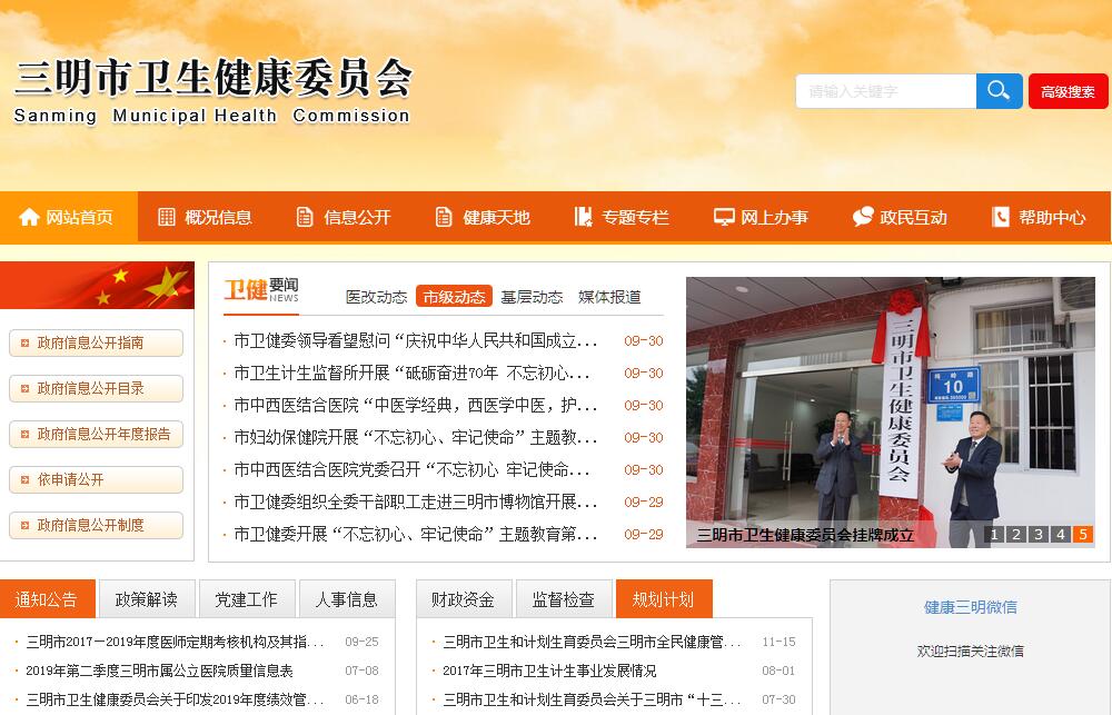 三明市卫生健康委员会主要职责:(一)贯彻执行国家、省有关卫生、计划生育和中医药的法律法规和方针政策,起草卫生、计划生育和中医药事业发展的规划、政策,并负责组织实施;推进医药卫生体制改革和医疗保障,统筹规划与协调全市卫生和计划生育服务资源配置。(二)负责拟定并组织落实疾病预防控制规划、免疫规划、危害人民健康的公共卫生问题的干预措施;拟订卫生应急和紧急医学救援预案、突发公共卫生事件监测和风险评估计划,组织和指导突发公共卫生事件预防控制与应急处置;协调有关部门对重大疾病实施防控与干预;按规定发布突发公共卫生事件应急处置信息。(三)负责拟订和指导落实职责范围内的职业卫生、放射卫生、学校卫生、公共场所卫生监管政策措施和饮用水卫生监督政策措施,组织开展相关监测、调查、评估;负责传染病防治监督工作;组织开展食品安全风险监测、评估,负责食品安全企业标准修订、延续、变更的备案。(四)负责拟订并组织实施基层卫生、妇幼卫生和计划生育服务发展规划和政策措施;负责妇幼保健的综合管理和监督,依法管理计划生育技术服务工作,组织指导基层卫生、妇幼卫生和计划生育服务体系建设,推进基本公共卫生和计划生育服务均等化,完善基层运行新机制和乡村医生管理制度,完善合理分级诊疗模式。(五)负责拟订医疗机构设置规划和区域卫生资源配置规划,加强医疗机构和医疗服务全行业监督管理;拟订并组织实施医疗机构及其医疗服务、医疗技术、医疗质量、医疗安全以及采供血机构管理的政策;组织实施全市医疗机构准入和评审评价工作,组织实施卫生专业技术人员准入、资格标准、执业规则和服务规范,建立医疗服务评价和监督管理体系;依法规范医疗服务市场;指导平安医院建设。(六)负责牵头协调医药卫生体制改革,统筹推进医疗保障、医疗服务、公共卫生、药品供应、监管体制综合改革;负责指导基层医疗卫生机构综合改革,健全网络化城乡基层医疗卫生服务运行机制;负责推进公立医院改革,建立科学的医疗绩效评价机制和适应行业特点的人才培养等制度;鼓励和引导社会资本举办医疗机构;建设和谐医患关系,执行医疗服务和药品价格政策。(七)贯彻落实国家基本药物政策,组织实施国家基本药物制度,依法建立完善计划生育药具管理制度;承担市药品集中招标采购工作领导小组的日常工作。(八)贯彻中西医并重的方针,完善中医药事业发展政策和机制,健全中医药服务和管理体系,扶持和促进中医药事业发展,拟定中医药中长期发展规划;推进中医药医疗、保健、科研、教育、产业、文化“六位一体”全面发展。(九)负责组织推进公立医院管理体制和运行机制改革,建立法人治理结构和现代医院管理制度;按规定负责公立医院国有资产监管;组织指导所监管的公立医院安全防范系统建设。(十)负责完善生育政策,组织实施促进出生人口性别平衡的政策措施,组织监测计划生育发展动态,提出发布计划生育安全预警预报信息建议;组织实施优生优育和提高出生人口素质的政策措施,推动实施生殖健康促进计划,降低出生缺陷发生率。(十一)推动完善计划生育利益导向、计划生育特殊困难家庭扶助和促进计划生育家庭发展等机制;负责协调推进有关部门、群众团体履行计划生育工作相关职责,建立计划生育政策与经济社会发展政策的衔接机制,提出并推动落实稳定低生育水平的政策措施。(十二)拟订并组织落实流动人口计划生育服务管理规划,推动各地建立流动人口医疗卫生、公共卫生、计划生育信息共享和公共服务工作机制。(十三)拟订并指导实施卫生和计划生育人才发展规划和政策,指导卫生和计划生育人才队伍建设;加强全科医生等急需紧缺专业人才培养,完善并指导实施住院医师和专科医师规范化培训制度。(十四)组织拟订卫生和计划生育科技发展规划,组织实施卫生和计划生育相关科研项目;参与拟订医学教育发展规划,协同指导院校医学教育和计划生育教育,组织实施毕业后医学教育和继续医学教育。(十五)监督检查卫生和计划生育相关法律法规、政策措施的落实,指导全市卫生和计划生育综合监督执法体系建设,指导规范执法行为,组织查处重大违法行为;监督落实计划生育一票否决制。(十六)负责卫生和计划生育宣传、健康教育、健康促进、人口文化建设和信息化建设、统计、信息分析等工作,依法组织实施统计调查,参与全市人口基础信息库建设;组织实施国际交流合作与援外工作,开展与港澳台侨的交流与合作;统筹协调卫生和计划生育对口支援工作。(十七)承担市委干部保健委员会的日常工作,负责市委干部保健委员会确定的保健对象的医疗保健工作,按照规定管理市直部门有关干部的医疗保健工作;负责市级以上重要会议与重大活动的医疗卫生保障工作。(十八)承担市人口和计划生育工作领导小组、市爱国卫生运动委员会、市政府深化医药卫生体制改革领导小组和市防治艾滋病工作委员会的日常工作。(十九)承办市委、市政府交办的其他事项。
