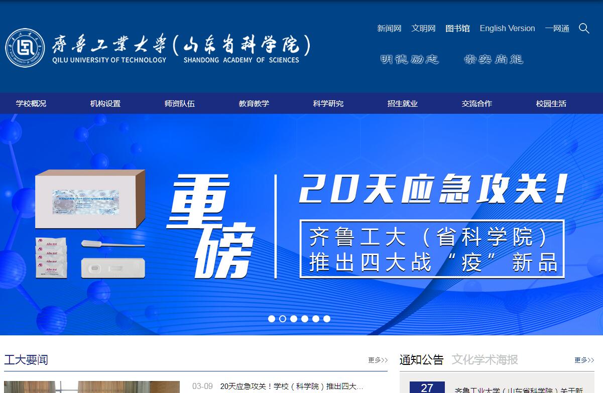 齐鲁工业大学(山东省科学院)坐落于国家历史文化名城——泉城济南,是山东省重点建设的应用研究型大学,同时也是山东省最大的综合性自然科学研究机构。学校(科学院)于2017年5月由齐鲁工业大学和山东省科学院整合组建而成。齐鲁工业大学的历史可追溯到1948年由解放军胶东军区成立的胶东工业学校。1978年至2013年为山东轻工业学院时期,2013年更名为齐鲁工业大学,是国家“产教融合”项目首批建设高校、山东省首批应用型人才培养特色名校、山东省高校协同创新中心首批立项建设单位。山东省科学院前身为始建于1958年的中国科学院山东分院,1979年更名为山东省科学院,是山东省政府直属事业单位。新的齐鲁工业大学(山东省科学院)汇聚山东省优质科教资源,实行校院合一的管理体制,打造科教融合优势特色,是山东省新型工业科技创新及人才培养领域的重要力量。学校(科学院)占地面积3745亩,现有长清、彩石、历城、历下、菏泽5个校区,在济南、青岛、济宁、临沂、菏泽等地设有研究机构,主校区在济南长清大学科技园。学校(科学院)拥有完善的现代化教学基础设施和实验设备。有省部级以上重点学科及研究平台113个,其中省部共建国家重点实验室1个、省部共建国家地方联合工程实验室1个、国家工程技术研究中心1个、国家超级计算济南中心1个、教育部重点实验室1个、国际科技合作基地3个、国家产业技术创新战略联盟1个、省级协同创新中心2个、省级重点学科9个、省级重点实验室17个、省级工程实验室9个、省工程技术研究中心23个、省级高校重点实验室5个、省产业技术创新战略联盟5个、省国际合作研究中心6个,省级社科基地(中心)3个;有省级实验教学示范中心3个,省级人才培养模式创新实验区1个,智能制造省级新旧动能转换实训基地等学生实践教学和实训基地408个。校舍建筑总面积123万平方米,教学科研设备总值10.5亿元,图书馆藏书259万册,电子图书239万册。建有山东教育科研网大学科技园网络节点和覆盖全校的千兆以太计算机网络,科学与艺术深度融合的齐鲁陶瓷玻璃博物馆,校园环境优美宁静,人文艺术气息浓郁,为“省级园林化校园示范单位”。学校(科学院)现有专任教师2005人,其中副高级以上专业技术职务人员946人,具有博士学位的1002人。有“双聘”院士(含外籍院士)7人,国家千人计划项目入选者7人,国家万人计划2人,国家百千万人才工程4人,国家有突出贡献的中青年专家1人,中央联系专家1人,全国优秀科技工作者1人,泰山学者攀登计划专家1人,泰山学者特聘教授、海外特聘专家34人,泰山学者青年专家3人,泰山产业领军人才3人。教育部新世纪优秀人才支持计划3人,科技部中青年科技创新领军人才2人,山东省有突出贡献的中青年专家32人,山东省高端智库专家7人,享受国务院政府特殊津贴专家22人,全国师德标兵1人,全国优秀教师1人,山东省教学名师4人。在职在岗的各类省部级以上高层次人才148人次。学校(科学院)现有全日制在校本科生、研究生、留学生3万余人。设2个学部,20个教学单位,12家创新研究机构。共有9个省部级重点学科,14个硕士学位授权一级学科,93个硕士学位授权二级学科,9个工程硕士专业学位授权领域,3个艺术硕士专业学位授权领域,2个翻译硕士专业学位授权领域,1个金融硕士专业学位授权领域,75个本科专业。学科专业涵盖工学、理学、文学、经济学、管理学、法学、医学和艺术学等8个门类,化学、工程学两个学科进入ESI世界学术机构排名前1%,材料科学接近前1%。学校(科学院)是教育部本科教学工作水平评估优秀学校。办学70年来,累计为社会培养输送各类人才15万余名,涌现出了一大批行业领军人物,被誉为“工程师的摇篮,企业家的沃土”,为山东经济社会发展做出了重要贡献。现有国家级特色专业4个,省级特色专业10个,国家级精品课程1门,省级精品课程33门,省级教学团队7个。在最近一届省级教学成果奖评选中,获得特等奖1项,一等奖7项,二等奖10项。近年来,学生在“挑战杯”“创青春”“数学建模”等大赛中成绩优异,共获得省部级以上奖励2500余项,其中国际级奖励22项,国家级奖励400余项,是山东省大学生创业教育示范院校和山东省高校毕业生就业工作先进集体,毕业生年底就业率长期保持在95%以上,被主流媒体评为山东省十大最具社会口碑学校、最具就业竞争力本科院校、最佳社会声誉高校。进入新时代,学校(科学院)大力发挥科教融合特色和优势,建设院所一体的科教融合学院,成立“齐鲁英才学堂”特色班,形成了“产学研用”一体化、全链条人才培养模式,全面加强创新型人才培养。近年来,共承担国家重点研发计划、“973计划”“863计划”、国家自然科学基金、社会科学基金等国家级科研课题407项,省部级项目254项;获得省部级以上科研奖励71项,其中获国家技术发明二等奖2项,国家科学技术进步二等奖1项,中国专利优秀奖3项,山东省科技最高奖1项,山东省技术发明一等奖2项,山东省科技进步一等奖9项, 山东省社科优秀成果一等奖2项,泰山文艺一等奖1项;获得国家发明专利1126项,山东省专利奖一等奖2项;学术论文被SCI、SSCI收录1787篇,出版著作118部。主办《齐鲁工业大学学报》《科学与管理》《山东科学》3种学术期刊。学校(科学院)积极参与国家和山东省发展战略,面向主导产业发展需求开展科技成果