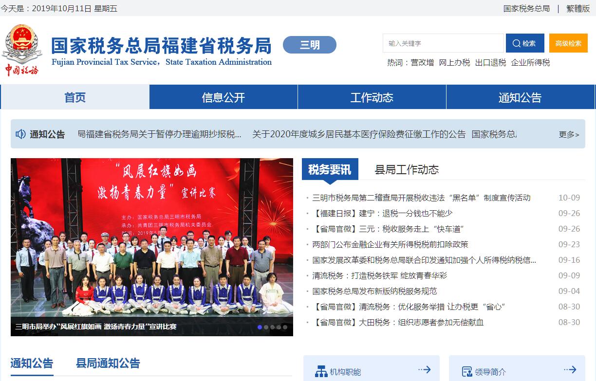 国家税务总局三明市税务局(以下简称“三明市税务局”)的主要职责是:(一)负责贯彻执行党的路线、方针、政策,加强党的全面领导,履行全面从严治党责任,负责党的建设和思想政治建设工作。(二)负责贯彻执行税收、社会保险费和有关非税收入法律、法规、规章和规范性文件,研究制定具体实施办法。组织落实国家规定的税收优惠政策。(三)负责研究拟定本系统税收、社会保险费和有关非税收入中长期规划,参与拟定税收、社会保险费和有关非税收入预算目标并依法组织实施。负责本系统税收、社会保险费和有关非税收入的会统核算工作。组织开展收入分析预测。(四)负责开展税收经济分析和税收政策效应分析,为国家税务总局福建省税务局和市委、市政府提供决策参考。(五)负责所辖区域内各项税收、社会保险费和有关非税收入征收管理。组织实施税(费)源监控和风险管理,加强大企业和自然人税收管理。(六)负责组织实施本系统税收、社会保险费和有关非税收入服务体系建设。组织开展纳税服务、税收宣传工作,保护纳税人、缴费人合法权益。承担涉及税收、社会保险费和有关非税收入的行政处罚听证、行政复议和行政诉讼事项。(七)负责所辖区域内国际税收和进出口税收管理工作,组织反避税调查和出口退税事项办理。(八)负责组织实施所辖区域内税务稽查和社会保险费、有关非税收入检查工作。(九)负责增值税专用发票、普通发票和其他各类发票管理。负责税收、社会保险费和有关非税收入票证管理。(十)负责组织实施本系统各项税收、社会保险费和有关非税收入征管信息化建设和数据治理工作。(十一)负责本系统内部控制机制建设工作,开展对本系统贯彻执行党中央、国务院重大决策及上级工作部署情况的督查督办,组织实施税收执法督察。(十二)负责本系统基层建设和干部队伍建设工作,加强领导班子和后备干部队伍建设,承担税务人才培养和干部教育培训工作。负责本系统绩效管理和干部考核工作。(十三)负责本系统机构、编制、经费和资产管理工作。(十四)完成国家税务总局福建省税务局和市委、市政府交办的其他工作。