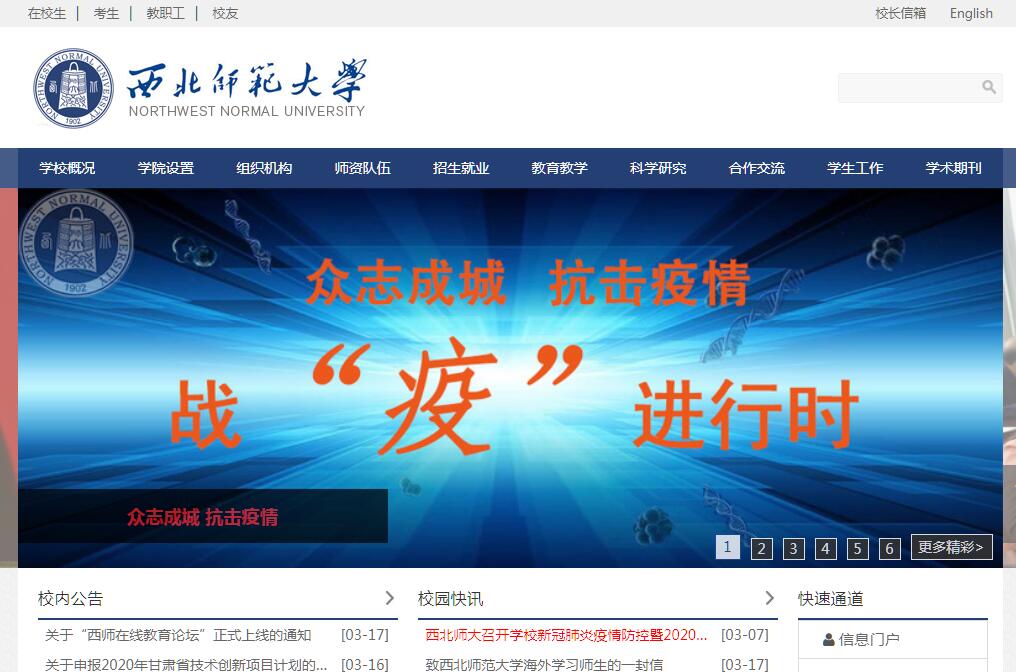 西北师范大学为甘肃省人民政府和教育部共同建设的重点大学、国家重点支持的西部地区十四所大学之一。其前身为国立北平师范大学,发端于1902年建立的京师大学堂师范馆,1912年改为“国立北京高等师范学校”,1923年改为“国立北平师范大学”。1937年“七七”事变后,国立北平师范大学与同时西迁的国立北平大学、北洋工学院共同组成西北联合大学,国立北平师范大学整体改组为西北联合大学下设的教育学院,后改为师范学院。1939年西北联合大学师范学院独立设置,改称国立西北师范学院,1941年迁往兰州。抗日战争胜利后,国立西北师范学院继续在兰州办学。同时,恢复北平师范大学(现北京师范大学)。1958年前学校为教育部直属的全国6所重点高师院校之一,1958年划归甘肃省领导,改称甘肃师范大学。1981年复名为西北师范学院。1988年更名为西北师范大学。1985年教育部依托学校设立了教育部直属的、高等院校建制的“西北少数民族师资培训中心”,与学校实行“两块牌子、一套班子”两位一体的管理体制。1987年,国务院在学校建立了“藏族师资培训中心”。2012年,国务院侨务办公室依托学校设立“西北师范大学华文教育基地”。学校现有国家地方联合工程实验室1个,国家级人文社会科学重点研究基地1个,国家级研究院1个,国家级教学团队2个,教育部重点实验室1个,教育部创新团队2个,教育部研究中心2个,省高校人文社会科学重点研究基地6个,省级重点实验室4个,省级研究中心17个,省高校新型智库5个,省创新群体4个,省级工程研究中心(工程实验室)8个。学校现设27个二级学院(65个系、3个教学部),1个独立学院,3个孔子学院。学校具有良好的办学条件。校本部占地面积960亩,新校区占地面积729亩、生态实训基地约1300亩。校舍总规划建筑面积83.3万平方米,其中各类教学及辅助用房27.5万平方米。各类教学科研仪器设备总值31052.3万元,各类文献资源403.9万余册。学校建成了以远程教育、综合教务管理及校园计算机网、通讯网和有线电视网为主体的现代公共教育服务网络系统。学校自独立设置以来,已培养各类学生23万余人。学校面向全国31个省(市、自治区)招生,现有各类学生30011人。其中,普通本科生18113人,博士研究生392人,硕士研究生6141人,留学生330人,继续教育学生5035人。连续六期实施本科教学改革工程。2003年教育部本科教学工作水平评估获得优秀;2008年教育部英语本科专业评估获得优秀。2010年被评为全国学校艺术教育先进单位。学校有一支结构合理、素质优良的师资队伍。现有教职工2078人,正高级职称人员307人,副高级职称人员694人,具有博士学位人员586人,具有硕士学位人员913人。其中专任教师1272人,教授280人,副教授519人。博士生导师123人,硕士生导师898人。现有双聘院士4人,国家“万人计划”领军人才2人,国家文化名家暨“四个一批”人才1人,“长江学者”特聘教授2人,国家级教学名师1人,全国先进工作者2人,全国优秀教师1人,“党和人民满意的好老师”1人,国家有突出贡献中青年专家5人,国家“百千万人才工程”5人,享受国务院特殊津贴在职人员12人,教育部“高校青年教师奖”3人,教育部“新世纪优秀人才支持计划”13人,甘肃省领军人才第一、二层次人选52人,甘肃省“飞天学者特聘计划”人选23人,省级教学名师19人。学校聘请了100余位国内外知名的专家、学者为特聘或兼职教授。李蒸、黎锦熙、袁敦礼、董守义、李建勋、胡国钰、吕斯百、孔宪武、常书鸿、陈涌、黄胄、彭铎、郭晋稀、李秉德、金宝祥、金少英、南国农等著名教授先后在学校任教。学校是国务院首批确定具有学士、硕士、博士三级学位授予权的单位。现有教育学、中国语言文学、历史学、数学、化学、物理学、马克思主义理论、地理学、心理学9个博士后科研流动站,教育学、心理学、化学、中国语言文学、中国史、美术学、数学、生物学、物理学、地理学等10个博士学位授权一级学科,57个博士二级授权专业,30个硕士学位授权一级学科,164个硕士二级授权专业,1个专业博士学位授权类别,14个专业硕士学位授权类别。有2个国家重点(培育)学科、32个省级重点学科,7个省级优势特色学科,现有77个普通本科专业(其中,英语、数学与应用数学、美术学、汉语言文学、地理科学、物理学、历史学、化学、生物科学等9个专业为国家级特色专业),已形成较为合理的学位授权体系,涵盖了哲学、经济学、法学、教育学、文学、历史学、理学、工学、管理学、艺术学等10个学科门类。学校具有较强的科学研究能力,历来重视产学研结合。近年来,社会科学在中国古代文学、西北历史与地理、课程与教学论、民族教育、古籍整理、敦煌学等学科领域的研究优势突出、特色鲜明。自然科学在高分子化学与物理、基础数学、原子与分子物理、教育技术等领域研究深入,基础理论研究成果被SCIE收录论文数量和质量稳步提高,收录论文数居全国师范大学10位左右,化学学科进入ESI全球排名前1%。学校获得了一批高级别的科研奖励,共获省部级以上奖励560余项,其中全国“五个一工程”奖1项,教育部人文社会科学研究优秀成果奖10项(其中一等奖1项),全国教育科学研究优秀成果奖11项(其中二等奖3项,终身成就奖1项)。国家科学技术进步奖三等奖2项,教育部高等学校科学研究优秀成果奖(科学技