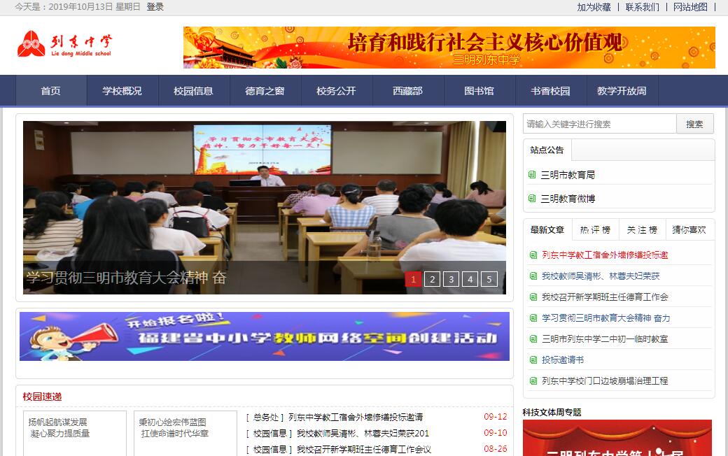 三明市列东中学创办于1975年,坐落于三明市梅列区高岩路3号,前身为三明师范附属学校,曾先后更名为“三明师范大专班附属中学”、“三明师范专科学校附属中学”,1992年8月更为现名,为唯一市属初中校。学校占地35721平方米,建筑面积22951平方米,有教学楼6幢,配有电脑室、劳技室、舞蹈厅、篮球馆、音乐室、美术室、学术报告厅等多功能室,各班级均配备多媒体教学设备,实现“班班通”。藏书70569册。现有48个教学班,在校生2237余人,在编教职员工192人,其中高级教师45人,一级教师70人,专任教师本科以上学历占99.4%。其中省学科带头人2人,区级以上学科带头人、骨干教师33人,硕士学位4人。学校的快速发展,离不开一支优秀的教师团队,优秀的教师团队离不开“以老带新,以新促老”的理念引领。多年来,学校重视青年教师培养,实施“369园丁培养计划”,促进青年教师快速成长,近年参加市级以上教学技能竞赛获奖达到145人次。其中特别突出的有物理组和语文组教师---物理组工作5年以上的组员全部获得过省级比赛的奖项;近年来,全组发表了十余篇CN论文,完成2个省级课题;2位老师获全国一等奖;4位老师获省一等奖,多位老师在省级获奖,物理组被评为“福建省‘五一先锋岗’”和“福建省初中物理学科教研基地校”先进集体。语文组28名教师中,有6名教师为刘菊春名师工作室成员,4名市学科带头人,3名区学科带头人,2名省骨干教师,3名市骨干教师,3名区级骨干教师。林铃老师在省第二届教师技能大赛中获初中语文学科一等奖(第一名),随后,曾艳娟老师在省第三届技能大赛中也获此殊荣,并在第五届“中语杯”观摩研讨课获全国一等奖,被评为“三明市劳模”。学校遵循“对师生的可持续发展负责,为师生展示才华搭建舞台”的教育理念,全面推进素质教育,不断深化基础教育课程改革,实施“低起点、慢加速、重习惯”的教学策略,连年保持巩固率、合格率、重点高中上线率和上线人数市区第一。2000年以来,我校学生在各类竞赛中,荣获国家、省、市级一、二、三等奖达1573多人次。1995年根据教育部和省委、省政府的决定,承担福建省教育援藏项目,创办西藏班。办班至今,已累计接收来自西藏日喀则、林芝、山南、昌都等地区的藏族学生1505人,已有18届共计1236名藏族学生毕业,为发展民族教育,为培养社会主义新西藏的建设者和接班人做出了积极的贡献。学校先后被确认为“福建省初中示范校”、“福建省中小学实施素质教育工作先进校”、“福建省课程改革实验基地校”、“福建省中小学现代教育技术实验校”、“福建省青少年科学教育示范校”和“教育部教育信息化试点学校”,荣获了“全国教育援藏先进集体”、“全国示范家长学校”、“全国消防安全教育示范学校”、“福建省文明学校”、“福建省教育系统先进集体”、“福建省师德建设先进集体”、“福建省先进教工之家”、“福建省绿色学校”、 “福建省‘五一’劳动奖状”等荣誉称号。