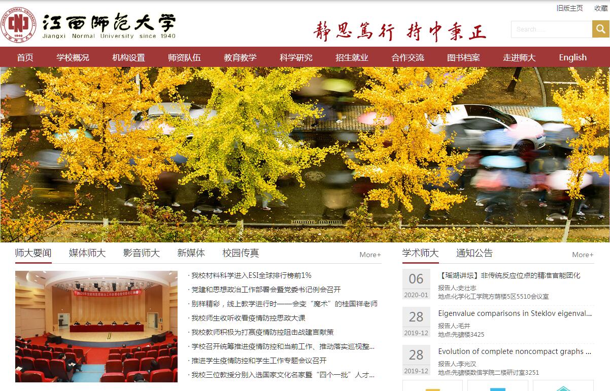 江西师范大学是教育部、江西省人民政府共建高校和中西部高校基础能力建设工程高校。学校融文学、历史学、哲学、经济学、管理学、法学、理学、工学、教育学、艺术学等十大学科门类于一体,位于具有深厚历史文化底蕴,素有“物华天宝、人杰地灵”美誉的江西省省会南昌,对江西的政治、经济、文化和社会发展有较大影响,被江西省人民政府确定为优先发展的省属重点(师范)大学。现有瑶湖、青山湖两个校区,占地面积3500余亩,建筑面积140余万平方米,馆藏纸质文献304余万册,电子图书330余万册。瑶湖校区不设围墙,四周以一条7公里长的瑶河环抱,具有突出的生态人文特色。 学校缘起于庐山白鹿洞书院,肇基于1940年创建的国立中正大学,1949年更名为南昌大学,1953年改为江西师范学院,1983年更名为江西师范大学,是江西省本科办学历史最为悠久的普通高等院校。2003年,江西金融职工大学(江西银行学校)整建制并入。学校先后七次迁址,六易其名,四度调整,砥砺出“静思笃行、持中秉正”的校训,孕育了“团结、勤奋、求是、创新”的优良校风,形成了“以人为本、面向社会”的办学思想,“以生为本、以德为先”的育人思想,“百折不挠、艰苦创业”的办学传统,“质量立校、学术铸校、人才强校、特色名校、管理兴校、和谐荣校”的重点任务和“爱国荣校、民主和谐、求真务实、开放创新”的师大精神。学校是博士学位授予单位和全国第一批学士、硕士学位授予权单位。设有23个专业学院,1个独立学院(科技学院),现有1个ESI全球前1%学科,5个博士后流动(工作)站,9个博士学位授权一级学科点,63个博士学位授权二级学科点,30个硕士学位授权一级学科点,16个硕士专业学位授予点及在职人员以同等学力申请硕士学位授予权,87个本科专业。学校现有87个本科专业,全日制本科生近3万人,博士、硕士研究生5000余人,成人高等学历教育学生1万余人;获批国家教学成果奖二等奖2项,国家级专业综合改革试点项目2个,国家级特色专业6个,国家级大学生校外实践教育基地建设项目2个,国家人文素质教育基地1个,国家级实验教学示范中心2个,国家级精品课程3门,国家级精品资源共享课2门,国家级精品视频公开课1门,国家级教学团队2个,国家“十二五”规划教材6种,教育部万种新教材5种;省级卓越人才培养计划项目7个、人才培养模式创新实验区4个,省级专业综合改革试点项目10个、特色专业10个、品牌专业25个,省级精品课程26门、精品资源共享课25门、精品在线开放课程6门、双语教学示范课程5门,省级教学团队7个,省级研究生教育创新基地4个,省级实验教学示范中心8个。从1999年开始学校实施学分制改革,以培养责任担当、创新精神和实践能力为重点,以“学分制管理、模块化课程、菜单式培养、开放型教学”为机制,着力培养符合社会主义现代化建设需要的“厚专业基础、宽学科口径、高品德素质、强实践能力”的复合创新型高级专门人才,2005年在教育部本科教学工作水平评估中获得“优秀”成绩,2008年起在省内开始按一本线招生。近年来,学校树立以“学”为中心的教育理念,围绕培养社会中坚骨干人才的目标定位,着力满足学生对专业、对知识和能力结构、对教师及其教学方式方法、对自主发展多样成长的四个理性选择,2012年起启动“正大学子”创新人才培养计划,2013年起开展本科师范生免费教育(1000人),实施本硕、硕博连读培养模式,本科生初次就业率稳居全省高校前茅,研究生一次性就业率稳定在90%以上。2011年,学校就业工作成功跻身全国毕业生就业典型高校50强;2012年,学校获批成为全国第一批本科院校教育信息化试点单位;2015年,在全省本科专业综合评价中,数学与应用数学、汉语言文学位居第一,英语、会计学和生物工程排名第二,法学和通信工程专业排名第三,成为全省唯一所有参评专业都位居前三的本科高校;2016年获批教育部的全国高校实践育人创新创业基地,成为全国地方师范大学首个、江西省唯一获批的高校;2017年入选全国首批深化创新创业教育改革示范高校。在2017年教育部组织的本科教学工作审核评估中,学校被专家组称为“一所具有历史底蕴、文化情怀、名校气质的模范大学”。学校现有1个国家工程技术研究中心(国家单糖化学合成工程技术研究中心),1个国家地方联合工程实验室(分子筛膜材料国家地方联合工程实验室),1个国家大学科技园,2个国家级实验教学示范中心, 2个教育部重点实验室(鄱阳湖湿地与流域教育部重点实验室、功能有机小分子教育部重点实验室),1个教育部国别和区域研究中心“马达加斯加研究中心”,1个全国高校辅导员发展研究中心,2个国际科技合作基地,1个国家体育总局重点实验室,1个国家级科技服务平台(高校学生科技创业实习基地),6个省“2011 协同创新中心”,3个省高校高水平创新平台立项建设项目(1个实验室和2个工程研究中心),9个省级重点实验室,3个省级工程技术研究中心,3个江西省产学研合作示范培育基地,2个省工程实验室,4个省社联哲学社会科学重点研究基地,8个省教育厅人文社科重点研究基地,4个省社联哲学社会科学重点研究基地,2个省文化厅文化艺术科学重点研究基地,1个江西省廉政文化研究中心,10个省级软件科学(高校工程、实验示范)技术中心。2010年以来,学校教师先后获得国家科技进步二等奖、