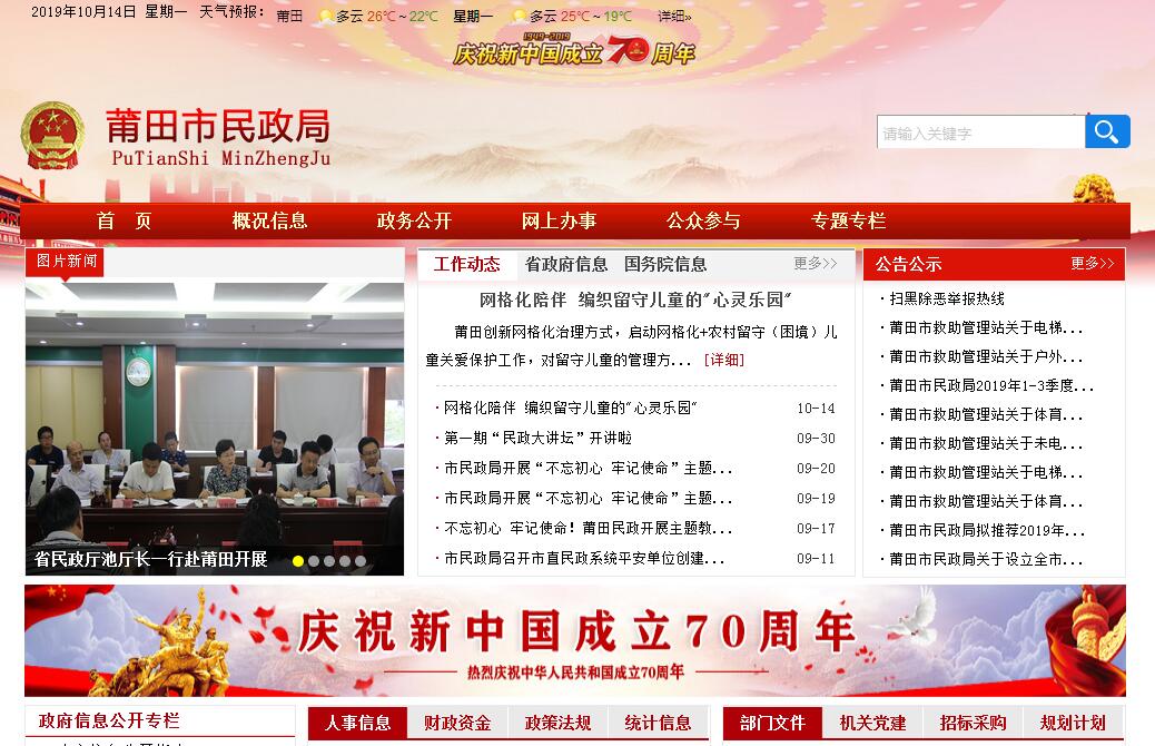 莆田市民政局主要职责:贯彻执行国家、省、市有关民政工作的方针政策和法律法规,研究制定全市民政事业发展规划及年度工作计划并组织实施。负责全市社团、民办非企业单位登记管理工作,监督社团、民办非企业单位活动,查处社团、民办非企业单位的违法行为和未经登记、擅自以社团、民办非企业单位名义开展活动的非法组织,指导、监督全市社团、民办非企业单位登记管理工作。组织、协调抗灾救灾工作,组织核查灾情、掌握灾情、发布灾情,管理分配救灾款物并监督使用,指导救灾捐赠活动,指导灾区开展生产自救,制定并组织实施减灾规划;建立和实施城乡居民最低生活保障制度;组织开展社会互助活动。贯彻执行各类优抚对象优待、抚恤、补助标准,承担市拥军优属拥政爱民工作领导小组的日常工作;负责革命烈士的审核报批、褒扬和革命伤残人员等级评定申报工作以及全市烈士纪念建筑物的管理工作;负责全市退役士兵、复员干部和军队离退休干部、军队无军籍退休退职职工的接收安置工作,组织指导全市军队离退休干部的管理工作、退伍军人两用人才的培训工作和光荣院的管理工作。研究提出加强和改进基层政权建设的意见和建议,指导村民委员会民主选举、民主决策、民主管理和民主监督工作,配合做好村(居)委会政务公开,制定社区服务管理办法,推动社区建设。贯彻执行《婚姻法》,指导婚姻登记工作,承担婚姻服务机构的管理,倡导婚姻习俗改革。负责全市行政区划和地名管理工作,组织协调指导行政区域界线的勘定和管理、变更和调整、争议的调查和处理工作,承担地名标志和城镇门牌的设置和管理,以及全市标准地名图书资料的审定工作。承担老年人、孤儿等特殊困难群体权益保护的行政管理工作和全市流浪乞讨人员的救助管理工作,依法承办儿童收养登记。拟定社会福利事业发展规划,贯彻执行社会福利企业的认定、审批及扶持保护政策。负责全市福利募捐活动和福利彩票发行管理工作,管理本级福利资金和社会福利彩票销售市场。负责全市殡葬管理,贯彻执行《殡葬管理条例》,推行殡葬改革。负责民政事业财务统计工作,指导监督民政事业各类资金的使用和管理工作,承担民政事业信访工作。贯彻执行党和政府有关老区工作的方针、政策;落实革命“五老”人员生活待遇;组织协调对老区的扶建工作。办好SOS儿童村,指导老龄工作。承办市委、市政府交办的其他工作。