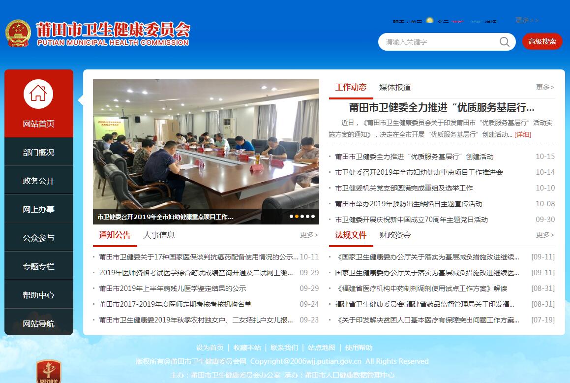 莆田市卫生健康委员会贯彻落实党中央、省委、市委关于卫生健康工作的方针政策和决策部署、在履行职责过程中坚持和加强党对卫生健康工作的集中统一领导。其主要职责是:(一)贯彻执行国家、省有关卫生健康和中医药的法律法规和方针政策,依法起草卫生健康和中医药事业发展的地方性法规、政府规章和政策规划,并负责组织实施。统筹规划全市卫生健康资源配置,指导区域卫生健康规划的编制和实施。制定并组织实施推进卫生健康基本公共服务均等化、普惠化、便捷化和公共资源向基层延伸等政策措施。(二)协调推进我市深化医药卫生体制改革,研究提出深化医药卫生体制改革政策、措施的建议。组织深化我市公立医院综合改革,探索管办分开的有效形式,健全现代医院管理制度,制定并组织实施推动卫生健康公共服务提供主体多元化、提供方式多样化的政策措施,提出医疗服务和药品价格政策的建议。承担市深化医药卫生体制改革领导小组日常工作。(三)负责拟订并组织落实疾病预防控制规划、免疫规划以及严重危害人民健康公共卫生问题的干预措施。负责卫生应急工作,组织指导突发公共卫生事件预防控制和各类突发公共事件的医疗卫生救援。承担市爱国卫生运动委员会日常工作。(四)贯彻落实国家、省应对人口老龄化政策,组织拟订市级老龄事业发展规划并协调落实政策措施,负责推进老年健康服务体系建设和医养结合工作。承担市老龄工作委员会日常工作。(五)组织实施国家药物政策和国家基本药物制度,开展药品使用监测、临床综合评价和短缺药品预警。组织开展食品安全风险监测,依法制修订食品安全地方标准。(六)负责拟订和指导落实职责范围内的职业卫生、放射卫生、环境卫生、学校卫生、公共场所卫生、饮用水卫生等公共卫生监管政策措施,组织开展相关监测、调查、评估。负责传染病防治监督,健全卫生健康综合监督体系。协调开展市级控烟履约工作。(七)负责医疗机构、医疗服务行业监督管理。拟订并组织实施医疗机构及其医疗服务、医疗技术、医疗质量、医疗安全以及采供血机构管理的政策。组织实施全市医疗机构准入和评审评价工作,会同有关部门组织实施卫生健康专业技术人员准入、资格标准。组织实施医疗服务规范、标准和卫生健康专业技术人员执业规则、服务规范,建立医疗服务评价和监督管理体系。依法规范医疗服务市场。指导平安医院建设。(八)组织拟订中医药发展规划和相关政策措施,健全中医药服务体系,扶持和促进中医药事业发展,推进中医药传承和创新,统筹协调中西医发展。牵头会同有关部门开展野生中药材资源保护。(九)负责计划生育管理和服务工作,开展入口监测预警,研究提出人口与家庭发展相关政策建议,完善计划生育相关政策。(十)负责拟订并组织实施基层医疗卫生、妇幼健康发展规划和政策措施。负责妇幼保健的综合管理和监督,组织指导基层医疗卫生、妇幼健康服务体系和全科医生队伍建设。(十ー)拟订并指导实施卫生健康人才发展规划和政策,指导卫生健康人才队伍建设。加强全科医生等急需紧缺专业人才培养,完善并指导实施住院医师和专科医师规范化培训制度。(十二)组织拟订卫生健康科技发展规划,推进卫生健康科技创新发展,组织实施卫生健康相关科研项目。参与拟订医学教育发展规划,协同指导院校医学教育,组织实施毕业后医学教育和继续医学教育。(十三)监督检查卫生健康相关法律法规、政策措施的落实,指导全市卫生健康综合监督执法体系建设,指导规范执法行为。(十四)负责卫生健康宣传、健康教育、健康促进等工作。按规定组织实施卫生健康工作领域国际交流合作与援外工作,开展与港澳台侨的交流与合作。统筹协调卫生健康对口支援工作。(十五)承担市保健委员会的日常工作,负责市保健委员会确定的保健对象的医疗保健工作,按照规定管理市直部门有关干部的医疗保健工作。负责市级以上重要会议与重大活动的医疗卫生保障工作。(十六)按有关规定承担安全生产方面相关职责。(十七)完成市委和市政府交办的其他任务。