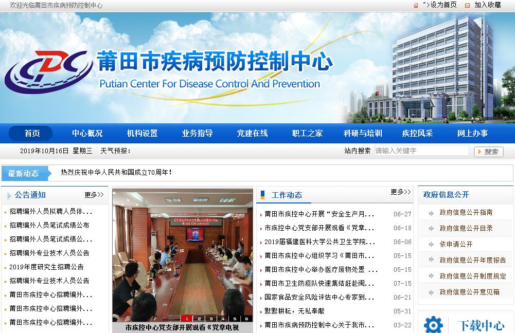 莆田市疾病预防控制中心是莆田市实施疾病预防控制与公共卫生技术管理和服务的副处级公益性事业单位。其前身为1959年成立的闽侯专区卫生防疫保健站,1972年改称莆田地区卫生防疫站,1983年莆田撤区建市,改称莆田市卫生防疫站,2004年7月因全国卫生监督与疾病预防控制体制改革,经市编办批准莆田市卫生防疫站更名为莆田市疾病预防控制中心。中心下设办公室、业务质量管理科、传染病防治科、预防性体检科、消毒杀虫科、食品营养监测科、环境卫生科、学校卫生科、结核病防治科、职业病防治科、检验科、地方病和慢性非传染病控制科等12个科室。其主要职责和任务是,预防控制非典、人禽流感、鼠疫、霍乱、艾滋病等重大传染病的发生与流行,开展突发公共卫生事件、救灾防病的应急处置,开展健康危险因素监测检测,开展健康教育与促进等工作。同时还可为社会提供免疫预防、健康体检、结核病防治、职业病防治等公共卫生技术服务。中心现有职工82人,其中卫生技术人员59人,占全站职工73.75%;现有高级职称14人,中级职称20人;中级职称以上的技术人员占卫生技术人员的57.63%。建有百级洁净实验室、HIV抗体初筛实验室、流感和禽流感实验室、麻疹实验室、鼠疫实验室、强毒实验室及先进的理化实验室。拥有原子吸收分光光度计、气相色谱仪、高效液相色谱仪、原子荧光分光光度计、紫外分光光度计、酶标仪、均质器、全自动细菌鉴定系统、全自动生化分析仪等一批先进仪器设备,固定资产总值824.43万元。长期以来,莆田市疾病预防控制中心致力于莆田市的疾病预防与控制,注重加强精神文明建设,成绩显著。先后获得“全国卫生系统先进集体”、 “全国结核病防治工作先进集体”、“全国消灭脊髓灰质炎先进集体”、“市防治非典先进集体”、“市爱国卫生工作先进单位”、“市创建省级卫生城市先进集体”,“市平安莆田建设平安单位”和第八届、第九届和第十届市级文明单位等荣誉称号。1996年原莆田市卫生防疫站在全省首家达到国家卫生部颁布的地(市)级一等防疫站标准。2001年我市在全省首家有完全资料证实达到消灭脊髓灰质炎标准。2002年全市消灭丝虫病病工作通过省级评审,达到国家标准。1999年原市卫生防疫站取得国家技术监督局颁布的计量认证合格证[(99)量证(闽)字(L0217)号], 2005年市疾病预防控制中心顺利通过了省级计量认证复评审。2005年在全省第三家通过了职业卫生技术服务机构资质现场考核。近年来,先后有《莆田市消灭脊髓灰质炎应用技术研究》、《莆田市不同人群军团菌自然感染血清流行病学调查》、《硬PVC饮水管材和管径萃取液中铅和镉的测定研究》等14个科研项目分别获得市级科技进步一、二、三奖。