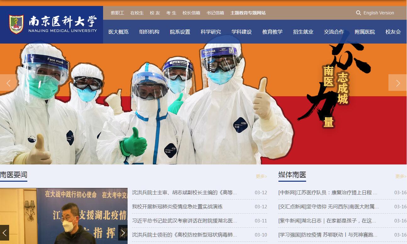 南京医科大学创建于1934年,时名江苏省立医政学院。1957年,由镇江迁至南京,更名为南京医学院。1962年,被列为全国首批六年制医药院校。1981年,被批准为全国首批博士、硕士学位授予单位。1993年,更名为南京医科大学。学校是江苏省属重点建设高校。2015年9月,获准成为首批教育部、国家卫生计生委与省政府共建医学院校。学校设有19个学院(部)和1个独立学院——康达学院。在江苏、上海、山东等地拥有24所附属医院和50多所教学医院。学校现有在职教职工1700多人,其中学校编制专任教师853人。有教授194人、副教授279人,有博士生导师720人、硕士生导师2409人(含附属医院)。学校现有中国工程院院士1名,美国国家医学院外籍院士1名,“长江学者”特聘教授3名,“长江学者奖励计划”青年学者2 位,国家“万人计划”百千万工程领军人才1人,国家“千人计划”9人,国家杰出青年科学基金获得者8人,优秀青年基金获得者11人,国家级教学名师1人,入选“教育部新世纪优秀人才支持计划”7人, “国家级教学团队”3个,教育部“创新团队”1个。学校是江苏省高层次人才培养计划——“333工程”培训基地。学校现有一级学科博士学位授权点8个(基础医学、临床医学、口腔医学、公共卫生与预防医学、药学、特种医学、护理学、生物学)、二级学科博士学位授权点50个、3个交叉学科博士学位授权点(人文医学、临床医学工程、健康政策管理);一级学科硕士学位授权点12个、二级学科硕士学位授权点73个;博士后科研流动站7个,学位授权点已覆盖医学、理学、工学、管理学、法学、教育学和文学等7个学科门类;拥有3个国家重点学科、1个国家重点培育学科、28个国家临床重点专科、2个江苏省一级学科重点学科、3个江苏省一级学科重点培育学科。在全国第四轮学科评估中,我校公共卫生与预防医学在全国54所参评高校中获评A+等级。临床医学、分子生物学与遗传学、生物学与生物化学、神经科学与行为学、药理学和毒理学、免疫学、一般社会科学7个学科进入ESI全球排名前1%。基础医学、公共卫生与预防医学、临床医学、口腔医学是江苏省高校优势学科。学校设有26个本科专业和3个“5+3”本硕一体化专业。目前,在校生总数为1.5万多人,已形成从本科生、研究生到博士后,从全日制到成人教育、留学生教育全方位、多层次的教育体系。学校现有1个国家重点实验室、1个国家级国际联合研究中心、4个部级重点实验室、20个省级重点实验室(工程中心)。“十二五”以来,学校的科研水平不断跃升,承担了多项国家“863”、“973”项目,获得国家自然科学基金项目不断实现新突破,发表的SCI论文数量及论文影响因子均明显增长。2017年,我校获得299项国家自然科学基金项目,项目数位居独立设置医科大学第1位。连续多年被评为“江苏省科技工作先进高校”。学校现已建成5门国家级精品课程,4门国家级精品资源共享课 ,有5个国家级特色专业、5个省级特色专业、4个省级品牌专业、2个国家级双语教学示范课程;建成2个国家级实验教学示范中心、1个国家级虚拟仿真实验教学中心、12个省级实验教学示范中心、19个中央和地方财政共建高校教学实验室、有1个国家级人才培养模式创新试验区。主编6部国家“十二五”规划教材。学校通过教育部临床医学专业认证,得到8年最长认证周期。学校的招生和就业工作受到社会各界的好评,就业率始终保持在95%以上,多次被评为“江苏省毕业生就业工作先进集体”。 学校设有两个校区(江宁校区和五台校区)。江宁校区位于南京市江宁区大学城,占地面积1300亩,是行政、教学和科研中心。五台校区位于南京市鼓楼区五台山南麓,占地120亩,是临床教学和研究中心。学校图书馆有纸质图书113万余册、中、外文电子图书540万余册,中、外文全文电子期刊约2.5万余种,是江苏省医学图书中心馆和高校文献保障系统医学文献中心。学校主办有11种学术期刊。近年来,学校广泛开展对外交流活动,积极与国内外的高等院校建立形式多样的联系与合作。学校与美国、加拿大、澳大利亚、瑞典、日本、台湾、香港等国家和地区的医学院校或科研机构建立了双边合作、学术交流关系。学校于2002年恢复招收留学生和港澳台学生,现有在校留学生和港澳台学生700多人。进入“十三五”,全校师生医护员工凝心聚力、统筹施策、开拓创新、改革攻坚,全面启动实施“十三五”发展规划,努力把学校建成国际知名、特色鲜明的高水平研究型医科大学。