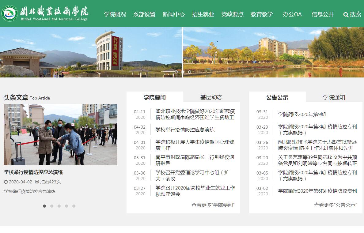 闽北职业技术学院是一所由南平市人民政府主办的全日制公办普通高等职业院校,座落闽江之畔,南平市江南新区职教园区。学院规划占地总面积500亩,总建筑面积152069平方米,建设总投入3亿元。新校区规划科学、布局合理、功能齐全、环境优美、空气清新;学院交通便捷,大门对面即是合福高铁南平北站,距福州、武夷山不足半小时车程,是读书、治学、生活的理想场所。学院坚持“为南平打造全国绿色发展示范区培养高素质技能型人才”的办学定位,主动融入海西自贸区建设,服务闽北区域产业发展,努力把学院建设成区域特色鲜明、优势突出的高职院校。学院秉承“笃行善思,致用创新”的校训,实施“质量立校、特色兴校、人才强校”的发展战略,坚持为海西建设培养高端技术技能型人才,设有食品与生物工程系、管理系、艺术与传播系、信息与工程系、学前教育系和公共基础部5系1部,形成了现代制造、基础教育、创意设计和现代服务等四大专业类群,有食品营养与检测、机械设计与制造、学前教育等23个专业。拥有高等职业教育省级示范专业2个,2个省级现代学徒制试点项目和2个省级高等学校创新创业教育改革试点专业,在省教育厅公布的首轮高职院校专业建设质量评价中,我院的食品营养与检测、室内设计技术、服装设计、新闻采编等专业排名进入全省前10名,其中:食品营养与检测专业全省高职专业排名第3。学院共建成省级教学团队2个,有省级专业带头人2名,省级教学名师2名,享受市政府津贴优秀人才5名。2010年12月,学院以优异成绩通过教育部第一轮高职人才培养工作评估。学院奉行“校企合作、工学结合”的人才培养模式,大力推行“教、学、做”一体化的教学模式,全面提升学生职业技能。实行“双证书”教育,设有国家职业技能鉴定站,毕业生职业资格获证率达100%,有多位学生和团队获得国家级、省级技能大赛奖项。拥有公共营养师、西式面点师、普通话水平测试培训、会计从业资格培训、电子商务培训、机关事业单位招考培训、幼儿教师招考培训、家政服务培训、礼仪主持人培训、计算机高新技术模块考试、食品检验工、化学检验工、维修电工、数控车工、室内装饰设计员、装配钳工、装饰美工、导游培训等各类职业技能培训及各职业工种的初、中、高级技能鉴定资格。重视实践教学体系建设,拥有中央财政支持的生产性实训基地2个、省财政支持的实训基地1个、市财政支持的实训基地2个,现有74间实验实训室,教学仪器设备总值5000多万元。与圣农集团、欧浦登、南纺、南铝、元力活性碳等企业开展现代学徒制教育合作,建立稳定的校外实习实训基地98个。积极为大学生就业创业提供良好环境,建立大学生创业孵化园,为大学生提供创业启动资金。近三年就业率95%以上,用人单位对毕业生满意度达98%以上。在校生升学渠道畅通,可以通过多种渠道取得本科学历和学位。一是全日制本科文凭:根据国家相关规定,按照自愿报名的原则,在大三第二学期参加福建省专升本入学考试,升入本科院校继续学习,近几年我院的专升本录取率都超过75%。二是自考本科文凭:我院与集美大学、福建农林大学、闽南师范大学合作开展专本衔接自考,新生入学后即可报名参加专升本学习,学院组织专升本学生利用课余时间集中辅导,考试成绩合格的可在大专毕业的同时获取自考本科毕业证书,符合条件的可以申请学士学位。自考专升本具有无入学门槛、通过率高、时间短、费用省、信誉高等优势,国家承认学历,可参加公务员、事业单位招考。同时,学院积极拓展对外交流与合作,每年选派优秀学生赴台湾建国科技大学、中州技术学院交流学习。