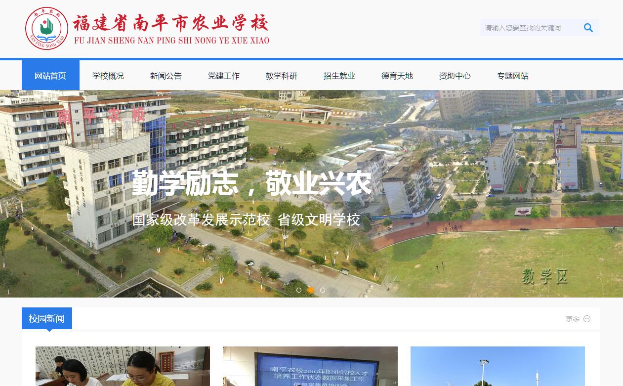 | 网站简介: 福建省南平市农业学校是省(市)共管的公办全日制国家级重点中专学校,国家紧缺型人才培养基地、全国职业教育先进单位、国家级改革发展示范性中职学校、省级文明学校、全国青少年校园足球特色学校、全国国防教育特色学校。学校创建于1951年,地处闽北中心,毗邻世界自然和文化遗产地武夷山,学校地址在南平市建阳区,占地面积858亩,建筑面积12.3万平方米,全日制在校生3000多人,非全日制在校生4000多人,教职工288人,高级职称71人,研究生28人,双师型教师103人,80%以上具备中高级职称。雄厚的办学实力、优惠的入学条件,通畅的升学渠道、可靠的就业保障是家长和学生选择报考我校的亮点,毕业生深受用人单位欢迎! |