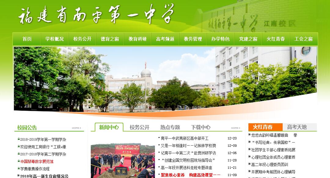 福建省南平第一中学创办于1903年,建校时命名为“延平府中学堂”,其前身为1719年始办的“道南书院”。1906至1912 年改为延平府师范学堂,随后复名延平府中学堂。1917年改为省立第四中学。1927年合并原省立第四中学、省立第三师范、建安甲种森林学校、私立剑津中学、私立淑馨女子中学为“闽北公立中学”。1934年取消高中部改称省立南平初级中学。1944年又改为省立南平中学。1949年合并“县立初级中学”,南中校名不变。1956年定名为“福建省南平第一中学”,沿用至今。1957年被福建省教育厅列为省重点中学。1995年评为福建省普通中学一级达标学校,1999年,撤销初中部成为独立设置的普通高中。阅尽世纪沧桑,百年薪火相传。南平一中与时俱进,以质取胜,声重闽北。学校先后培养了近三万名毕业生。五湖四海,世界各地,都留下校友自强不息的身影和开拓进取的足迹。在不同的历史时期,校友们为民族的振兴,国家的富强做出了贡献。目前,学校高中三个年级60个教学班,初中一个年级(七年级)7个班,紫云校区27个教学班,江南校区40个教学班,在校学生3515人,教职工数319人,其中专任教师292人,高级教师119人,中级教师70人。新老校区共占地面积110575平方米,建筑面积67741平方米。近年新建的江南校区位于水南八仙片区,占地86390平方米,建筑面积41527平方米。包括二座教学楼,一座实验楼,一座图书馆楼,二座男女生宿舍,两座食堂(其中一座钢构食堂)以及标准化校园田径跑道、篮球场、足球场等设施。学校图书馆藏书17.8万册,实验室、语音室及校园计算机网络系统等现代教育教学设施设备齐全,办学条件不断改善。学校坚持以“以人为本,全面发展”的教育理念,把学生的全面发展、教师自身的发展、学校本身的发展视为不可分割的有机整体。通过师生的发展促进学校的发展,用学校的发展带动师生的发展。首先加强师资队伍建设。根据师德高尚、业务精进的要求,加大“培青”力度,启动“名师工程”,建构教坛新秀、教学骨干(能手)、学科带头人、教育教学专家四个层面的培养体系,“培青”、“名师”齐头并进,两轮齐转,取得实效。继续深化教育教学改革。学校适应时代需要,调整课程内容和目标,变革学习方式和评价方式,开设具有时代性、基础性和选择性的高中课程。积极建构纵向(校级、教研组、备课组以及教师个人)与横向(学科间相互渗透和综合)结合的教研教改网络。在省内率先开展全校性的“研究性学习”活动,被省教育厅定为“研究性学习”联系校。2003年,学校被命名为首批“福建省青少年科技教育示范校”。举办“科技节”、“体育节”、“艺术节”(三节活动),面向全体学生,注重全面发展,得到社会的广泛认可。近年来,南平一中紧紧围绕提高办学质量这一主题,大力开展责任教育,推行学生自主管理;着力构建新型质量评估体系,积极建立健全激励机制,有效推动了学校良好的校风、教风、学风的形成;教育教学质量取得明显的提高,家长和社会对学校的满意度不断提升。近三年高考成绩稳步提升高考本科以上上线率居闽北之首,受到社会的普遍赞誉。学校先后荣获各种荣誉称号:连续5届获“福建省文明学校”,省素质教育先进学校,省青少年科技教育示范校,省级民主管理先进单位,省综合治理先进单位,省先进教工之家,省教改先进单位,省普通中学创优先进集体,省教育工作先进单位等。2014年被评为南平市普通高中多样化发展改革试点校,荣获“南平市德育工作先进单位”称号,2015年被列为全国青少年校园足球特色学校,荣获“南平市第二批校园文化建设示范学校”称号,2016年被评为福建省青少年校园足球特色学校示范校和南平市五A级平安校园,2017年被列为福建省普通高中课程改革基地校,福建省中小学德育建设“百优”示范校,福建省美育示范校。