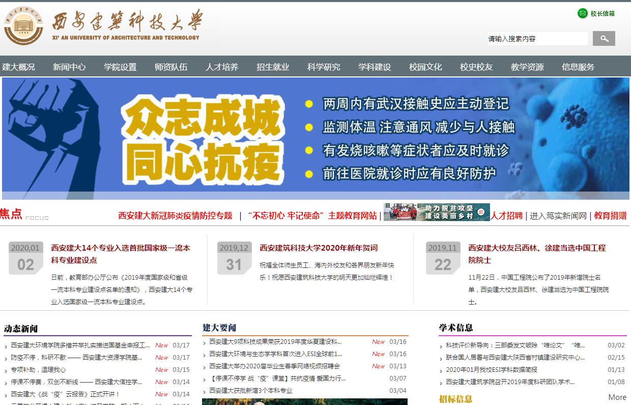 西安建筑科技大学坐落于历史文化名城西安,现有雁塔、草堂两个校区和一个科教产业园区。雁塔校区南眺驰名中外的唐代大雁塔,北临举世闻名的明代古城墙;草堂校区坐落在秦岭北麓,毗邻千年名刹草堂寺;华清科教产业园位于西安高新技术东开发区幸福林带南段,东依景色怡人的浐灞生态园;两校区和产业园区总占地4300余亩。学校办学历史悠久、底蕴深厚,最早可追溯到始建于1895年的北洋大学,1956年全国高等院校院系调整时,由原东北工学院、西北工学院、青岛工学院和苏南工业高等专科学校的土木、建筑、市政系(科)整建制合并而成,积淀了我国近代高等教育史上最早的一批土木、建筑、市政类学科精华,时名西安建筑工程学院,是新中国西北地区第一所本科学制的建筑类高等学府,我国著名的土木、建筑“老八校”之一,原冶金工业部直属重点大学。1959年和1963年,学校先后易名为西安冶金学院、西安冶金建筑学院;1994年3月8日,经原国家教委批准,更名为“西安建筑科技大学”。1998年,学校划转陕西省人民政府管理。现为“国家建设高水平大学项目”和“中西部高校基础能力建设工程”实施院校、陕西省重点建设的高水平大学、陕西省和住房与城乡建设部共建高校。经过并校60年来的建设与发展,学校实力不断增强,已经成为一所以土木建筑、环境市政、材料冶金及其相关学科为特色,以工程技术学科为主体,工、管、艺、理、文、法、哲、经、教等学科协调发展的多科性大学。学校被国际建筑师协会(UIA)授予"建筑教育特别贡献奖",被国务院授予"全国就业先进工作单位",学校党委被中共中央授予"全国先进基层党组织"称号。学校是国务院批准首批具有博士、硕士和学士学位授予权的单位。学校拥有原国家重点学科3个(结构工程、环境工程、建筑设计及其理论)。在2016年全国第四轮学科评估中,建筑学、城乡规划学、风景园林学、土木工程、环境科学与工程5个学科为B+(全国前20%);材料科学与工程为B(全国前30%);管理科学与工程为B-(全国前40%);2016年11月工程学进入ESI全球排名前1%。学校设有研究生院,现有一级学科博士点9个,博士后流动站7个,一级学科硕士点25个;具有10种类别的硕士专业学位授予权,其中工程硕士拥有16个授权领域。博士点涉及工学、管理学2个学科门类,硕士点涉及工学、管理学、艺术学、理学、法学、哲学、教育学等7个学科门类,基本涵盖学校所有本科专业。学校现有17个学院,63个本科专业面向全国第一批招生,有权招收保送生,实行本硕连读。建筑学、城乡规划和风景园林、历史建筑保护工程四个专业为五年学制,其它本科专业均为四年制。建筑学、城乡规划、土木工程、环境工程、建筑环境与能源应用工程、工程管理、材料科学与工程、给水排水工程、环境设计等9个专业为国家级特色专业,15个专业为省级特色专业。建筑学等21个本科专业获准陕西高校“一流专业”建设。建筑学、土木工程、工程管理、城乡规划、建筑环境与能源应用工程、给排水科学与工程、环境工程、材料科学与工程、冶金工程等9个本科专业相继通过教育部专业评估或工程教育专业认证。学校拥有省部共建国家重点实验室——西部绿色建筑国家重点实验室,国家国际科技合作基地、国家级成果研究推广中心、地方联合工程研究中心、(虚拟仿真)实验教学示范中心等7个,3个甲级资质设计研究院。陕西省依托学校成立了"陕西循环经济工程技术院"、“陕西省新型城镇化和人居环境研究院”、“陕西省膜分离技术研究院”。学校现有在校学生34000余人,其中全日制本科生19000余人,研究生5600余人,留学生近70人;继续教育学院在册学生9500余人。学校现有教职工2800余名,其中专任教师1700余名,具有高级职称者1000余人;拥有在职中国工程院院士2名、双聘院士5名,国家教学名师、全国师德标兵1名、全国优秀教师4名、全国模范教师2名、全国优秀教育工作者1名、全国先进工作者1名、全国杰出专业技术人才1名、全国“五一”劳动奖章获得者1名、“长江学者奖励计划”特聘教授1名,国家杰出青年基金获得者4名、国家优秀青年科学基金获得者1名,“万人计划”6名、“百千万人才工程”国家级人选7名、国家有突出贡献中青年专家4名、科技部中青年科技创新领军人才3名、中国青年科技奖获得者2名、享受国务院政府特殊津贴者106名、教育部“新世纪优秀人才支持计划”人选3名、国家青年“千人计划”1名、陕西省重点领域顶尖人才1名、陕西省有突出贡献专家1名、陕西省“百人计划”特聘教授29名、陕西省“三五人才”5名、陕西省“三秦学者”特聘教授3名,陕西省中青年科技创新领军人才7名、拥有国家自然科学基金委创新研究群体科学基金资助项目获准团队1个、教育部“长江学者和创新团队发展计划”入选团队2个、全国高校黄大年式教师团队1个、国家级教学团队3个、省级教学团队29个、陕西省重点科技创新团队7个,形成了一支阵容整齐、结构合理、素质优秀、实力雄厚的师资队伍。“十二五”以来,学校先后荣获国家教学成果二等奖5项、国家科技进步二等奖5项、国家技术发明二等奖2项、“何梁何利基金科学与技术进步奖”1项,获首届全国创新争先奖。在国家重大教育教学改革中,学校先后入选国家“卓越工程师教育培养计划”实施学校、