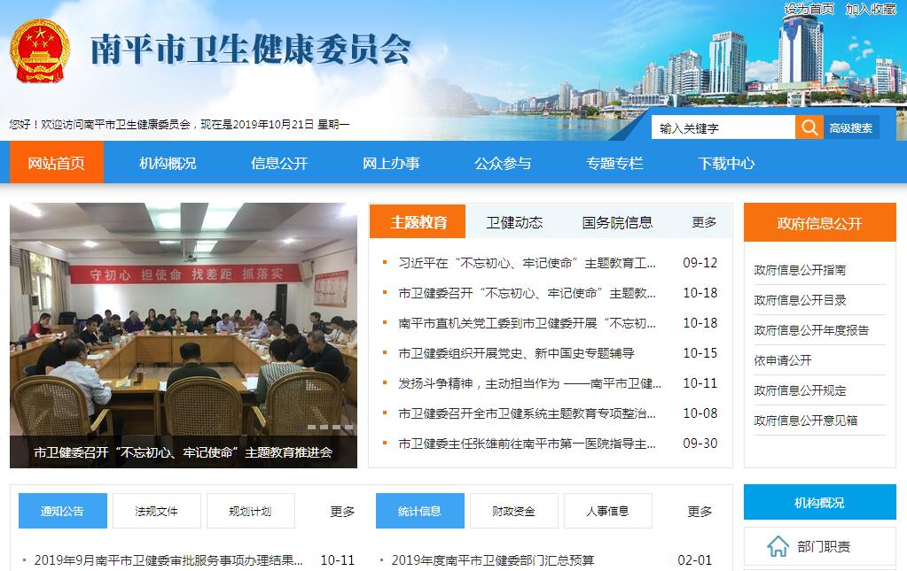 南平市卫生健康委员会主要职责:(一)贯彻执行国家和省有关卫生、计划生育和中医药的法律法规和方针政策,拟订卫生、计划生育和中医药事业发展的规划及政策,并负责组织实施;负责协调推进医疗保障,统筹规划与协调全市卫生和计划生育服务资源配置。(二)负责拟订并组织落实疾病预防控制规划、免疫规划、危害人民健康的公共卫生问题的干预措施;拟订卫生应急和紧急医学救援预案、突发公共卫生事件监测和风险评估计划,组织和指导突发公共卫生事件预防控制与应急处置;按规定发布突发公共卫生事件应急处置信息。(三)负责拟订并指导落实职责范围内的职业卫生、放射卫生、环境卫生、学校卫生、公共场所卫生监管政策措施和饮用水卫生监督政策措施,组织开展相关监测、调查、评估;负责传染病防治监督工作;组织开展食品安全风险监测、评估。(四)负责拟订并组织实施基层卫生、妇幼卫生和计划生育服务发展规划和政策措施;负责妇幼保健的综合管理和监督,依法管理计划生育技术服务工作,组织指导基层卫生、妇幼卫生和计划生育服务体系建设,推进基本公共卫生和计划生育服务均等化,完善基层运行新机制和乡村医生管理制度;完善合理分级诊疗模式;负责拟定全市新型农村合作医疗指导意见,协调管理、指导、评价和监督新农合工作。(五)负责医疗机构和医疗服务全行业监督管理;拟订并组织实施医疗机构及其医疗服务、医疗技术、医疗质量、医疗安全以及采供血机构管理的政策;组织实施全市医疗机构准入和评审评价工作,组织实施卫生专业技术人员准入、资格标准、执业规则和服务规范,建立医疗服务评价和监督管理体系;依法规范医疗服务市场;指导平安医院建设。(六)负责指导基层医疗卫生机构综合改革,健全网络化城乡基层医疗卫生服务运行机制;负责推进公立医院改革,建立科学的医疗绩效评价机制和适应行业特点的人才培养等制度;鼓励和引导社会资本举办医疗机构;建设和谐医患关系,提出医疗服务和药品价格政策的建议。 (七)贯彻落实国家药物政策,组织实施国家药物制度,组织实施药物采购和使用等具体管理办法;依法建立完善计划生育药具管理制度。(八)贯彻中西医并重的方针,完善中医药事业发展政策和机制,健全中医药服务和管理体系,扶持和促进中医药事业发展,制定中医药中长期发展规划;推进中医药医疗、保健、科研、教育、产业、文化“六位一体”全面发展。(九)负责组织推进所监管的市属公立医院管理体制和运行机制改革,建立法人治理结构和现代医院管理制度;按规定负责公立医院国有资产监管;组织指导所监管的市属公立医院安全防范系统建设。(十)贯彻落实生育政策,组织实施促进出生人口性别平衡的政策措施,组织监测计划生育发展动态,提出发布计划生育安全预警预报信息建议;组织实施优生优育和提高出生人口素质的政策措施,推动实施生殖健康促进计划,降低出生缺陷发生率。(十一)推动完善计划生育利益导向、计划生育特殊困难家庭扶助和促进计划生育家庭发展等机制;负责协调推进有关部门、群众团体履行计划生育工作相关职责,建立计划生育政策与经济社会发展政策的衔接机制,提出并推动落实稳定低生育水平的政策措施。(十二)拟订并组织落实流动人口计划生育服务管理规划,推动各地建立流动人口医疗卫生、公共卫生、计划生育信息共享和公共服务工作机制。(十三)拟订并指导实施卫生和计划生育人才发展规划和政策,指导卫生和计划生育人才队伍建设;加强全科医生等急需紧缺专业人才培养,完善并指导实施住院医师和专科医师规范化培训制度。(十四)组织拟订卫生和计划生育科技发展规划,组织实施卫生和计划生育相关科研项目;参与拟订医学教育发展规划,协同指导院校医学教育和计划生育教育,组织实施毕业后医学教育和继续医学教育。(十五)监督检查卫生和计划生育相关法律法规、政策措施的落实,指导全市卫生和计划生育综合监督执法体系建设,指导规范执法行为,组织查处重大违法行为;监督落实计划生育一票否决制。(十六)负责卫生和计划生育宣传、健康教育、健康促进和信息化建设、统计、信息分析等工作,依法组织实施统计调查,参与全市人口基础信息库建设;组织实施国际交流合作与援外工作,开展与港澳台侨的交流与合作;统筹协调卫生和计划生育对口支援工作。(十七)承担市保健委员会的日常工作,负责市保健委员会确定的保健对象的医疗保健工作,按照规定管理市直部门有关干部的医疗保健工作;负责市级以上重要会议与重大活动的医疗卫生保障工作。(十八)承担市人口和计划生育工作领导小组、市爱国卫生运动委员会和市防治艾滋病工作委员会的日常工作。(十九)承接国务院和省政府下放的职责,承办市委、市政府交办的其他事项。