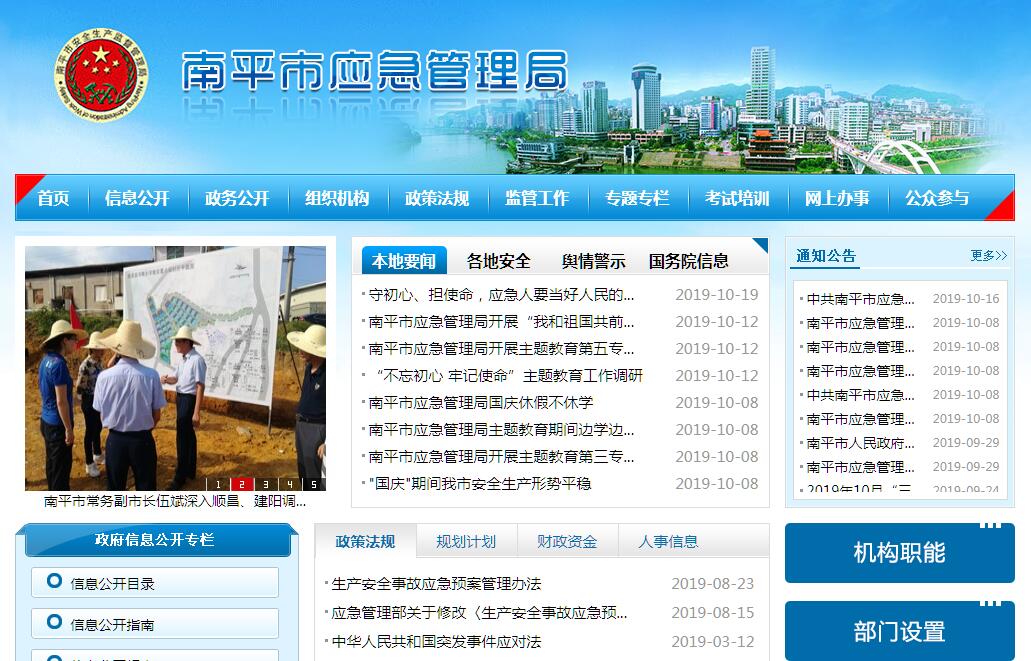 南平市应急管理局主要工作职责:(一)贯彻执行国家、省有关安全生产方针政策和法律法规,起草并组织实施我市安全生产工作综合性、规范性文件;拟订全市安全生产政策和规划,指导协调全市安全生产工作;分析和预测全市安全生产形势,发布全市安全生产信息;协调解决安全生产中的重大问题。(二)负责全市安全生产综合监督管理,依法行使综合监督管理职权;指导协调、监督检查市政府有关部门和各县(市、区)人民政府安全生产工作,组织监督考核通报安全生产责任目标执行情况。(三)按照分级、属地管理和谁主管谁负责原则,依法综合监督检查有关行业监管部门和生产经营单位贯彻执行安全生产法律法规规章情况及其安全生产管理工作;综合监督检查有关行业监管部门和生产经营单位重大危险源监控和重大事故隐患排查治理工作;依法查处有关行业不具备安全生产条件的生产经营单位。(四)承担全市非煤矿山企业和危险化学品企业的安全生产准入管理责任,负责全市危险化学品安全监督管理综合工作;负责监督烟花爆竹生产经营单位贯彻执行安全生产法律法规的情况,负责烟花爆竹生产经营单位安全生产条件审查和安全生产、经营许可工作,组织查处不具备安全生产条件的烟花爆竹生产经营单位,组织查处烟花爆竹安全生产较大事故,开展应急救援工作;负责职业卫生检测和评价技术服务机构的资质认定和监督检查;依法组织查处作业场所职业危害事故和违法违规行为等。(五)负责组织市政府安全生产综合检查和专项督查工作;根据市政府授权,依法组织较大生产安全事故调查处理工作,监督事故查处和责任追究落实情况。(六)负责组织指挥和协调全市安全生产应急救援工作;综合管理全市安全生产伤亡事故和安全生产行政执法统计分析工作。(七)负责监督检查职责范围内建设项目的安全设施与主体工程同时设计、同时施工、同时投入使用(以下称建设项目“三同时”)情况。(八)负责指导并监督特种作业人员(煤矿特种作业人员、特种设备作业人员除外)的考核工作和工矿商贸生产经营单位主要负责人、安全生产管理人员的安全资格(煤矿矿长、煤矿企业安全管理人员安全资格除外)考核工作;监督检查工矿商贸生产经营单位安全生产教育培训工作。(九)指导协调全市安全生产检测检验工作,监督管理安全生产社会中介机构和安全评价工作。(十)指导协调和监督全市安全生产行政执法工作。(十一)组织拟订并督促实施安全生产科技规划,指导协调安全生产重大科学技术研究和推广,推进安全生产技术支撑体系建设。(十二)综合协调组织安全生产宣传教育工作,组织开展安全生产方面的交流与合作。(十三)承担市政府安全生产委员会的日常工作。