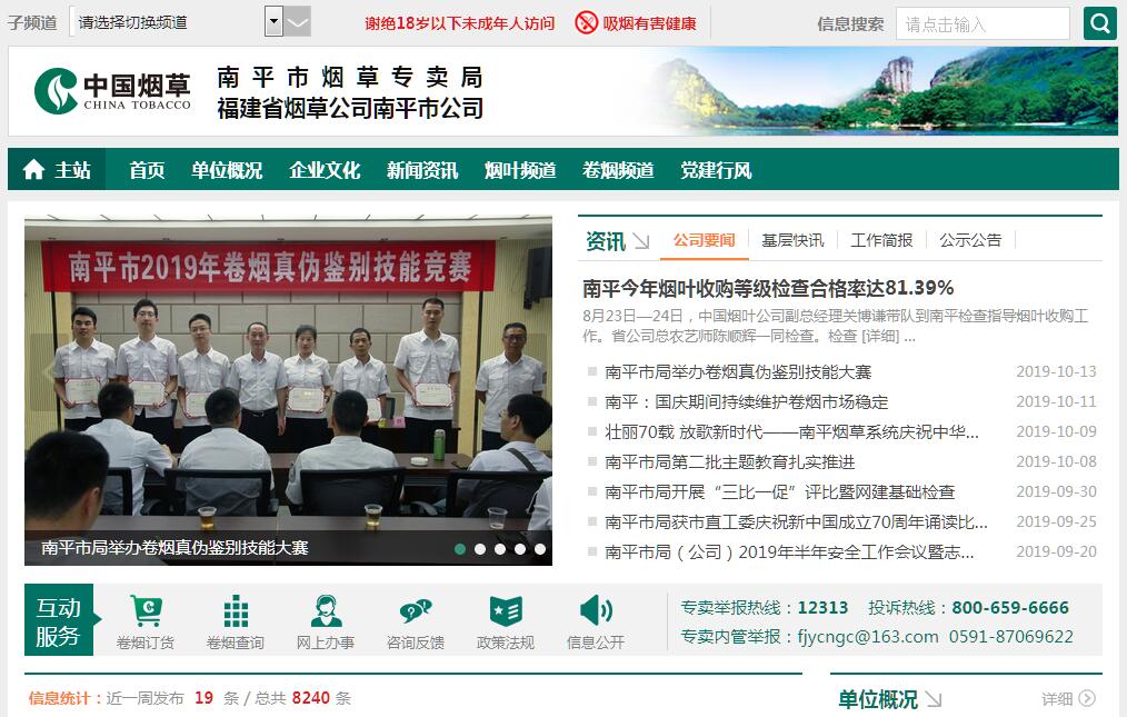 南平市烟草专卖局(公司)组建于1984年,于2006年底完成母子公司体制改革,理顺产权关系;下辖10个县级局(分公司)以及南平市金叶贸易服务有限公司、南平烟草物流有限公司两个多元化经营企业,参股福建武夷烟叶有限公司、南平海晟连锁商贸有限公司。截至2016年底,全市烟草系统从业人员共2246人。在福建省烟草专卖局和南平市委、市政府的正确领导下,全市烟草系统深入学习贯彻十八届三中、四中、五中、六中全会精神,十九大精神和习近平总书记系列重要讲话,坚持发展新理念,把握发展新机遇,开创发展新格局。目前,南平烟草拥有省级以上烟叶基地单元15个,拥有烟草站点74个。2016年,全市烟草系统实现税利14.81亿元,同比增长2.96%;1.22万户烟农种植烟叶27.08万亩,收购烟叶67.09万担;13288户卷烟零售户销售卷烟10.99万箱;查获卷烟案件726起,其中5万元以上大要案40起,省局暗访市场净化率93.2%(居全省第四位)。南平市局(公司)和9个县级局(分公司)荣获“福建省第十二届省级文明单位”称号、南平市局荣获“福建省第七届文明行业”称号,南平市局获评“全国打假先进集体”“2011-2015年全国法治宣传教育先进单位”“全国第三批烟草商业企业标准化示范企业”称号。2018年南平烟草将全面贯彻党的十九大精神、全国烟草工作会议和全省烟草商业系统工作会议精神,坚持稳中求进工作总基调,以转变发展理念为前提,落实市场化导向的烟叶经营指导思想、落实“五保”卷烟经营指导思想,以创新的思维抓好“稳产销、提结构、降成本、增税利”各项工作,提升全面从严治党、烟叶市场供给、卷烟市场挖掘、专卖市场管控、行业规范管理五种能力,确保工作呈现新气象、实现新突破,推动全市行业平稳健康发展。