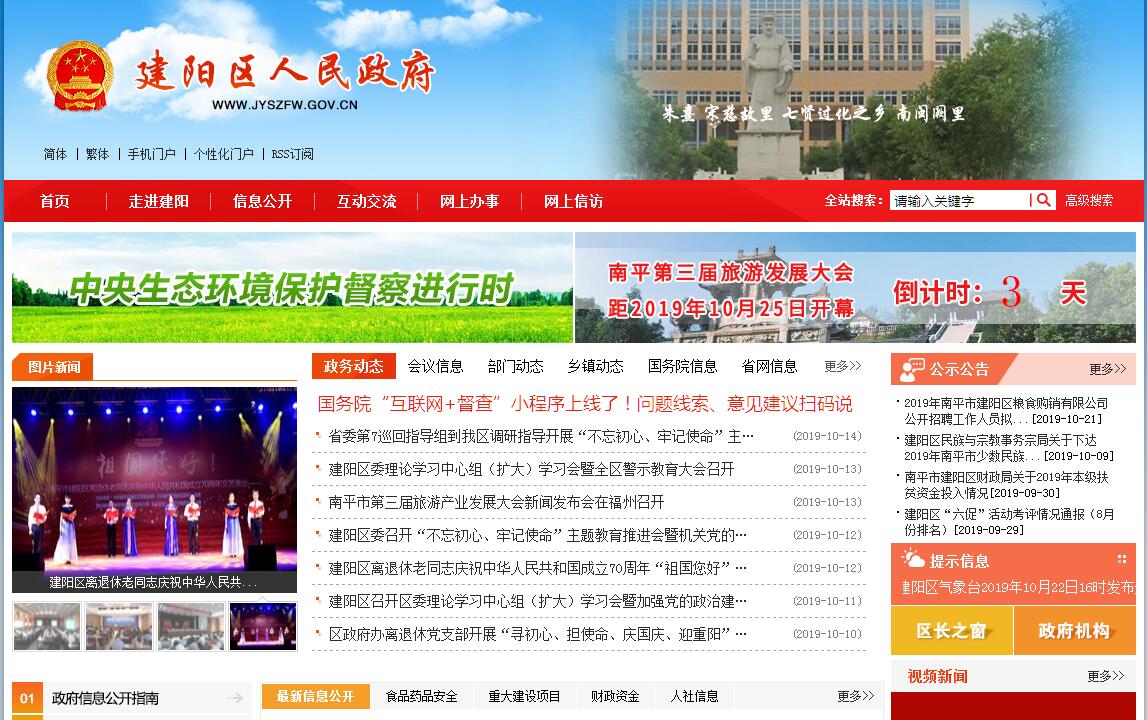 建阳别称潭城,现辖8镇3乡2街道,194个行政村,30个居委会,面积3383平方公里,区域面积全省第三,人口35.7万,人文环境包容和谐。建国后先后两次作为地区行署驻地,历时25年。1994年撤县设市,2015年3月18日撤市设区。主要区情:历史文化悠久。公元205年置县,距今1813年,是福建省最早设置的五县之一,获评中国地名文化遗产“千年古县”,素有“七贤过化之乡”“南闽阙里”之称,是“世界法医学鼻祖”宋慈、程门立雪主人公游酢的家乡,宋代理学家、教育家、哲学家朱熹的故里。建阳文化昌盛,为宋代八大窑之一“建窑”原产地、“中国建窑建盏之都”,建窑建盏被列入全国非物质文化遗产保护名录,“建阳建盏”获得国家地理标志证明商标、国家地理标志保护产品。建阳为宋代三大印刷中心之一,享有“图书之府”“建本之乡”的美誉。闽北区位中心。与南平市下属十个县(市、区)中除延平区外的8个县(市)接壤,是离“双世遗”武夷山风景区最近的县(市、区)。建阳为武夷新区核心区所在地,南平市行政中心将于2018年有序启动搬迁建阳,是一座能容纳60万人口的闽北新兴中心城市,将成为闽北的政治、经济、文化中心。交通方便快捷。距武夷山机场约40公里。浦南、武邵、宁武高速公路贯穿境内,横南铁路、京福高铁和规划建设中的浦建龙梅快速铁路在此交汇,迁建武夷国际新机场选址在建阳,形成“铁、公、机”三位一体的现代立体交通网络,成为闽浙赣三省重要的交通枢纽和物流集散地。生态资源丰富。建阳是国家级生态示范区,是全球同纬度生态环境最好的地方。森林面积18万公顷,森林覆盖率76.4%,为全国南方重点林区。物产丰饶,葡萄、桔柚、茶叶、食用菌等特色现代农业名扬省内外,是中国优质果品基地重点县、全国商品粮基地、中国锥栗之乡,“建阳桔柚”“ 建阳白茶”“小湖杨梅”获得国家地理标志产品保护、国家地理标志证明商标。近年来,建阳区全面贯彻落实习近平新时代中国特色社会主义思想和党的十九大精神,全面落实“五位一体”总体布局和“四个全面”战略布局,按照“再上新台阶、建设新福建”、“建设全国绿色发展示范区”的部署要求,把握经济发展新常态,抢抓南平迁驻建阳机遇,全面融入武夷新区建设,扎实做好稳增长、调结构、促改革、惠民生各项工作,加快高质量发展、绿色发展、赶超发展,经济社会发展和党的建设各项事业取得新成效。三次荣获全省县域经济发展“十佳”县(市)称号,创业竞赛、绩效考评持续保持在南平市前列。先后被评为全国粮食生产先进县、全国科普示范市、中国民间文化艺术之乡、中国特色竹乡、中国乡村民宿发展示范县、福建省十大醉美县城、省级森林城市、省级双拥模范城、省级文明城市。