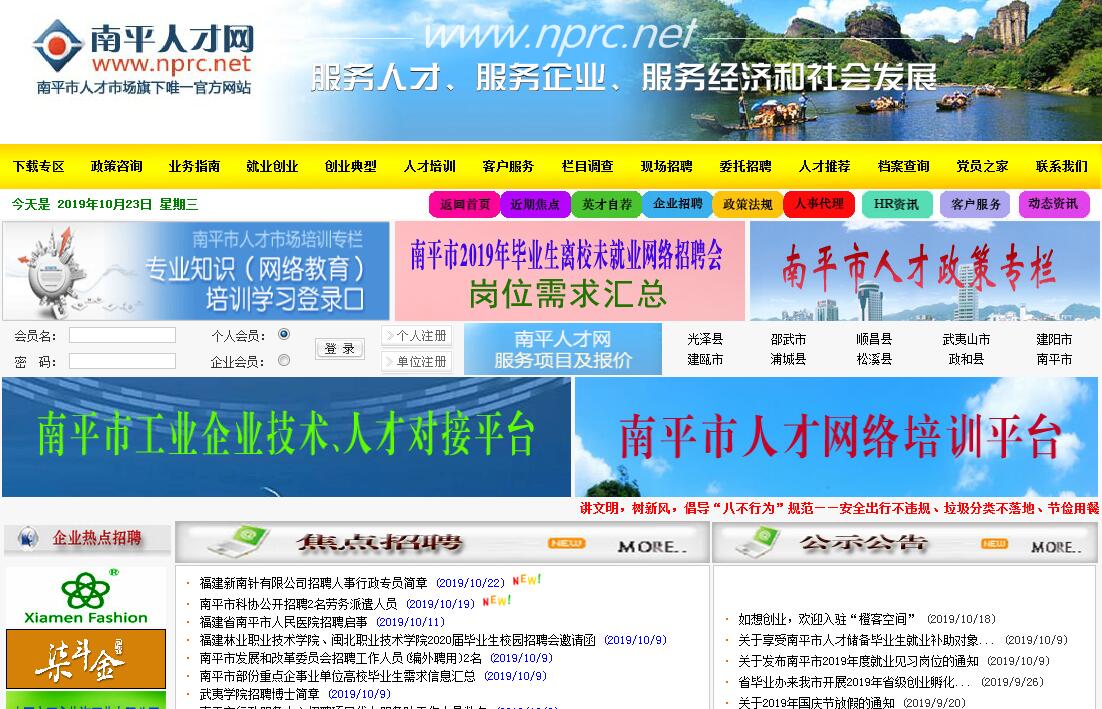南平人才网是南平市人才市场唯一官方网站。南平市人事人才公共服务中心、南平市大中专毕业生就业工作中心、南平市人才市场业务部门有:(一)人事代理部,主要工作职责如下:1、流动人员人事档案管理。档案的接收和转递;档案材料的收集、鉴别和归档;档案的整理和保管;为符合相关规定的单位提供档案查(借)阅服务;依据档案记载出具存档、经历、亲属关系等相关证明;为相关单位提供入党、参军、录用、出国(境)等政审(考察)服务;组织关系转接。联系电话:0599-8833930。2、人事代理(人力资源服务外包)。流动人员行政工资关系转接,毕业生就业登记(应届毕业生就业协议签章),毕业生转正定级,人事代理人员职称聘任,委托办理档案工资核算调整,年度考核,企业基本养老保险、职工医疗保险、住房公积金等代收代缴,代缴基本养老保险人事代理人员退休手续的申报,集体户籍挂靠和婚育管理。联系电话:0599-8833930。3、各类普通全日制大中专毕业生学籍档案的接收、转递、查询、管理等;依据档案记载出具相关证明和提供政审服务。联系电话:0599-8833299。(二)人才交流和培训部,主要工作职责如下:1、人才交流。举办人才招聘会、南平人才网会员注册和招聘信息发布、人才求职登记和推荐、组织单位赴区外招聘、人才引进、人才储备、招募高校毕业生服务社区、毕业生就业指导和就业服务、人才资信认证(学历、职称等证书真伪鉴定)。联系电话:0599-8852732,在线QQ:527140971。2、人才培训。各类专业知识(公共课程)网络培训、专业技术人员继续教育培训、提升技术能力和素质的社会化委托培训、人才测评、各类人事和职称证书的制售。联系电话:0599-8852732,在线QQ:527140971(三)毕业生就业工作中心。主要工作职责如下:毕业生报到、落户、调整就业,市属中职学校毕业生《就业报到证》签发和补发,离校未就业毕业生实名登记、就业指导、就业创业政策咨询和宣传、“三支一扶”、就业见习、市属普通高校毕业生求职补贴申请、省级创业资助项目申报、高校毕业生自主项目入驻创业孵化基地、大学生创业培训。联系电话:0599-8858560。