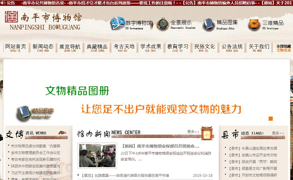 南平市博物馆现为地区级国立综合性博物馆,1984年开始筹建,1986年10月正式开馆,1994年南平撤地改市,原南平市改为延平区,南平市博物馆同时升格为地级馆。原址位于南平市新华路4号,馆舍面积600平方米。南平市博物馆新馆位于南平市马坑路266号,占地面积4171平方米,建筑面积6368平方米。2005年开工建设, 2011年11月28日新馆开馆并免费开放。区域划分及功能:博物馆新馆共七层,其中:负一楼为临时综合展厅,其中展厅面积约1200平方米;一层为精品文物临展厅,其中展厅面积550平方米;二至四楼为基本陈列展厅,合计展厅面积2200平方米,用于《闽北五千年》基本陈列展览;五楼为文物库房及业务用房;六楼为学术报告厅。南平市博物馆现有馆藏文物5461件(套),其中一级品2件(套),二级品45件(套),三级品2006件(套)。有历代陶瓷精品、古钱币、玉器、字画、铁器、青铜器、文房四宝、木古雕等。其中原馆藏珍品“郑和铜钟”现已被中国国家博物馆收藏并展出。近年来,南平市博物馆先后被授予“福建省二级博物馆”、“福建省国防教育基地”、“福建省爱国主义教育基地”、 “福建省全民国防教育先进单位”、“南平市爱国主义教育基地”、“南平市精神文明单位”、“南平市党员优质服务示范窗口”、“厦门大学文物与博物馆学闽北实习基地”、“延平区青少年德育基地”等荣誉称号。南平市博物馆现有的经费主要来源有国家免费开放专项经费,省级专项补助经费,市级财政给予的运行专项经费,这些财政拨款基本保障了博物馆的免费开放运行。上级给予经费主要用于以下几个方面:博物馆馆舍维护、免费开放运营、举办临时展览、文物征集和保护、田野考古、专业人员培养等方面。
