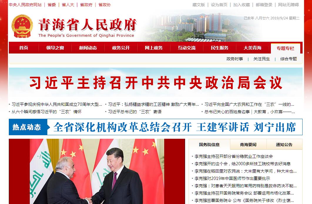 “中国青海”政府门户网站是在省委、省政府领导亲自关心、指导下建立和发展起来的政府门户网站,始终坚持以努力建设“服务政府、责任政府、法治政府”为目标,以“为民、便民、利民”为宗旨,以发布政府信息、拓展网上办事、提供便民服务和开展互动交流为主要内容。“中国青海”政府门户网站开设“政府信息公开、办事服务、政民互动、民生服务、大美青海、民族服务、专题专栏”等320个栏目。网站建设以服务公众为中心,以社会需求为导向,及时、准确地发布政务信息;不断梳理和整合政府公共服务事项,不断增加网上服务;稳步开展政府与公众的互动交流,以便于公众参与。“中国青海”政府门户网站由青海省人民政府主办,中共青海省委宣传部主管,青海省互联网新闻中心承办,网站内容由省政府各部门和各州(地、市)政府(行署)及相关企事业单位共同保障。“欢迎您提出宝贵意见!”青海,简称“青”,是中华人民共和国省级行政区。省会西宁,位于中国西北内陆,青海界于北纬31°36′-39°19′,东经89°35′-103°04′之间,北部和东部同甘肃相接,西北部与新疆相邻,南部和西南部与西藏毗连,东南部与四川接壤,青海省总面积72.23万平方千米。青海省地势总体呈西高东低,南北高中部低的态势,西部海拔高峻,向东倾斜,呈梯型下降,东部地区为青藏高原向黄土高原过渡地带,地形复杂,地貌多样。青海省地貌复杂多样,五分之四以上的地区为高原,东部多山,西部为高原和盆地,兼具青藏高原、内陆干旱盆地和黄土高原三种地形地貌,属高原大陆性气候,地跨黄河、长江、澜沧江、黑河4大水系。截至2017年底,青海省下辖2个省辖市,6个自治州,4个县级市,27个县,7个自治县,6个市辖区。截至2017年末,青海省常住人口598.38万人,实现地区生产总值2642.80亿元,第一产业238.41亿元,第二产业1180.38亿元,第三产业1224.01亿元,人均地区生产总值实现44348元。