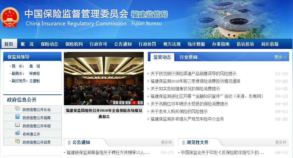 2000年6月21日,经中国保险监督管理委员会批准,中国保险监督管理委员会福州特派员办事处(简称福州保监办)开始筹建,2000年9月21日正式挂牌成立。2004年2月6日,经国务院和中国保监会批准更名为中国保险监督管理委员会福建监管局(简称“福建保监局”),并升格为正局级单位。2004年6月根据保监会的统一安排,内设处室进行重新设置,由原来3个处室调整为6个处室,分别是:办公室(党委办公室)、财产保险监管处、人身保险监管处、保险中介监管处、统计研究处、人事教育处(党委组织部、党委宣传群工处、纪检监察处)。2007年12月,根据保监会统一部署,增设法制处。2011年,增设稽查处。2015年,增设保险消费者权益保护处、监察处(纪委办公室)。福建保监局作为中国保监会的派出机构,主要履行以下职责:(一)贯彻执行国家有关法律、法规和方针、政策,研究制订辖区内保险业发展战略规划;(二)依据中国保监会的授权,依法对辖区内保险机构、保险中介机构的经营活动进行监督管理;(三)根据中国保监会的规章,制订辖区内保险市场监管的相关实施细则、具体办法和工作措施;(四)依法查处辖区内保险违法、违规行为,维护保险市场秩序,依法保护被保险人利益;(五)监测、分析辖区内保险市场运行情况,预警、防范和化解辖区内保险风险,并将有关重大事项及时上报;(六)负责辖区内保险公司分支机构、保险中介机构及其分支机构的市场准入、退出等有关事项的审批和管理工作;(七)负责审查核准相关高级管理人员的任职资格;(八)负责管理有关的保险条款及费率;(九)归口管理辖区内保险行业协会、保险学会等行业社团组织;(十)中国保监会和福建省委、省政府交办的其他事项。