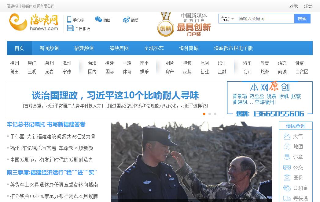 | 网站简介: 海峡网(原海都网)是由福建日报报业集团主管,海峡都市报官方网站(www.hxnews.com)。下设;海峡都市报电子版、福建、福州、闽南、厦门、泉州、漳州、莆田、宁德、三明、龙岩、国际、国内、台海、娱乐、体育等新闻栏目以及教育、房产、汽车、家居、健身、论坛等生活频道,丰富您的福建在线生活。我们用权威、准确、及时的原创新闻努力打造福建最大的新闻门户网站。 |