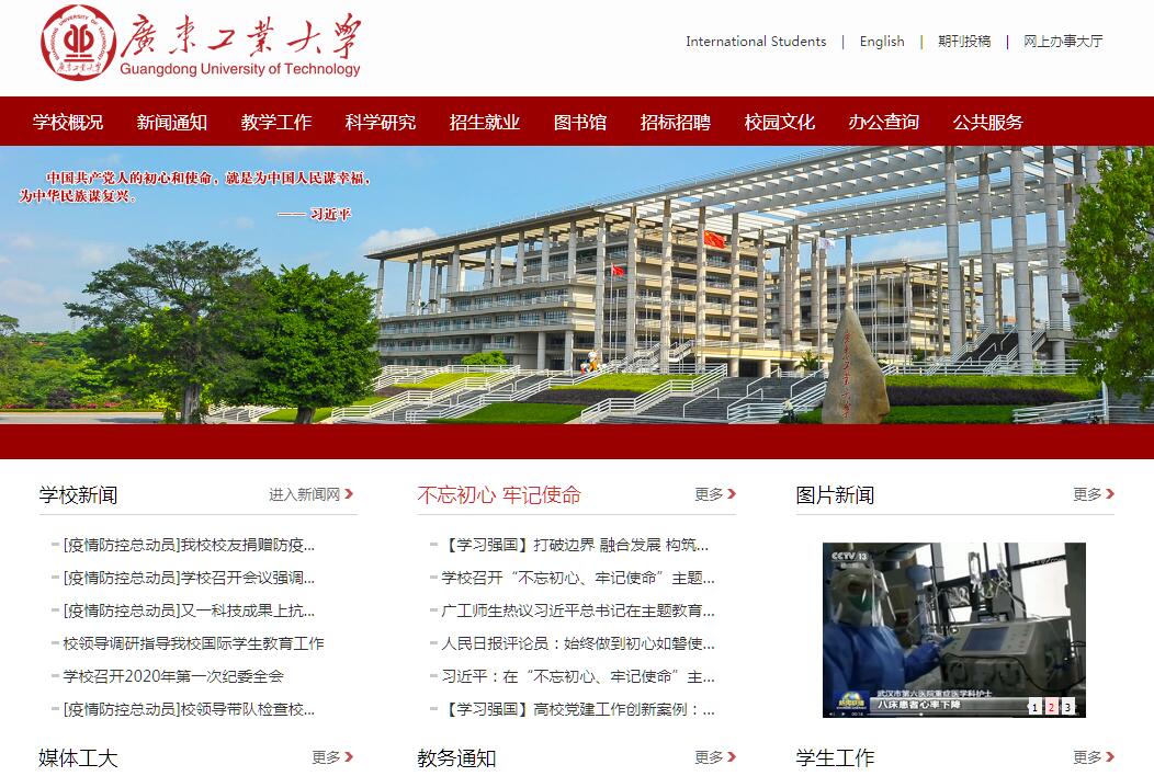 广东工业大学由原广东工学院、广东机械学院和华南建设学院(东院)于1995年6月合并组建而成。学校已有近60年的办学历史,是一所以工为主、工理经管文法艺结合的、多科性协调发展的省属重点大学,是广东省高水平大学重点建设高校。学校坐落在中国南方名城广州,地理位置优越,校园占地总面积3066.67亩,拥有大学城、东风路、龙洞等多个校区。大学城校区突出工科特色,多个学科相互促进协调发展,创设多个协同创新科研平台。东风路校区突出艺术创意和社工服务氛围的营造,建有设计创意园和成果展示馆。龙洞校区突出管理学与理学氛围的营造,打造环境优美、恬静怡人的花园式校园。目前,学校共设有19个学院、4个公共课教学部(中心)、5个博士后科研流动站、4个省攀峰重点学科一级学科、6个省优势重点学科一级学科、5个省特色重点学科二级学科、7个一级学科博士学位授权点、31个二级学科博士学位授权点、23个一级学科硕士学位授权点、92个二级学科硕士学位授权点,具有工程(17个领域)、工商管理、工程管理、会计、翻译、社会工作、金融、艺术8种硕士专业学位授予权,同时具有同等学力人员申请硕士学位授予权。学校现有85个本科专业,自2014年起,所有本科专业均在广东省普通高等学校第一批本科录取批次招生。机械、信息、材料、化工四个学科为广东省“211工程”三期重点建设学科。2012年以来,工程学科位居ESI世界排名前1%行列。2017年7月,材料科学进入ESI世界排名前1%行列。学校提出“以更加解放的思想、更加开放的姿态、更加创新的体制机制、更加勤奋务实的工作作风,集聚海内外创新人才,多模式构建创新平台,营造创新氛围,培养创新人才”的发展思路,全面实施大学生创新行动计划、研究生拔尖创新人才培育计划、研究生优质生源“千苗计划”、师资队伍建设“百人计划”、“培英育才计划”以及团队平台重大成果培育计划等重大战略。近年来,学校在师资队伍、学术科研、人才培养等方面发展迅速,成效显著。学校高度重视师资队伍建设,师资力量不断增强。学校有职称自主评审权,现有专任教师2000多人,其中正高级职称300多人,副高级职称700多人。2011年以来,学校已引进“百人计划”特聘教授百余名和3名学院院长。其中“长江学者”9人、国家“杰青”9人、国家“千人计划”教授17人、国家“优青”5人、国家”青年千人”教授11人、教育部“新世纪优秀人才”5人、广东省“领军人才”7人、广东省“珠江学者”23人、广东省“杰青”10人等,同时还聘有外籍院士4人、中国工程院院士4人,已组建并入选广东省“创新团队”9个。高素质师资队伍的建设,为学校人才培养提供了强有力的支撑保证。目前全日制在校生45000余人,其中本科生38000余人,研究生7000余人,并招有不同层次的成人学历教育学生、港澳台生和外国留学生,已形成“学士-硕士-博士”完整的人才培养体系。学校坚持把科研工作紧密结合广东经济和社会发展需求,坚持不懈地走产学研相结合的道路,科研整体实力不断增强。学校建设有国家地方联合工程实验室1个、国家地方联合工程研究中心1个、国家发改委现代服务业产业集聚基地1个、教育部重点实验室1个、教育部国际合作联合实验室1个,广东省实验室1个以及其他省级科研平台77个。2017年,学校国家自然科学基金项目突破130项,位列全国高校第八十位;发明专利申请公开数1929件,位列全国高校第八位。近三年,学校科研成果荣获国家科技进步二等奖1项、省部级科学技术奖一等奖6项、中国专利优秀奖4项、教育部高等学校科学研究优秀成果奖(人文社会科学)1项、广东省哲学社会科学优秀成果奖一等奖3项。此外,学校还与地方政府和工业界联合建立了“广州国家现代服务业集成电路设计产业化基地”、“东莞华南设计创新院”、“佛山广工大数控装备协同创新研究院”、“河源广工大协同创新研究院”等多个跨学科协同创新平台,推进广东国防科技工业技术成果产业化应用推广中心落地,前期投入6亿元资助中心建设。目前学校正努力在精密装备、IC设计、工业设计、制药、软物质等领域构建高水平研发平台,促进产学研和协同创新取得实质性成果。学校致力于培养有国际视野、有坚实基础、有创新能力的人才。现有7个教育部卓越工程师教育培养计划专业,7个国家级特色专业建设点,1个国家级专业综合改革试点专业, 18个省级特色专业,13个广东省名牌专业,5个省级重点专业,16个省级专业综合改革试点专业;3门国家级精品课程(含双语教学示范课程),91门省级精品课程(含双语教学示范课程);7个国家级工程实践教育中心、2个国家级研究生联合培养示范基地、1个国家级大学生实践教学基地、38个省级大学生实践教学基地;3个国家级实验教学示范中心,1个国家级虚拟仿真实验教学中心,24个省级实验教学示范中心,3个省级虚拟仿真实验教学中心;1个国家级教学团队。学校办学条件良好,现有计算机15271台套,教学、科研仪器设备固定资产总值12.55亿元。校舍建筑面积156万余平方米。图书馆拥有藏书377.3万册、电子图书224.6万册,并采用共享方式,多渠道、大幅度拓展了信息资源使用范围。学校从学生成才观的理念转变抓起,探索性实施了“重基础、强能力、宽视野、多样性、有担当”的培养方案改革,着力探索以