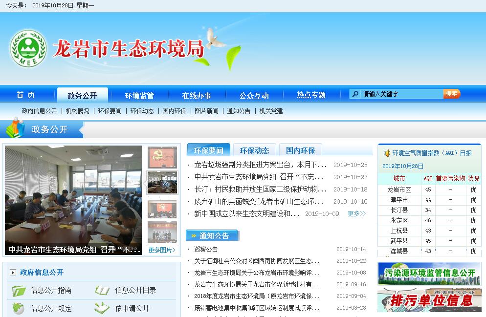 龙岩市生态环境局主要职责:(一)贯彻执行国家、省环境保护方针、政策、法律、法规;组织拟定我市环境保护规范性文件、并监督执行;组织对我市环境保护工作实施统一监督管理;受市政府委托对我市内重大经济政策、发展规划和重大经济开发计划进行环境影响评价。(二)拟定我市环境保护计划和规划;参与编制我市可持续发展刚要的中长期规划、计划;组织拟定和监督实施我市重点流域、重点区域污染防治规划和生态保护规划;组织编制全市环境功能区划;负责审核城市总体规划中的环境内容;组织编制全市环境质量报告书;发布全市环境状况公报;定期发布重点城市和流域环境质量状况。(三)负责对我市大气、水体、土壤、噪声、固体废物、有毒化学品以机动车等的污染防治法规和规章的组织实施。(四)监督对生态环境有影响的 自然资源开发利用活动、重要生态环境建设和生态破坏恢复工作;监督检查各种类型自然保护区以及风景名胜区、森林公园环境保护工作;监督检查生态多样性保护、野生动植物保护、湿地环境保护工作;向省、市政府提出新建的各类自然保护区审查、报批建议;监督管理省级和市级自然保护区。(五)指导和协调解决市内部门或(市、区)地域间的 重大环境问题;调查处理重大环境污染事故和生态破坏事件;处理涉及市外环境就纠纷;组织和协调重点流域水污染防治工作;负责环境监理和环境保护行政稽查;组织开展全市环境保护执法检查活动。(六)贯彻执行各项环境管理制度,按照国家和省规定进行开发建设活动环境影响报告书(表)的审定;指导城乡环境综合整治;负责农村生态环境保护;指导我市生态示范区建设和生态农业建设。(七)组织环保科技省标准发展、科学研究和技术示范工作;管理全市环境管理体系和环境标志认证;指导和推动环境保护产业发展;监督实施环境保护国家标准、省标准和环保行业标准。(八)指导市区环境检测、环境统计和环境信息工作;负责监督执行环境检测制度和规范;组织建设和管理我市环境检测网;组织对我市环境质量监测和各类污染源监督性监测;指导和检查市、县(市、区)环境监测站的计量认证、规范化建设和质量保证工作。(九)承担我市对外环境保护科技协作和交流工作;负责申请、审核全市对外环境保护协作项目和引进资金、技术。(十)组织全市国际环境保护公约的履行活动;管理市内有关的环境保护国际合作项目和利用外资项目。(十一)负责组织、指导全市环境保护宣传教育,协调、指导和检查有关部门在大、中、小学和成人教育、培训中开展环境教育和社会环境宣传教育工作;推动公众和非政府组织参与环境保护。(十二)管理市环保局及直属单位机构编制和人事;指导全市环境保护队伍建设,规划与组织指导全市环境保护系统在职人员岗位培训和继续教育;落实和履行县(市、区)环保局领导干部协管职责。(十三)承办市政府环境保护委员会的各项具体工作,协调各相关部门齐抓共管我市环境保护工作。(十四)承办市委、市政府交办的其他事项。