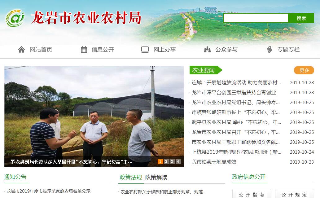 龙岩市农业农村局主要职责:(一)贯彻执行党和国家及省委、省政府有关农业、农村的法律、法规和政策,研究起草并组织实施农业(种植业、畜牧业、渔业、农业机械化、农垦等,下同)和农村经济的地方性政策;参与拟订各项涉农政策;组织、指导农业执法工作。(二)承担市委农村工作领导小组日常工作;负责了解掌握和监测分析农业、农村经济运行和农业、农村工作情况;开展“三农”重大问题的调研,提出决策参考意见和建议。(三)负责完善农村经营管理体制;参与拟订农村经济体制改革方案,指导农村土地承包、土地承包经营权流转和土地承包经营纠纷调解仲裁管理工作;指导农民负担监督管理、村民筹资筹劳、农村集体资产和财务管理工作;指导和扶持农村合作经济组织、农民合作社、家庭农场建设与发展。(四)承担市扶贫开发领导小组的日常工作;研究拟订并组织实施扶贫开发规划、政策;组织落实专项扶贫开发项目的实施;协助做好财政专项扶贫资金的监管;协调开展行业和社会扶贫工作;负责有关扶贫的对外交流与合作。(五)统筹指导农村工作机制创新和社会主义新农村建设;会同有关部门推进农村社会事业发展,指导农村基层建设和农业农村社会化服务体系建设;会同有关部门研究拟订并指导实施新农村建设、农村小康建设规划和政策措施;会同有关部门推进农业和农村信息化建设,负责农业和农村经济信息管理和服务。(六)指导粮食、经济作物、畜禽产品、水产品等主要农产品生产,组织落实促进粮食等主要农产品生产的相关政策措施,引导农业产业结构调整和产品品质的改善;按规定承担农业固定资产投资的相关工作,组织扶持农业农村发展的项目申报、农业专项资金的计划安排管理和监督检查。(七)牵头研究起草和指导实施特色现代农业发展规划,推进现代农业示范区等专项建设;拟订并指导实施农业产业化、农产品加工业的发展规划和政策措施,组织实施重点龙头企业及产业化示范基地建设;指导农业机械化发展;会同有关部门指导食品产业的组织实施和项目服务;培育、保护和发展农产品品牌;指导农业行业协会建设与发展。(八)指导农业安全生产工作,负责检查、督促和指导农业产业的安全生产标准化建设工作,负责种植业、畜牧业、渔业安全生产监督管理;指导农机安全监理工作;指导渔业船触作业安全生产监管;负责种植业、畜牧业、渔业突发事件应急指挥、处置、救援等综合协调和监督管理工作。(九)负责食用农产品从种植养殖到批发、零售市场或生产加工企业前的质量安全的监督管理,负责兽药、饲料、饲料添加剂和职责范围内的农药、肥料等其他农业投入品质量及使用的监管;依据有关规定负责畜禽屠宰监管工作;贯彻执行农产品质量安全及相关农业生产资料国家标准,并会同有关部门监督实施;承担农业标准化有关工作;组织、指导农业检验检测体系建设;依法实施农产品质量安全认证与监督管理。(十)组织、协调农业生产资料市场体系建设;依法实施农作物种子(种苗,不含林木种苗和花卉)、食用菌菌种、草种种畜禽、水产苗种、农药、兽药、饲料、饲料添加剂的监督管理;负责兽医医疗器械和有关肥料的监管工作。(十一)拟订动植物疫病防控计划并组织实施,指导动植物防疫和检疫体系建设;组织、监督动植物(不含森林植物、花卉、野生和水生动物)境内的防疫、检疫工作;依法发布疫情并组织扑灭;组织兽医医政、兽药药政药检工作,负责官方兽医、执业善医、乡村兽医管理相关工作;监测、发布农业灾情,组织种子兽用疫苗、消毒剂等救灾物资储备和调拨,指导紧急救灾和灾后生产恢复。(十二)拟订农业科技示范、农技推广的规划、计划和相关政策,指导农技推广体系改革与建设;会同有关部门开展农业科技创新体系和产业技术体系建设,组织实施农业高新技术和应用技术研究、技术引进、农业科技成果转化和技术推广;组织实施新型职业农民培育、村级农民技术员、动物防疫员和农村实用人才培训与管理工作;依法开展农业植物新品种保护和农业转基因生物安全监督管理工作;参与农业系统劳模的评选和组织指导农民体育健身活动。(十三)组织农业资源区划工作,指导农用地、渔业水域、草地、宜农湿地以及农业生物物种资源的保护和管理;组织实施耕地及基本农田质量保护和改良政策,依法管理、培肥地力。(十四)会同有关部门拟订并组织实施农业生态建设规划,指导农村可再生能源综合开发与利用,指导农业生物质产业发展提出农产品禁止生产区域建议,依法对农业资源保护实施监督管理,根据国务院和省有关文件规定的职责分工负责畜禽养殖污染防治相关工作;牵头管理外来物种(不含林木资源、陆生野生动物)。(十五)研究拟订农垦发展政策,指导农垦系统深化改革;组织和指导国有农场基础设施建设和土地利用工作。(十六)负责渔业管理工作,指导水产养殖业发展;组织水生动植物病害防治工作;依法承担生产环节水产品质量安全监督管理工作;指导水产品加工流通,参与品牌培育和市场体系建设;依法管理与保护渔业环境与渔业资源;组织重要涉渔工程环境影响评价和生态补偿工作。(十七)组织开展农业贸易促进和有关农业经济、技术对外交流与合作;拟订我市与台湾农业合作及农业合作实验园区、台湾农民创业园