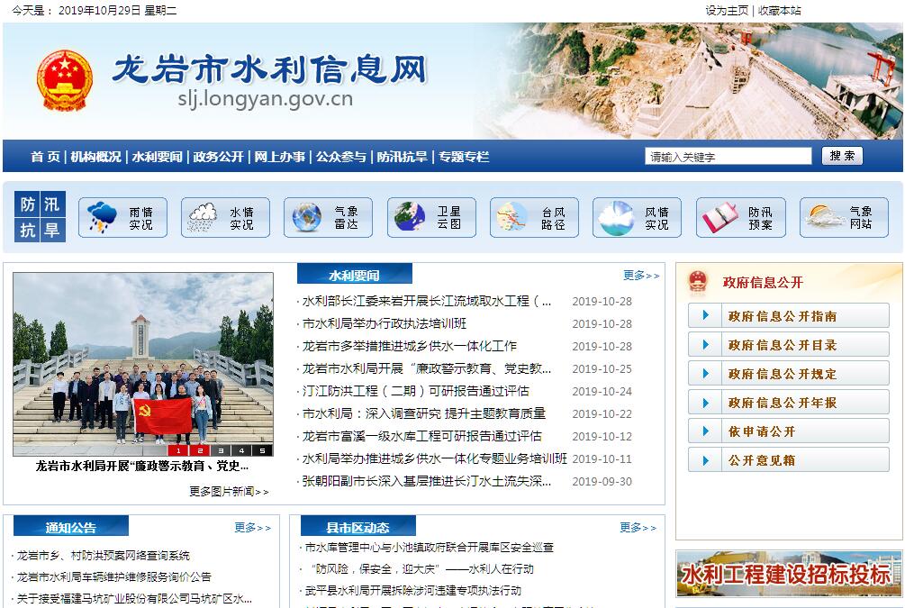根据中共福建省委办公厅、福建省人民政府办公厅《关于印发<龙岩市人民政府机构改革方案>的通知》(闽委办[2010]91号)和中共龙岩市委、龙岩市人民政府《关于龙岩市人民政府机构改革的实施意见》(岩委[2011]86号),设立龙岩市水利局,为市人民政府组成部门,正处级。其主要职责:(一)贯彻执行国家、省有关水利工作的法律法规和政策,起草并组织实施水利工作的政府规章和政策;组织编制全市的重要江河流域综合规划、防洪规划等重大水利规划;按规定制定水利工程建设相关制度并组织实施,负责提出水利固定资产投资规模和方向;提出市水利建设投资安排建议并组织实施。(二)负责保障水资源的合理开发利用。负责生活、生产经营和生态环境用水的统筹兼顾和保障;实施水资源的统一监督管理,会同有关部门拟订全市和跨县(市、区)水的中长期供求规划、水量分配方案并监督实施;组织开展水资源调查评价工作,按规定开展水能资源调查工作,负责重要流域、区域以及重大调水工程的水资源调度;组织实施取水许可、水资源有偿使用制度和水资源论证、防洪论证制度;指导水利行业供水和乡镇供水工作。(三)负责水资源保护工作。组织编制水资源保护规划,会同环境保护行政主管部门和其他有关部门组织拟订重要江河的水功能区划并监督实施;核定水域纳污能力,提出限制排污总量建议,指导饮用水水源保护工作,指导地下水开发利用和城市规划区地下水资源管理保护工作。(四)负责防治水旱灾害,承担市政府防汛抗旱指挥部的日常工作。组织、协调、监督、指挥全市防汛抗旱工作,对重要江河和重要水工程实施防汛抗旱调度和应急水量调度,编制市防汛抗旱应急预案并组织实施。指导水利突发公共事件的应急管理工作。(五)负责节约用水工作。拟订节约用水政策,编制节约用水规划,制订有关标准,指导和推动节水型社会建设工作。(六)指导水利设施、水域及其岸线的管理和保护,指导主要江河、河口的治理和开发,组织、指导江堤建设,指导水利工程建设与运行管理,组织实施具有控制性的或跨县(区、市)及跨流域的重要水利工程建设与运行管理。(七)负责防治水土流失。拟订水土保持规划并监督实施,组织实施水土流失的综合防治、监测预报并定期公告,负责有关重大建设项目水土保持方案的审批、监督实施及水土保持设施的验收工作,指导市重点水土保持建设项目的实施。(八)指导农村水利工作。组织协调农田水利基本建设,指导农村饮水安全、节水灌溉、泵站改造、雨水集蓄利用等工程建设与管理工作,指导农村水利社会化服务体系建设;按规定指导农村水能资源开发工作,指导水电农村电气化和小水电代燃料工作;承担5万千瓦及以下小水电建设行政管理工作。(九)负责重大涉水行政违法(不含治安违法)案件的查处,协调、仲裁跨县(区、市)水事纠纷,指导水政监察和水行政执法。依法负责水利行业安全生产工作,组织、指导水库、水电站大坝的安全监管;指导水利建设市场的监督管理,组织实施水利工程建设的监督;负责全市河道采砂规划的审批,组织实施对河道采砂的监督、管理。(十)负责水利科技和外事工作。组织、指导水利行业质量监督工作,组织实施水利行业的技术质量标准和水利工程的规程规范;组织重大水利科学研究、技术引进和科技推广;办理水利有关涉外事务。(十一)承办市委、市政府交办的其他事项。