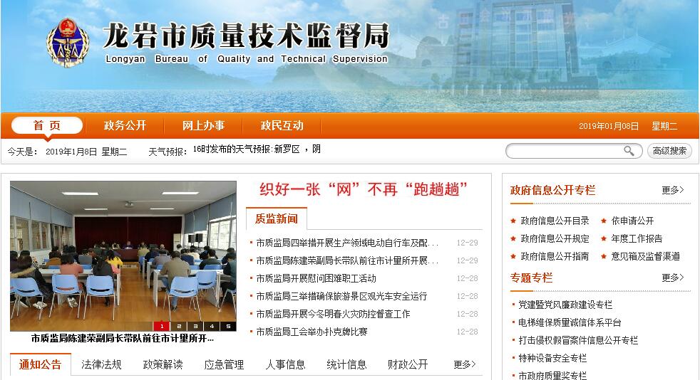 龙岩市质量技术监督局主要职责:(一)贯彻执行国家质量技术监督法律、法规和政策,负责质量技术监督工作相关法律、法规的组织实施和行政执法工作,指导所辖县(市、区)质量技术监督行政执法工作。(二)负责质量宏观管理,组织实施国务院《质量发展纲要》和省、市质量发展计划以及政府质量工作考核;组织质量强市工作,实施政府质量奖制度;落实名牌发展战略,负责管理名牌产品评选工作;负责产品质量诚信体系建设,组织重大产品质量事故调查,协助实施缺陷产品召回制度。会同有关部门实施重大工程设备质量监理制度。(三)负责产品质量安全监督工作,管理产品质量安全强制检验、风险监控、监督抽查工作,编制实施产品质量监督抽检计划,组织产品质量监督检验的后处理工作;负责工业产品生产许可证管理工作和监督;负责食品相关产品获证企业证后监督管理工作;受理产品质量申诉,按规定权限组织产品质量安全仲裁检验、鉴定;组织开展产品质量安全专项整治工作,依法查处产品质量违法行为,承担市打假办的日常工作。(四)负责统一管理全市计量工作,推行法定计量单位和国家计量制度,依法管理计量器具及量值传递和比对工作,监督管理计量检定机构、社会公正计量机构及计量检定人员的资质资格,监督管理商品量、市场计量行为和计量仲裁检定;负责机动车安全技术检验机构设置的监督管理。(五)负责统一管理全市标准化工作,负责管理采用国际标准产品标志工作;负责企业产品标准备案工作;监督检查标准实施情况;组织实施国家地理标志产品保护工作;按规定负责商品条码工作。(六)承担特种设备的安全监察、监督工作,负责特种设备应急预警、事故预防和调查处理及分析评估工作;监督检查高耗能特种设备节能标准的执行情况;按规定权限监督检查危险化学品包装物、容器的质量。(七)负责统一管理全市认证认可工作,监督管理全市认证认可活动;根据授权负责全市实验室和检查机构资质认定和监管工作。负责制定并组织实施质量技术监督的科技发展和技术机构建设规划,负责相应的科研和技术引进工作。(八)承办市委、市政府交办的其他事项。