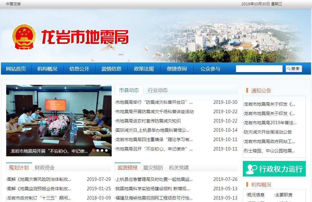 龙岩市位于福建省西部,通称闽西,辖新罗区、永定区、漳平市和上杭、武平、长汀、连城四县,总人口302.55万人,总面积1.91万平方公里。是全国著名革命老区;享誉海内外的客家祖地和著名侨区;福建重要的矿区、林区;海峡西岸新兴旅游区;海西加快崛起的新兴城市。区内政和—海丰、邵武—河源、永安—晋江和上杭—云霄4条地震构造带纵贯全市,地震地质构造较为复杂,具有发生中强地震的地质构造背景,在国务院划定的全国25个地震重点监视防御区内。1976年唐山地震后,龙岩地区为加强防震减灾工作,成立了龙岩地区地震办公室,1983年撤销。1993年根据当时的震情形势,恢复龙岩地区地震办公室,1996年更名为龙岩地区地震局,为地区行署直属副处级办事机构。1997年撤地设市后,更名为龙岩市地震局,2005年升格为正处级,是主管全市防震减灾工作,依法行使防震减灾行政执法职能的工作部门,内设综合科、业务科、应急救援科、行政审批科、监测预报科。多年来,在龙岩市委、市政府的正确领导下,在省地震局的关心指导下,我市防震减灾工作全面启动,并取得卓有成效的工作业绩。2008年、2014年和2016年三次获得全国地市防震减灾工作先进单位荣誉称号;2007-2016年,9次获得全省市级防震减灾工作综合评比一等奖。其主要职责:贯彻执行国家、省有关防震减灾法律、法规和规章,负责组织编制本行政区域内的防震减灾规划,负责建立和管理地震监测预报、震灾预防、地震应急和紧急救援工作体系,负责防震减灾知识的宣传教育,承担龙岩市人民政府抗震救灾指挥部办事机构职责,指导全市各县(市、区)地震办公室防震减灾工作。