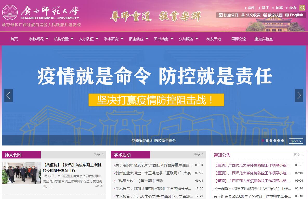 广西师范大学是国家教育部与广西壮族自治区人民政府共建高校、“中西部高校基础能力建设工程项目”高校。有王城、育才、雁山3个校区,校园面积4100多亩;在职教职员工2355人,全日制本科生26831人,硕士生6386人,博士生171人,各类留学生近1600人,成人教育学生16000多人。经过建设发展,已成为一所教师教育特色鲜明、文理学科均名列全国百强、国际交流合作广泛的综合性大学。学校前身——广西省立师范专科学校创办于1932年,是广西高等师范教育的开端,是中国最早的高等师范学校之一,曾六次更名,八次迁址,四度调整。抗战时期,与西南师范学院、昆明师范学院一起,成为抗日大后方著名的三所高等师范院校,并被誉为“西南民主堡垒”。1943~1978年,是广西唯一一所培养本科学历教师人才的高校。1983年更名为广西师范大学。建校以来,杨东莼、薛暮桥、陈望道、欧阳予倩、林砺儒、陈翰笙、夏征农等一大批知名人士和专家学者荟萃学校,秉承“尊师重道、敬业乐群”的校训精神,执教治学,弘文励教,为国家尤其是广西培养了30多万名教师和其他专业人才。2012年,中共中央政治局委员、国务委员刘延东视察学校时,勉励师生“建设有特色高水平的一流大学”。现建制教学学院(部)21个,全日制普通本科专业78个,硕士学位授权一级学科27个、专业硕士学位授权点19个,博士学位授权一级学科6个,博士后科研流动站3个,广西(高校)重点学科35个,学科专业涵盖了除军事学外的12大门类,文科的学科门类、博士点、硕士点及自治区级文科重点学科均位居广西高校前列。现有省部共建国家重点实验室1个,教育部重点实验室2个,广西重点实验室6个,广西高校重点实验室16个,广西协同创新中心5个,广西高校人文社科重点研究基地3个,国家级实验教学示范中心3个,自治区级实验教学示范中心8个,自治区级虚拟仿真实验教学示范中心4个,自治区人才培养模式创新实验区3个,广西卓越教师教育协同创新中心1个。全校馆藏纸质图书332.687万册,中外文期刊596832册,电子图书2224788册。拥有国家文科基础学科(中国语言文学)人才培养基地、国家大学生文化素质教育基地(联合)、教育部基础教育课程研究中心、国家社会体育指导员培训基地、国家体育总局体育文化发展中心研究基地、中小学骨干教师国家级培训基地、全国重点建设职业教育师资培养培训基地、国家语委语言文字应用培训基地、教育部高校辅导员培训和研修基地、教育部高等学校继续教育示范基地、共青团中央“青年马克思主义者培养工程”全国研究培训基地等一批国家级教学科研平台基地。学校是CERNET华南地区网桂林主节点依托单位,是广西实施“人文强桂”建设工程主体单位,2009年广西壮族自治区人民政府在学校设立了广西人文社会科学发展研究中心。学校有专任教师1699人,具有高级职称888人,占52.27%,具有硕士(含)以上学位1507人,占88.70%;有国家级、省部级以上高层次人才100余人次。其中,广西院士后备人选培养工程人选1人,国家“万人计划”百千万工程领军人才1人、国家引进海外人才“千人计划”人选1人、国家“万人计划”科技创新领军人才1人、国家百千万人才工程人选3人,国家有突出贡献中青年专家2人,国家“长江学者”特聘教授1人,国家自然科学基金杰出青年科学基金获得者1人,国家创新人才推进计划中青年科技创新领军人才1人,中国青年科技奖获得者1人,国家教学名师1人,国家自然科学基金优秀青年科学基金获得者1人,享受国务院政府特殊津贴专家16人,教育部创新团队发展计划人选1人,教育部新世纪优秀人才支持计划人选8人,人事部高层次留学人才回国资助人选1人,广西“八桂学者”9人,广西特聘专家7人,广西优秀专家13人,广西终身教授2人,广西有突出贡献科技人员3人,广西优秀专业技术人员2人,广西十百千人才工程第一、二层次人选6人,广西“新世纪十百千人才工程”第二层次人选20人,自治区级人才小高地带头人1人,广西高校教学名师13人。学校获得国家级特色专业建设点7个、国家专业综合改革试点1个、教育部卓越教师培养计划改革项目1项,国家精品视频公开课3门、国家级教师教育精品资源共享课立项课程4门、国家级精品资源共享课2门、国家级精品课程2门、国家级双语示范课程1门,国家级教学团队2个,国家级大学生校外实践教育基地1个,所获国家级标志性成果在西部地区同类院校和广西高校中名列前茅;2014年获得国家级教学成果奖一等奖1项、二等奖4项。现有自治区优势特色专业15个、自治区优质专业11个,自治区在线开放课程8门,自治区精品课程27门,自治区精品资源共享课4门,自治区特色专业及课程一体化项目11个,自治区教学团队10个。此外,学校始终坚守教师教育的使命与担当,确立了“引领广西、打造品牌、服务基础、走向海外”的教师教育发展思路,成为广西教师教育的“摇篮”。近年来,学校依托学科基础和区位资源优势,成立职业技术师范学院,形成了涵盖各级各类师资培养的“全覆盖”体系,构建了教师职前培养和职后培训“一体化”模式,为推动广西基础教育和职业教育发展作出了积极探索。学校在2008年教育部组织的本科教学工作水平评估中获得“优秀”等级。近五年来,学校科研立项数和科研经费均获得大幅增长,获得各级各类科研项目2112项,其中,承担国家星火计划