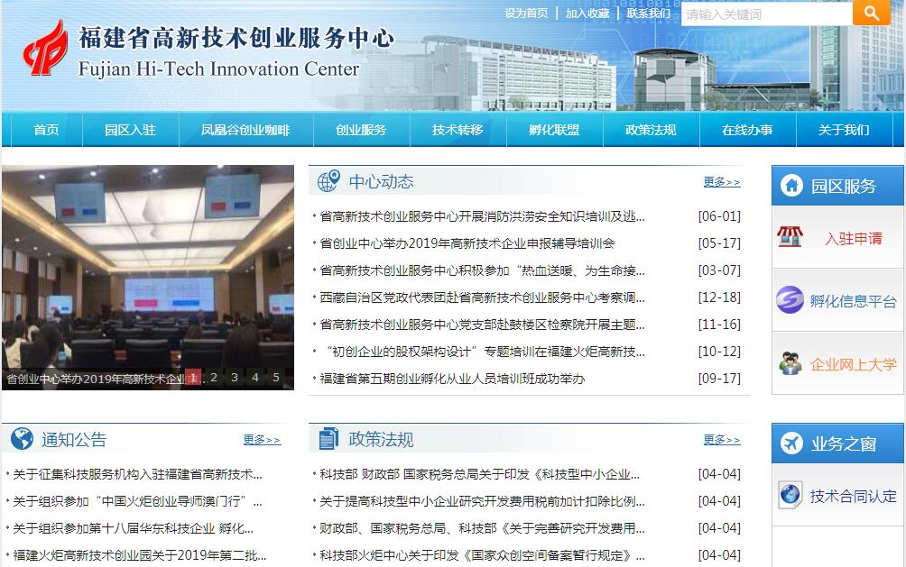 福建省高新技术创业服务中心是福建省科技厅直属事业单位,是以促进科技成果转化、培育高新技术企业和企业家为宗旨的科技创业服务机构。主要以福建省科技型中小企业为服务对象,为孵化企业提供孵化场地、资金筹措、人才培育和指导性管理等综合服务,以降低企业的创业风险和创业成本,提高企业的成活率和成功率,为社会培养成功的科技企业和企业家。2005年被科技部批准认定为国家高新技术创业中心;2006、2007年连续两年被科技部批准认定为国家科技型中小企业技术创新基金创业项目依托机构。福建省高新技术产权交易所在福建省科技厅的支持下,由福建省高新技术创业中心投入主导资金,并吸引社会资金,组建了福建省高新技术产权交易所(简称福建高交所)。福建高交所是福建省内目前唯一集科技企业孵化器、科技成果转化、风险投资与技术产权交易于一体的综合型技术产权交易所,面向国内外资产经营机构、投资机构,以科技项目及科技型成长企业的产权为主要交易对象,以技术产权交易及相关专业服务为手段,集成福建省内外科技资源,构建项目库、专家库和资金库,为科技成果转化、项目融资、企业上市提供平台。福建火炬高新技术创业园是福建省高新技术创业中心投资建设的孵化基地,位于国家级高新区内,紧邻福州大学校区,为我省重大科技基础设施建设项目。该孵化基地建筑面积27000平方米,孵化面积19000平方米,园区设有多功能报告厅、培训教室、中小会议室、产品展示厅、健身房、乒乓球室、餐厅、商务休闲区等共享服务设施。