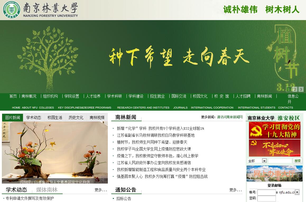 南京林业大学坐落于风景秀丽的紫金山麓、碧波荡漾的玄武湖畔,是中央与地方共建的省属重点高校,于2017年入选国家“双一流”建设高校名单。学校前身为中央大学(创建于1902年)森林系和金陵大学(创建于1910年)森林系,1952年合并组建的南京林学院,是当时全国仅有的三所高等林业院校之一。1955年华中农学院林学系(武汉大学、南昌大学和湖北农学院森林系合并组成)并入,1972年更名为南京林产工业学院,1983年恢复南京林学院名称,1985年更名为南京林业大学。南京林业大学作为一所以林科为特色,以资源、生态和环境类学科为优势的多科性大学,在百余年发展历程中,坚持全面贯彻党的教育方针,把提高教学质量和德育教育放在首要位置,紧紧围绕培养社会主义建设者和接班人这一根本任务,为实现“黄河流碧水、赤地变青山”的宏伟目标,不断深化教育教学改革,继承发扬了艰苦创业的光荣传统,形成了“团结、朴实、勤奋、进取”的校风和“诚朴雄伟,树木树人”的校训。毕业生遍布全国各地,深受用人单位欢迎。学校主动适应社会和经济发展需要,不断调整优化学院专业结构。现设有林学院、材料科学与工程学院、化学工程学院、机械电子工程学院、土木工程学院、经济管理学院、人文社会科学学院、信息科学技术学院、风景园林学院、理学院、外国语学院、艺术设计学院、家居与工业设计学院、轻工与食品学院、汽车与交通工程学院、生物与环境学院、研究生院、继续教育学院、应用技术学院、国际教育学院、公有民办南方学院、马克思主义学院、体育教育部等22个学院(部)。学校学术实力雄厚,学科门类齐全,办学特色鲜明。现有8个博士后流动站、8个博士学位授权一级学科、40个博士学位授权二级学科、25个硕士学位授权一级学科、101个硕士学位授权二级学科和28个硕士专业学位授权类别或领域。现有林业工程、生态学2个一级学科国家重点学科,林木遗传育种、林产化学加工工程、木材科学与技术、森林保护学等4个二级学科国家重点学科,1个江苏省一级学科国家重点学科培育点,4个江苏高校优势学科,7个一级学科国家林业局重点学科,2个二级学科国家林业局重点(培育)学科,4个一级学科江苏省重点学科,2个一级学科江苏省重点(培育)学科。 国家重点学科数量位列江苏省属高校前列。在全国第四轮学科评估中,取得了两个“A+”、一个“A-”的好成绩,得A学科数位列全国林业高校和江苏省属高校第一。学校面向全国招生,现有本科专业74个,其中,国家级特色专业建设点6个,省级品牌特色专业16个,江苏高校品牌专业4个。拥有国家级人才培养模式创新实验区1个,省级人才培养模式创新实验基地1个,国家级优秀教学团队1个,省级优秀教学团队2个,省级优秀科技创新团队4个。国家级精品开放课程4门,省级精品(优秀)课程及课程群30门,省级在线开放课程5门。学校现有国家级实验教学示范中心2个,省级实验教学示范中心及实践教育中心18个,国家级虚拟仿真中心2个,国家级大学生校外实践基地1个。“园林”和“林产化工”专业被列入教育部“十二五”专业综合改革试点专业,林学类等8个专业类和英语专业等23个专业列入江苏省“十二五”高等学校重点专业建设项目,林学类专业(林学、园林、森林保护)和林业工程类专业(林产化工、木材科学与工程、森林工程)入选教育部首批卓越农林人才教育培养计划改革试点项目。自1991年,荣获国家级教学成果一等奖1项、二等奖7项,省级教学成果特等奖2项、一等奖14项、二等奖20项。2010年有1篇博士论文获全国百篇优秀博士学位论文。2012年荣获“江苏省教学工作先进高校”荣誉称号,2016年荣获江苏省语言文字规范化示范学校。现有各类全日制在校学生3万余人,其中博士与硕士研究生、外国留学生6200余人。学校先后为国家培养了10万多名建设人才。南京林业大学是全国首批具有博士和硕士学位整体授予权的高校之一。学校拥有一支高素质的师资队伍,现有教职工2050余人,其中专任教师1280余人,博士生导师181人,具有高级职称700人。学校现有中国工程院院士2人,外聘院士8人,“长江学者奖励计划”特聘教授1人,国家杰出青年基金获得者1人,国家青年“千人计划”人选3人,国家百千万人才工程6人,国家“万人计划”领军人才4人,全国有突出贡献的中青年专家6人,享受国务院政府特殊津贴专家110余人;全国杰出专业技术人才1人,全国优秀科技工作者5人,科技部中青年科技创新领军人才5人,教育部“新世纪优秀人才计划”6人;国家千人计划“顶尖人才与创新团队”1个,“长江学者奖励计划”创新团队1个。有江苏省“333工程”第一层次首席科学家4人,省级教学名师3人,江苏特聘教授18人,省部级有突出贡献的中青年专家16人,省“333工程”二、三层次、“双创计划”、“青蓝工程”、“六大高峰”等各类省级人才计划300余人;江苏省科技创新团队及“青蓝工程”等省级创新团队12个。长期以来,学校充分发挥学科优势,坚持自主创新,积极推动产学研结合,在科学研究、科技创新、科技成果转化等方面取得了显著成绩。学校现有“机电产品包装生物质材料国家地方联合工程研究中心”国家级工程中心1个、“林木遗传与生物技术省部共建教育部重点实验室”、“江苏省速生木材及农作物秸秆材料工程研究中心”、“江苏
