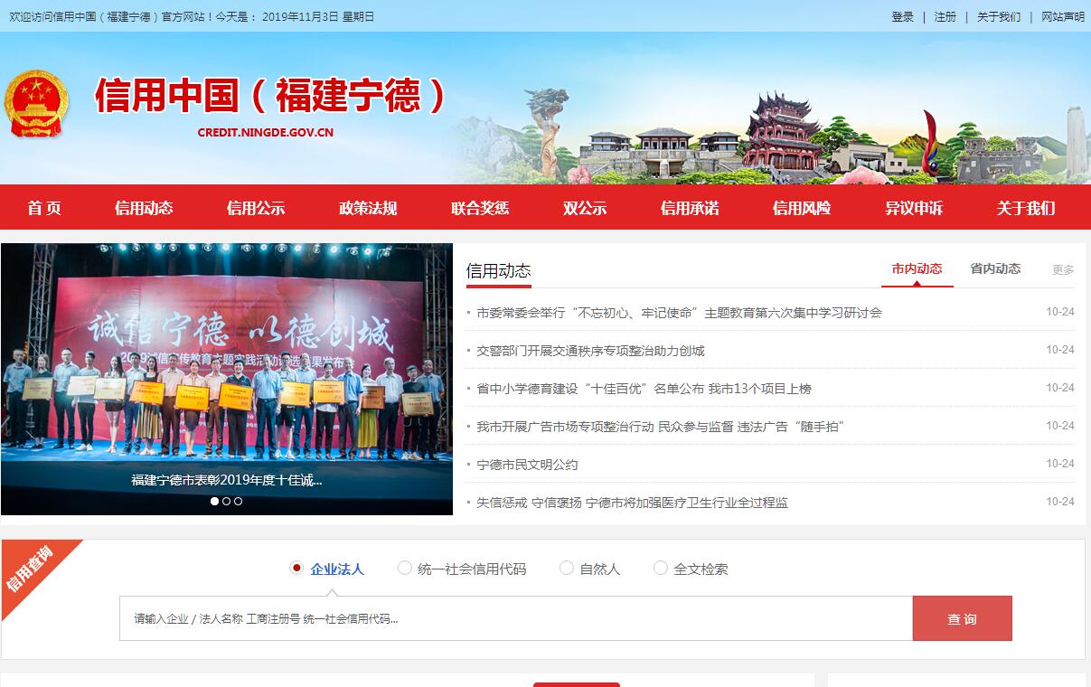 | 网站简介: “信用中国(福建宁德)”官方网站是“信用中国”官方网站的重要组成部分,是宁德市开展社会信用体系建设的唯一官方网站。既是展现我市信用建设成果的窗口,更是面向社会提供信用服务的名片,还肩负着弘扬诚信精神的使命。网站由宁德市社会信用体系建设领导小组办公室主办。 |