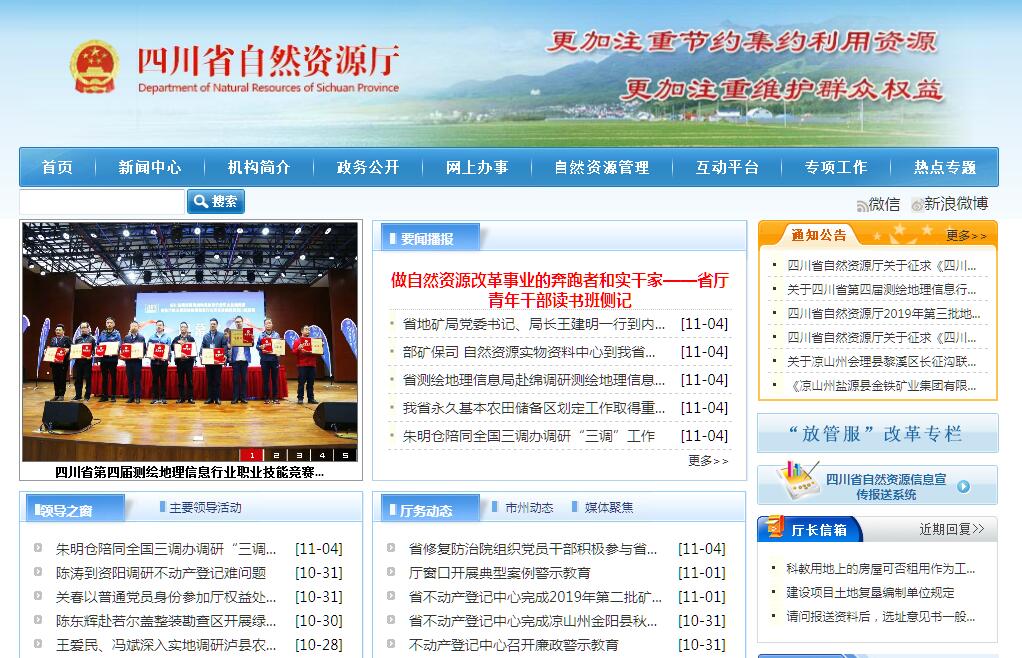 | 网站简介: 四川省自然资源厅,是2018年四川省机构改革新组建的单位。2018年11月6日上午,新组建的四川省自然资源厅召开干部大会,省人民政府副省长尧斯丹出席会议并讲话,省委组织部副部长陈冠松宣读省委、省人大常委会、省政府任免职通知。副省长尧斯丹和省自然资源厅党组书记、厅长孙建军为四川省自然资源厅揭牌。新组建的自然资源厅,在原国土资源厅基础上整合了省发改委的组织编制主体功能区的规划职责、住建厅的城乡规划管理职责、水利厅的水资源调查和确权登记管理职责、农业厅的草原资源调查和确权登记管理职责、林业厅的森林湿地等土地资源调查和确权登记管理职责。同时,按省机构改革方案要求,领导和管理新组建的省林业和草原局。 |