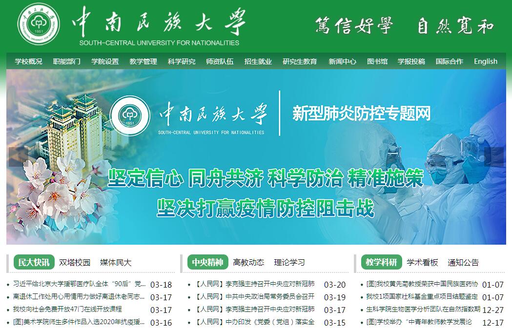 中南民族大学是直属于国家民族事务委员会的综合性普通高等院校,坐落于白云黄鹤的故乡——武汉南湖之滨。学校前身为中南民族学院,创建于1951年,2002年3月更名为中南民族大学。建校以来,学校始终坚持社会主义办学方向,贯彻落实党的教育方针和民族政策,始终坚持党的民族工作规律与高等教育规律相结合,民族高等教育的特殊性与普通高等教育的普遍性相结合,遵循高等教育的普遍规律,尊重民族高等教育的特殊性,努力探索办好民族院校的新路子,学校的各项事业获得了快速发展。学校占地1550余亩,校舍面积100万余平米,馆藏图书697余万册,拥有全国高校第一家民族学博物馆。校园内绿树成荫、花香四季,具有浓郁民族特色的现代建筑鳞次栉比,湖光山色与人文景观交相辉映,构成了教学、科研和生活的优美环境。学校现有56个民族的全日制博士、硕士、本科、预科等各类学生27000余人,面向全国招生,在山西、内蒙古、江苏、河南、湖北、湖南、广西、贵州、云南、西藏、甘肃、宁夏、新疆、河北、安徽、江西、重庆、四川和青海等省(区)进入本科一批招生,少数民族学生比例超过60%。现有教职工2114人,其中专任教师1375人。教师里有高级职称专业技术人员750余人,有国家杰出青年科学基金获得者和“973计划”首席科学家1人、国家级和省部级人才工程人选46人、享受国务院和湖北省政府特殊津贴专家48人、国家级和省部级突出贡献专家25人、楚天学者22人、二级教授22人,拥有博士学位教师比例达到50.91%,一支数量充足、结构优化、素质较高、发展良好的师资队伍正逐步形成。学校始终坚持“面向少数民族和民族地区,面向地方,面向全国,为少数民族和民族地区服务,为党和国家的民族工作服务,为国家战略需求服务”的办学宗旨,现有10大学科门类的84个本科专业;拥有民族学和中国语言文学2个一级学科博士学位授权点,有博士后科研流动站;拥有24个学术型一级学科硕士学位授权点,16个专业型硕士学位授权点,授权学科覆盖了除军事学之外的其他全部12个学科门类,包括哲学、经济学、法学、教育学、文学、历史学、理学、工学、农学、医学、管理学、艺术学等。学校现有省部级一级重点学科9个,一级重点建设学科2个,二级重点学科4个;有5个国家级特色专业,7个省级品牌专业,40门国家级、省级各类精品课程,13个国家级、省级实验教学示范中心,39个省部级科研机构(实验室、基地、中心),实验教学仪器设备总值3亿多元。学校入选湖北省“国内一流大学建设高校”,民族学、化学、药学3个学科入选湖北省“国内一流学科建设学科”。2008年学校成为“推荐优秀应届本科毕业生免试攻读硕士学位”授予权单位。“十二五”期间,学校承担国家级项目316项,其中国家自科基金169项,国家社科基金129项;承担横向课题379项,与企业签订技术合同244项。出版学术专著309部,获授权专利122项。发表各类论文5613篇,其中CSSCI论文1143篇(其中权威期刊论文90篇),SCI论文1041篇,EI论文1,112篇;获省部级以上奖励144项;2项研究成果获党和国家领导人批示,26项调研报告被政府采纳。学校高度重视学生全面素质的提升和创新能力的培养,以“笃信、好学、自然、宽和”的校训激励各族学生奋发图强、全面发展。60余年来,学校已累计培养了13万余名各民族干部和专业技术人才。他们遍布祖国的四面八方,为维护民族团结与稳定,促进少数民族和民族地区的经济与社会发展做出了积极的贡献。随着教育改革与开放的不断深入,学校加快了对外交流、开放办学的步伐。目前,学校已与美国、英国、法国、乌克兰、澳大利亚、加拿大、俄罗斯、德国、日本、韩国、巴基斯坦、哈萨克斯坦、吉尔吉斯斯坦、泰国、老挝等数十个国家(地区)的50余所大学建立了校际交流与合作关系。2008年学校与美国威斯康星州立大学联合创办了“孔子学院”。学校定期选派优秀的本科生和研究生到国外访问、交流、学习,选派教师出国讲学、进修和从事科学研究,也聘请外国专家来校执教和开展合作,扩大了学校在国际上的学术影响。近年来,学校事业发展提质增速。2001年,在教育部本科教学工作随机性水平评估中获得优秀;2002年更名为中南民族大学;2003年9月,成为国家民委与武汉市人民政府共建院校;2005年5月学校被国务院授予“全国民族团结进步模范集体”荣誉称号;2006年,在教育部本科教学工作水平评估中再度荣获优秀;2008年,学校获“国家民委文明单位”称号;2009年获全国普通高等学校毕业生就业工作先进集体称号;2010年获教育部高校校园文化建设优秀成果三等奖;2015年,成为国家民委、教育部、湖北省共建院校;2015年,化学学科进入全球ESI排名前1%;2017年,民族学在第四轮学科评估中排名全国第三;2001年至今连续16年8次被评为湖北省最佳文明单位(校园)。在新的历史起点上,学校坚持以习近平新时代中国特色社会主义思想为指导,深入学习贯彻党的十九大精神,贯彻新发展理念,着眼国家战略需求和民族工作重点,围绕立德树人根本任务,践行办学宗旨,不忘初心,牢记使命,奋发有为,勇于创新,大力实施“质量立校、学科兴校、人才强校、特色荣校”战略,努力建设特色鲜明、国内一流、国际知名的高水平民族大学,培养担当“中华民族一家亲,同心共筑中国梦”大任的时代新人。