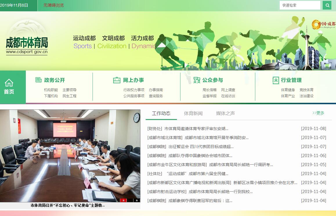 | 网站简介: 成都市体育局主要职责:(一)贯彻执行国家、省、市有关体育工作的方针政策和法律、法规、规章,起草有关地方性法规和规章草案,拟订全市体育事业发展规划并组织实施。(二)负责推动多元化体育服务体系建设,推进体育公共服务和体育体制改革。(三)负责组织实施全民健身计划,组织开展群众性体育活动;监督实施国家体育锻炼标准,组织开展国民体质监测。(四)制定全市竞技体育发展规划和运动项目布局规划,指导体育运动队伍的建设和业余训练工作。(五)制定全市体育竞赛规划,负责大型体育赛事的管理和协调;开展国内外体育合作与交流,组织参加和承办国内外体育竞赛活动。(六)拟订全市体育产业政策;参与拟订体育设施布局规划,指导全市体育产业发展和重点体育设施建设,监督体育设施的使用和管理。(七)统筹规划全市青少年体育发展,指导和推进青少年体育工作。(八)承办市政府公布的有关行政审批事项。(九)承办市委、市政府交办的其他事项。 |