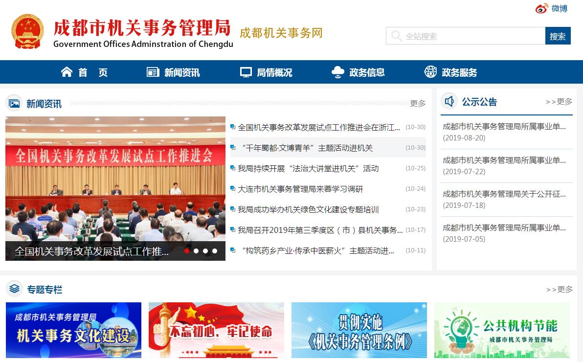 成都市机关事务管理局,为市政府工作部门。其主要职责是:一、贯彻执行国家有关机关事务工作的方针政策,拟订全市机关事务工作的政策、规划和规章制度并组织实施。二、负责全市公共机构节能监督管理工作;会同有关部门制定全市公共机构节能规划、制度并组织实施;组织开展能耗统计、监测和评价考核工作;推动全市公共机构节能工作。三、制定市级机关办公用房使用管理办法并组织实施;承担市级机关用地管理工作;负责市级机关办公区建设的规划编制、项目审核、建设监管;负责市级机关和参照公务员法管理事业单位办公用房的使用调配、维修审批等工作;负责市级机关和事业单位住房制度改革工作。四、拟订全市机关和事业单位车辆使用管理办法并组织实施;负责全市重大政务活动的车辆保障服务工作;指导市级机关和事业单位车辆安全管理工作。五、拟订市级机关后勤体制改革政策、制度并监督实施;指导市级机关和区(市)县机关事务工作。六、负责市级机关集中办公区的安全保卫、综合秩序及其后勤服务管理工作;指导和协调市级机关社会治安综合治理工作。七、具体负责市级行政事业单位国有资产管理工作,制定相关管理办法并组织实施,承担资产处置、划转和调配等审核审批工作;承担资产清查统计、公共资源进场交易等牵头工作任务;负责市级机关公物仓管理;负责市级机关后勤服务经费管理。八、负责省外市、县级政府及其职能部门驻成都办事机构管理协调工作和党建工作,协助开展党风廉政建设;负责省内外各级政府及其职能部门驻成都办事机构备案、年审和注销登记工作。九、承办市委、市政府交办的其他事项。