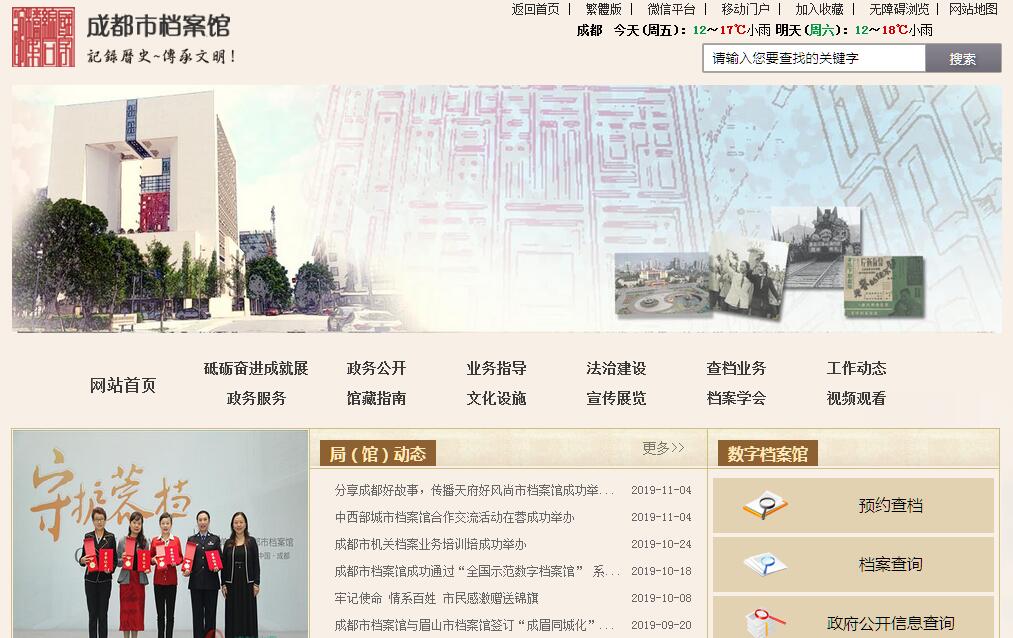 | 网站简介: 成都市档案馆成立于1963年,成都市档案局成立于1981年,是国家一级综合档案馆,成都市爱国主义教育基地,成都市政府公开信息服务中心。成都市档案局(馆)实行一套机构,两块牌子,履行全市档案事业的行政管理和市直机关、团体、事业单位档案的保管利用两种职能,为市政府直属事业单位。其主要职责:一、贯彻执行《中华人民共和国档案法》以及党和国家有关档案工作的方针、政策;起草全市档案工作的地方性法规和规章草案,制定全市档案工作规范性文件及全市档案事业发展规划并负责组织实施。二、监督、检查档案法律、法规的贯彻执行,依法查处档案违法行为。三、组织、指导全市档案科研和档案宣传工作,逐步实现档案管理的标准化、规范化和现代化。四、负责全市档案工作人员业务培训,指导档案工作人员队伍建设。五、接收、征集和集中统一管理市级党政机关、群众团体、市直属单位的重要档案资料和有关历史档案,确保档案资料的安全。六、积极开发、充分利用档案信息资源;负责全市档案资料目录中心建设工作,建立全市档案资料信息网络。七、承办市政府交办的其他事项。 |