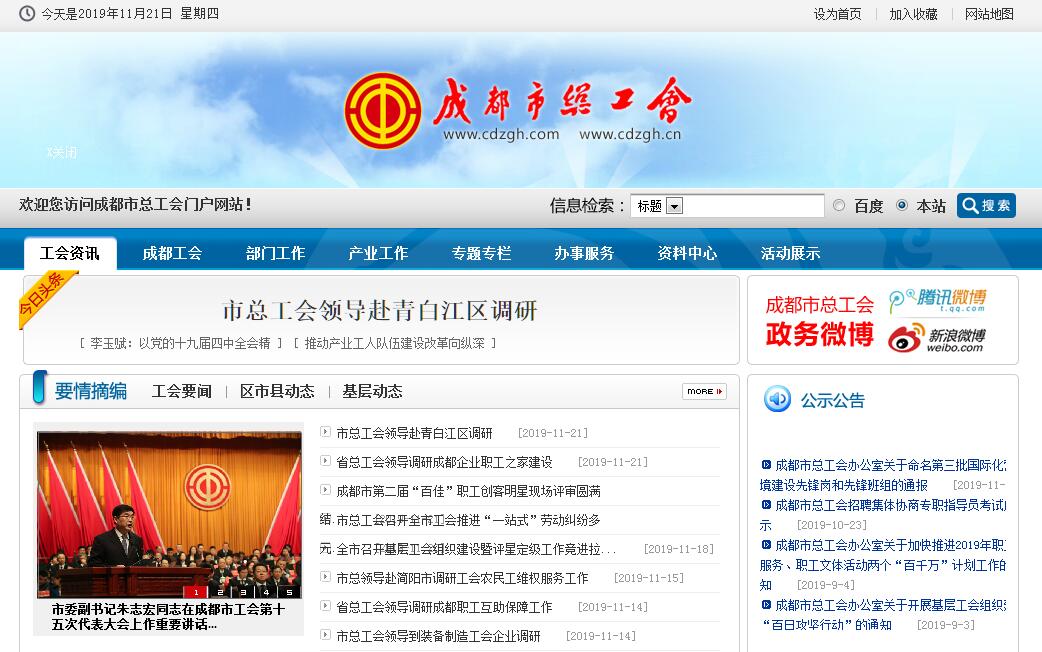成都市总工会是成都市各级工会的领导机关,受中共成都市委和四川省总工会的领导。目前成都市总工会第十四届委员会由90名委员组成,十四届委员会常务委员会由20人组成,其中主席1人、常务副主席1人、副主席5人、常务委员15人。成都市总工会现有6个驻会产业工委(会),1个外产业工委,19个区(市)县总工会和2个工会办事处。机关内设部(处)室15个,直属事业单位5个。全市共有基层工会委员会2.83万个,会员326.2万人,其中农民工会员121.37万人。初步形成了与城乡统筹发展相适应的工会组织新体系、社会化维权新格局和工作新机制,全市工会工作迈上了新台阶。2009年5月,成都市总工会被中华全国总工会授予全国“五一劳动奖状”称号。2010年被全总授予“全国推动厂务公开民主管理工作”先进单位称号;被评为全国“工会系统‘五五普法’先进集体”。2011年被全总评为“‘十一五’时期社会主义劳动竞赛先进组织单位”;被全总授予职工书屋建设工作先进单位。2012年被国务院授予全国就业创业先进集体荣誉称号;被全总评为全国推进劳务派遣企业建会、劳务派遣工入会集中行动先进单位。2013年被全总、科技部等部门授予第四届全国职工职业技能大赛特殊贡献奖;被全国厂务公开协调小组评为全国推动厂务公开民主管理工作先进单位。2015年召开的成都市工会第十四次代表大会,确定了“以改革创新为动力,全力提升职工素质,全面维护职工利益,加快构建服务体系,坚定夯实基层基础,着力激发组织活力,努力建设全国一流的学习型、创新型、服务型、开放型工会”的奋斗目标。1926年10月10日,在成都劳工联合会的基础上筹建了成都市工会,成为中国共产党领导下的全市性统一的工人革命组织,得到中华全国总工会的承认和支持。1951年6月举行了成都市首届工会会员代表大会,正式成立了成都市总工会。1978年中共十一届三中全会以后,我市工会工作进入了新的发展阶段。特别是进入八十年代以后,在市委和上级工会领导下,全市各级工会认真贯彻党的全心全意依靠工人阶级的指导思想,充分发挥党联系职工群众的桥梁纽带作用,紧紧围绕党和政府工作的大局,突出工会工作的特点和优势,全面履行"建设、维护、教育、参与"职能,为成都市的经济建设和社会发展做出了积极的贡献。成都市总工会的主要职责和工作任务:(一)根据党的各项方针政策,围绕全市工作的大局和工会工作的重点,研究和制定全市工运事业发展和工会工作的指导方针和任务,指导全市各级工会工作。(二)依照有关法律和工会章程,贯彻执行成都市工会代表大会决议和常委会议定事项,组织和指导各级工会认真履行各项社会职能;参与涉及本市职工切身利益的有关政策、制度的制定,参与相关立法工作。(三)开展与职工利益密切相关的各种政策措施的调查研究,反映职工队伍的动态和职工的愿望要求,并提出建议和意见;根据下级工会的要求,与相关方面协商解决有关问题;研究制定本市工会的各项组织制度和民主制度,监督检查《工会法》、《劳动法》、《中国工会章程》和《四川省〈工会法〉实施办法》的贯彻执行情况。(四)制定并落实全市工会组织建设的各项规划和制度,负责工会会员的会籍管理工作,指导和开展全市工会干部的教育培训工作;负责本市各区(市)县总工会、基层工会领导班子的协管工作;指导和推进全市新建企业工会组建工作。(五)动员、组织职工积极参与经济建设,指导和推动职工技术协会工作;研究本市职工在劳动中的安全健康和劳动保护的状况,监督检查职工劳动保护、安全生产法规的落实情况,参与职工重大伤亡事故和严重职业危害的调查处理;协助政府做好成都市劳动模范的推荐、评选工作,承担成都市各级劳动模范的管理工作。(六)负责职工代表大会制度、平等协商集体合同制度、职工董监事制度等各项制度的贯彻落实,大力实施送温暖工程和再就业工程,切实维护广大职工特别是困难职工群体的合法权益;指导基层工会建立和完善调整劳动关系、维护职工劳动权益的深化机制和监督制约机制,参与本市重大劳动争议案件的调查处理;负责指导开展全市工会的信访工作。(七)制定全市工会的宣传教育规划,在职工中开展有关法律和党的各项方针政策的宣传教育活动,指导各级工会开展职工教育、文化、体育活动;指导和开展建设"职工之家"活动;指导工会各级女职工委员会开展工作。(八)负责市总工会经费的收缴、上解和回拨工作,以及工会经费的管理、审查和审计工作;负责市总工会资产的管理工作;研究制定全市工会劳动福利事业的发展规划和规章制度,负责全市工会企事业发展的指导、协调和管理工作。(九)承担本市工会的国际联络工作和与港、台、澳工会的联络,发展与各国城市工会组织的友好关系。(十)承担市委和市政府以及上级工会交办的其它工作任务。