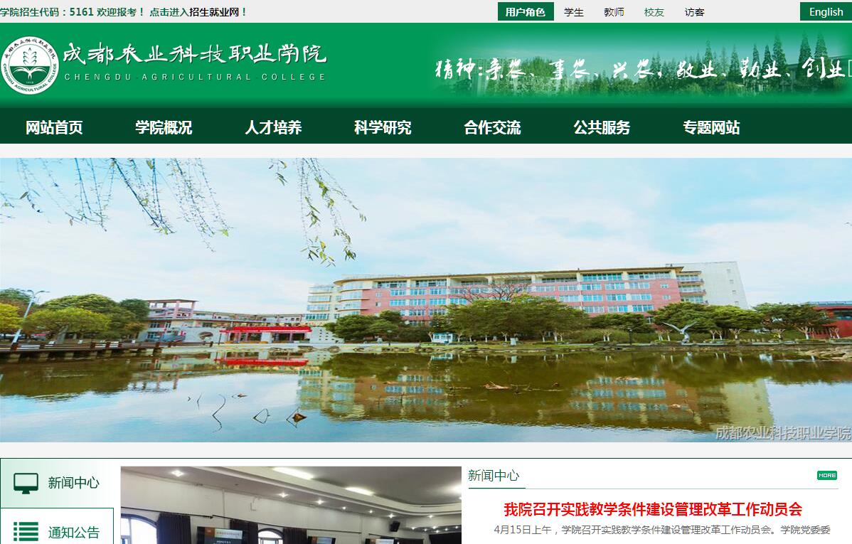 成都农业科技职业学院源自1958年成立的四川省温江农业学校,上世纪80年代在全国率先探索招生分配改革和以加强实践教学为突破口的教育教学改革,开创人才直通农村之路,而享誉全国。2002年升格为高等职业学院,是成都市人民政府主办的第一所高等职业学院,也是四川省唯一一所以农为主的高等职业院校。2005年,成都畜牧兽医学校和成都机电工程学校并入学院。在60年的办学历程中,学院始终坚守农业职业教育不动摇,坚持“为三农服务 为兴农育人”的办学传统,凝练出了“聚焦三农工作 服务乡村振兴”的办学理念和“亲农、事农、兴农,敬业、勤业、创业”的学院精神,确立了建设中国特色高水平农业高职学院的发展目标。近年来,学院获评“全国文明单位”、“全国农业科普教育基地”等数十项荣誉称号。现在学院是中国农学会教育专委会副理事长单位,是中国职教学会农业专委会副会长单位;是四川现代农业职教集团和成都现代农业职教集团牵头单位,是成都农业职业经理人学院和成都农业创新创业联盟牵头单位;是四川中职农林牧渔类专业教指委主任单位和四川省农林牧渔技能高考组考单位,是支撑四川省、成都市农业产业发展最重要的农村实用人才和技术技能型人才的输出基地。2017年底,学院成功入选四川省优质高等职业院校建设名单。近几年,社会对学院人才培养认可度较高,学院生源较好。学院年均招收普通高职专科学生3500余人,办学规模稳定在10000人左右。其中,涉农专业在校生规模5000余人,占了全省农业类高职在校生总数的55%以上。学院毕业生质量名列省内同类学校前列,年年就业率保持在98%以上,已连续多年被评为毕业生就业工作先进单位。学院注重“农”字文化传承,着力强化懂农业、爱农村、爱农民的高素质技术技能型人才培养。学院每年70%左右的毕业生留在成都就业,80%的农业龙头企业均有学院的毕业生,为成都农林渔牧等经济领域输送了大量技术人才。学院高度重视学生创新创业能力的培养,成立了农业创客学院,积极扶持学生创业团队和创业项目。学院是四川省省级众创空间,是四川省省级大学生创新创业孵化基地,是成都市现代农业创新创业先进单位,是联合国教科文组织创业教育联盟首批理事单位,是四川省第一批创新创业教育示范课立项建设单位和省创新创业教育综合改革试点高校。2018年1月,学院综改项目《涉农高职创新创业人才“1133”培养路径的探索与实践》荣获全国职业教育教学成果二等奖和四川省高等教育教学成果一等奖。据麦可思第三方调查,半年后我院毕业生自主创业平均比例为4.6%,高出全国平均水平2.5%,三年后毕业生自主创业比例达13.5%,高出全国平均水平5%。我院很多涉农专业学生回到家乡,扎根农村,自主创业,成为新型职业农民和农业企业家,带动了当地农户增收致富。比如打造全国最大百合花博览园和风情小镇的董钦金、打造家乡生态猪肉品牌在校期间身价就过千万的杨骐荣等就是其中突出的创业典型。学院现有教职工590人,其中具有博士、硕士学位的293人;取得高级技术职称的教师有160人,专业课教师中具有“双师”素质教师有203人。近两年,学院教师信息化教学水平大幅提升,参加全国、省、市职业院校信息化教学大赛,多次获得各类奖项。通过多年建设,尤其是省级示范院校建设和省级重点专业建设,学院办学特色和优势日益凸显,对全省农业职业教育引领示范作用不断增强。围绕现代农业产前、产中、产后的人才需求变化,学院立足一产、接二连三,除了现代农业、畜牧兽医、园林园艺三个农业类分院外,还设立了信息技术、城乡建设、机电技术和经济管理四个涉农类分院。目前学院有中央财政支持专业2个、省市级重点和特色专业11个,国家、省级和市级现代学徒制试点专业6个,形成了以省级重点为龙头、市级特色为支撑、农业全产业链集群化推进的发展格局。学院办学用地仅414亩,远远不能适应一所万人农业类高职院校人才培养需要。为了适应现代农业产业需求,增强学生实践动手能力的培养,学院确立了“小校区大园区”的发展思路。2017年年初,学院在相邻崇州开始建设一个近千亩,以现代农业示范、学生创业、师生实训为主的现代农业创新创业科技示范园区,目前园区建设顺利。学院组建了特种玉米研究所、都市现代农业研究中心、动物疫病检测中心、智能农业研究中心等作为产品研发和技术服务载体。在精准扶贫攻坚战中,通过示范推广优质杏、农凤鸡、大麦新品种、优质生态土鸡健康养殖技术等项目大力开展技术服务工作,建立了技术扶贫+项目扶贫+产业扶贫+智力扶贫的“四位一体”扶贫模式,现学院技术推广服务工作覆盖成都14个涉农区(市、县),并延伸到凉山州、雅安、广安、泸州等地。2017年选育的杏新品种“海棠红”通过了省农作物品种审定委员会审定;“农凤鸡健康养殖综合技术应用推广项目”荣获市“十佳”农业创新创业项目,“校地合作优质杏示范推广扶贫项目”入选教育部定点扶贫典型案例。