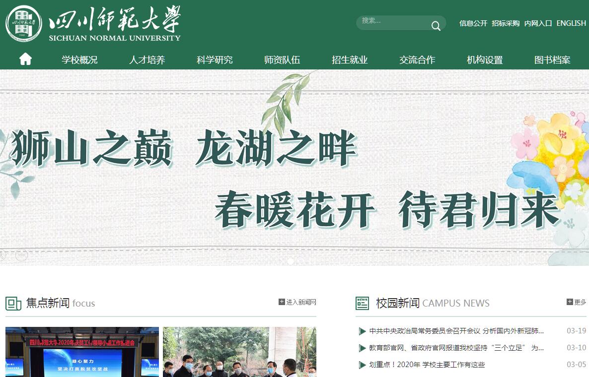 四川师范大学是四川省属重点大学、国家首批“中西部高校基础能力建设工程”实施高校,是四川省举办本科师范教育最早、师范类院校中办学历史最为悠久的大学。学校位于四川省省会——成都市,现有狮子山校区、成龙校区、东校区、广汉科教园区四个校区。学校创建于1946年,其诞生与东北大学有直接的历史渊源。抗战初期,东北大学内迁到四川省三台县办学。抗战胜利后,东北大学迁回沈阳,留川师生在原校址上创建了川北农工学院。1949年吸纳西山书院,更名为川北大学,1950年合并川北文学院,迁址四川省南充市。1952年,以川北大学为主体,合并川东教育学院(原乡村建设学院)、四川大学和华西大学的部分专业,组建四川师范学院,1956年迁到成都现址。1964年,原成都大学(现西南财经大学)数理化三系并入我校。1985年,经国家教育委员会批准,更名为四川师范大学。1999年,原煤炭部成都煤炭干部管理学院整体并入。学校是全国首批硕士授权单位,第十批博士授权单位,举办有文学、理学、工学、哲学、经济学、管理学、法学、历史学、教育学、艺术学、农学等十一个学科门类。建设有2个博士后流动站、3个博士学位授权一级学科、26个博士学位授权点、24个硕士学位授权一级学科、12个硕士专业学位授权类别、82个本科专业,其中省级重点学科建设项目4个、一级学科省级重点学科2个、二级学科省级重点学科17个;建设有教育部人文社科重点研究基地1个、教育部重点实验室1个、四川省重点实验室1个、四川省“2011”协同创新中心3个,四川省哲学社会科学重点研究基地4个,四川省高校重点实验室、四川省国别研究中心、四川省工程实验室10个,建有四川省省级大学科技园。建校以来,学校先后涌现出了以著名墨学家伍非百、我国社会学和民俗学的创始人之一李安宅、我国教育心理学的创始人之一刘绍禹、楚辞学专家汤炳正、文献学专家屈守元、训诂学专家刘君惠、凝聚态物理学专家赵敏光、拓扑学专家刘旺金、非线性分析专家丁协平为代表的一批知名专家。学校教师先后获评“国家有突出贡献的中青年专家”7人,“国家百千万人才工程一二层次人选”1人,“国家万人计划领军人才”1人,“国家级教学名师”1人,教育部“新世纪优秀人才支持计划”人选6人,享受“国务院政府特殊津贴”专家51人;全国优秀教师、全国师德标兵、全国模范教师、全国五一劳动奖章获得者、全国教育系统先进工作者等共17人;“四川省有突出贡献的优秀专家”25人,“四川省千人计划”4人,“四川省学术和技术带头人及后备人选”94人,“四川省教学名师”12人,四川省优秀教师、四川省五一劳动奖章获得者、四川省师德标兵等共14人;建设有国家级本科教学团队1个,省级本科教学团队7个,四川省高水平社科研究团队2个。学校建有国家级大学生文化素质教育基地,是全国深化创新创业教育改革示范校和国家级大学生创新创业训练计划实施高校,创办有1所具有33年历史的“校中校”——四川师范大学美育学校。学校建有“质量工程”国家级项目68项、省级项目280项,其中,国家级卓越教师培养计划项目3项,国家级特色专业12个,国家级人才培养模式创新实验区、国家级实验教学示范中心、国家级教学团队、国家级大学生校外实践教育基地各1个,国家级精品课程、双语教学示范课程、精品视频开放课程、精品资源共享课程15门,“十一五”“十二五”国家级规划教材19部,学生承担国家级大学生创新创业训练项目326项,学校获近两届(2009、2014年)国家级教学成果二等奖6项、四川省教学成果奖59项(其中一等奖23项)。办学71年来,培养了以中国工程院院士李言荣(79级本科生)、中国科学院院士唐勇(82级本科生)为代表的30余万名各类毕业生,他们在自己的岗位上为国家建设做出了应有贡献。“十二五”以来,学校共承担各类科研项目2300余项。其中,科技部科技支撑项目3项;国家自然科学基金、国家社会科学基金(含重大、重点项目)项目216项;省部级项目380余项。实际到校科研经费1.52亿元,高级别论文发表数量739篇,授权发明专利67项,实施科研成果转化项目500余项。2017年,学校国家社科基金年度项目立项数居全国高校59位、国家艺术基金立项数居全国高校11位、国家社科基金后期项目立项居全国高校5位。学校是四川省高校对外交流中心之一和国家教育部批准的具有招收华侨、港澳地区及台湾省学生资格和接收澳门地区保送生的高等院校,已与25个国家和地区的110所院校和教育科研机构建立了广泛的学术交流和人才培养关系,培养各类层次的境外留学生,并开展各类层次、不同国别的中外联合培养项目;在韩国延世大学、巴基斯坦卡拉奇大学合作建立了2所孔子学院,与巴基斯坦佩德罗中学共建孔子学堂。建有日本研究中心、韩国研究中心、中俄文化交流中心、中法文化交流中心,与韩国延世大学合办“成都世宗学堂”。学校是“国务院民族团结先进集体”,长期发挥人才和科技优势,支持地方经济社会尤其是教育事业发展,设有四川省高校师资培训中心、四川省高校干部培训中心、教育部全国高校教师网络培训四川省分中心、四川省教师资格认定指导中心、四川省教育厅四川师范大学基础教育课程研究中心、四川省教师继续教育四川师范大学培训中心、四川煤矿安全技术培训中心等省