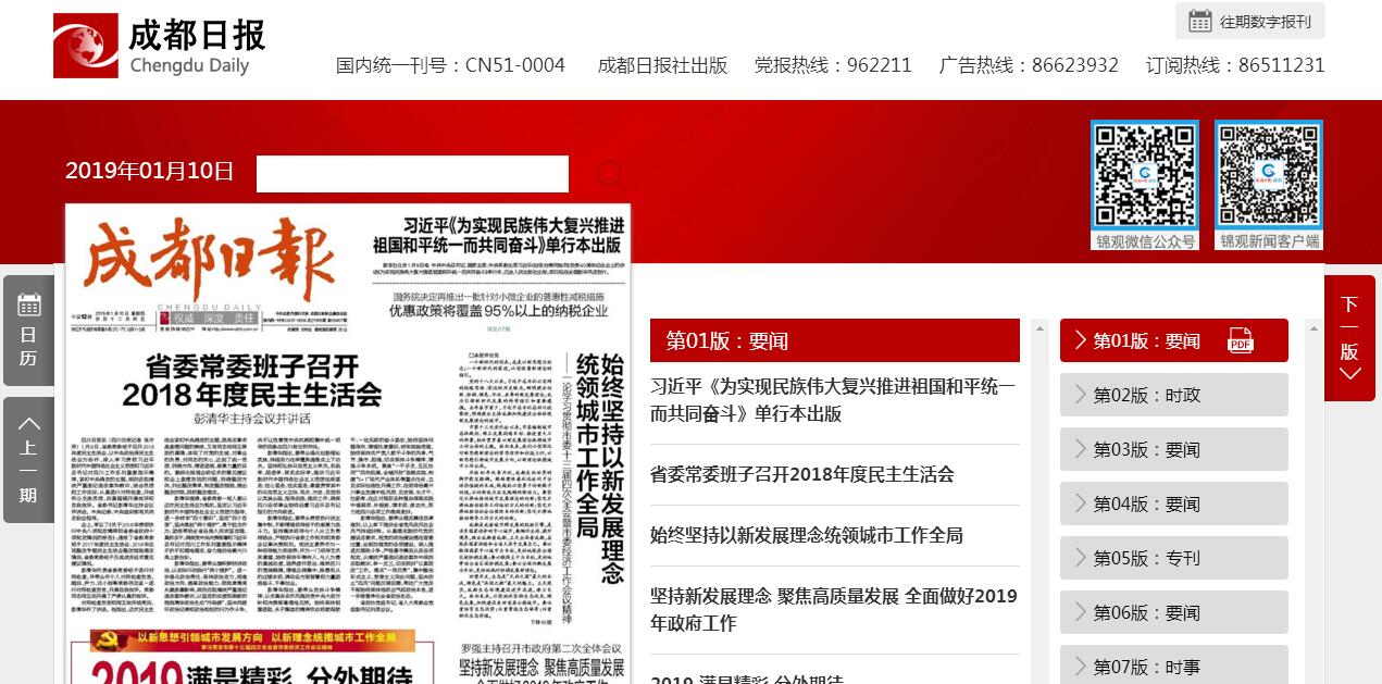 | 网站简介: 《成都日报》国内统一刊号 CN51-0004,现日出对开16版,日均发行20万份,日均零售量5万份。《成都日报》是中共成都市委机关报,成立于1956年5月1日,1961年更名为《成都晚报》,2001年7月1日,经国家新闻出版总署批准,再次更名为《成都日报》,一张经历了45载风雨历程的机关报从此开始了新型城市党报的成长史。《成都日报》作为党和人民的喉舌桥梁,出刊以来,始终秉承“创造全新新闻价值”的办报理念,努力致力于传播党和人民的声音,在全面、深入、准确、及时地宣传中央、省市委的大政方针、政策法规的同时,积极关注着国内外的风云变幻、新闻事件,关注着成都城市的发展变迁,记录和传递人们对各种发展变迁、新闻事件的感知,鞭挞社会丑恶,弘扬正义正气,服务民生大众,与人民群众同呼吸、共命运,同甘苦、共忧乐。《成都日报》作为读者喜爱、市民信任的权威媒体,得到了众多优秀企业的充分认同,成为了商家进行形象宣传、商务交流的最佳展示平台之一。 |